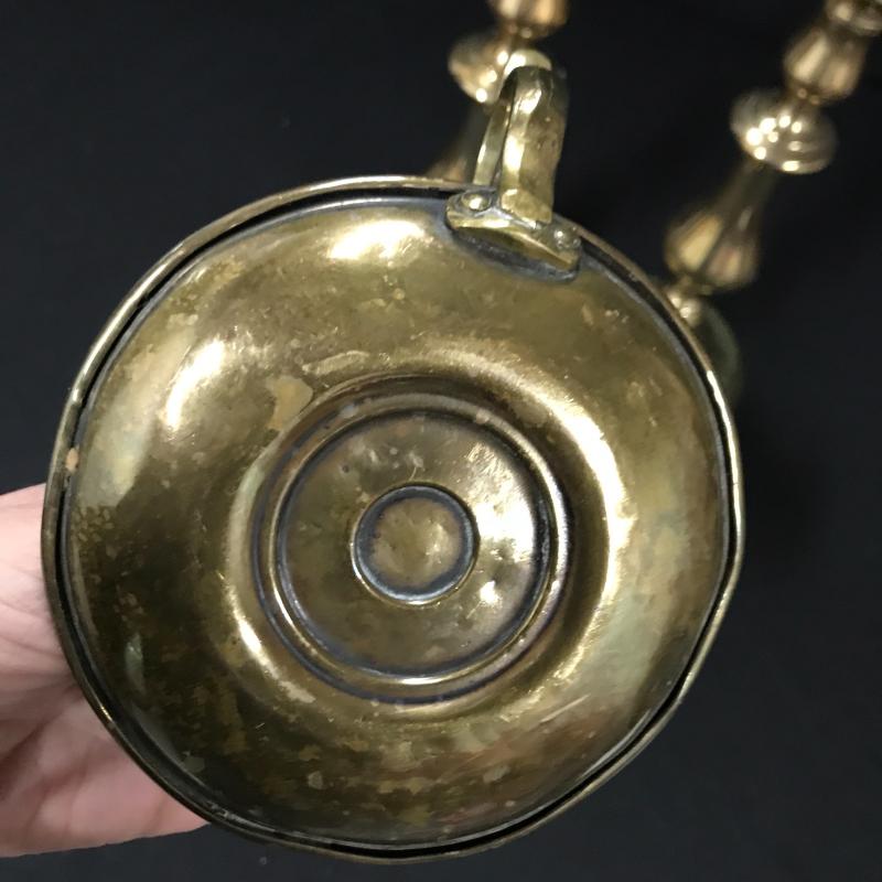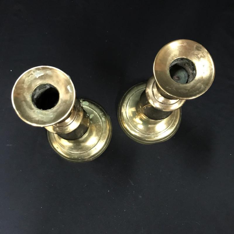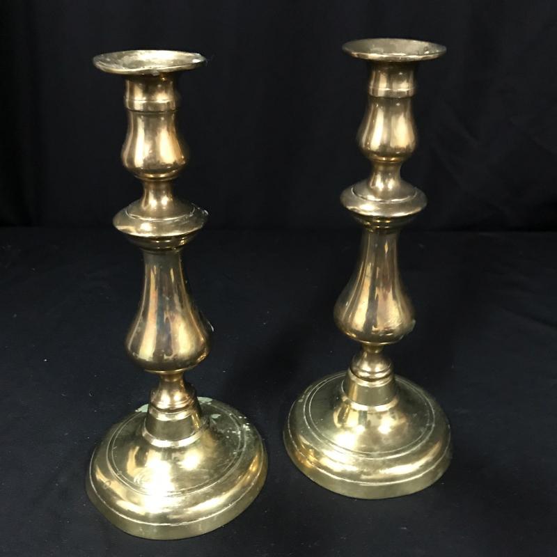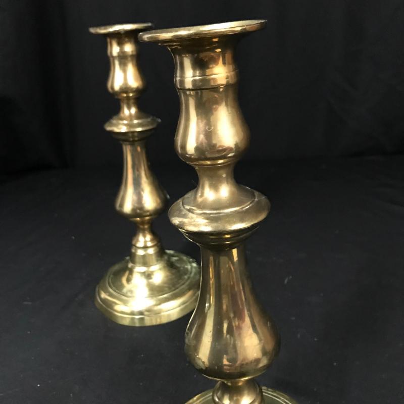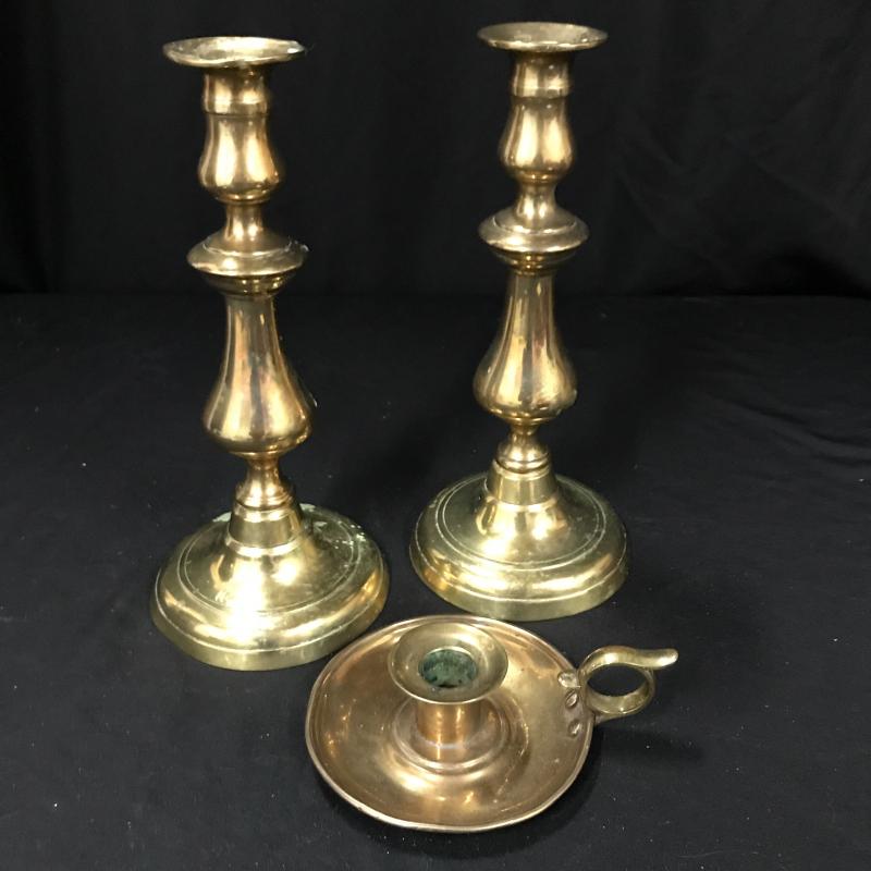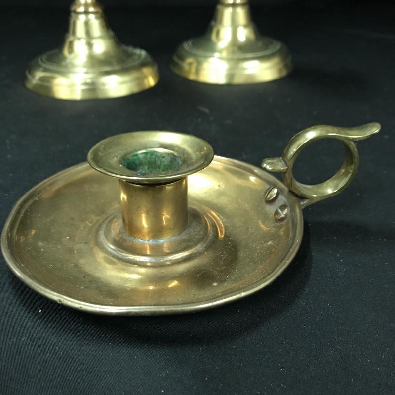 Nice brass pieces in excellent condition. Have a little old candle residue. Pair of table top candle holders is 5”d and 10.5”tall. Small hand held candle holder is 6”x5”. Shipping or local pick up in Asheville