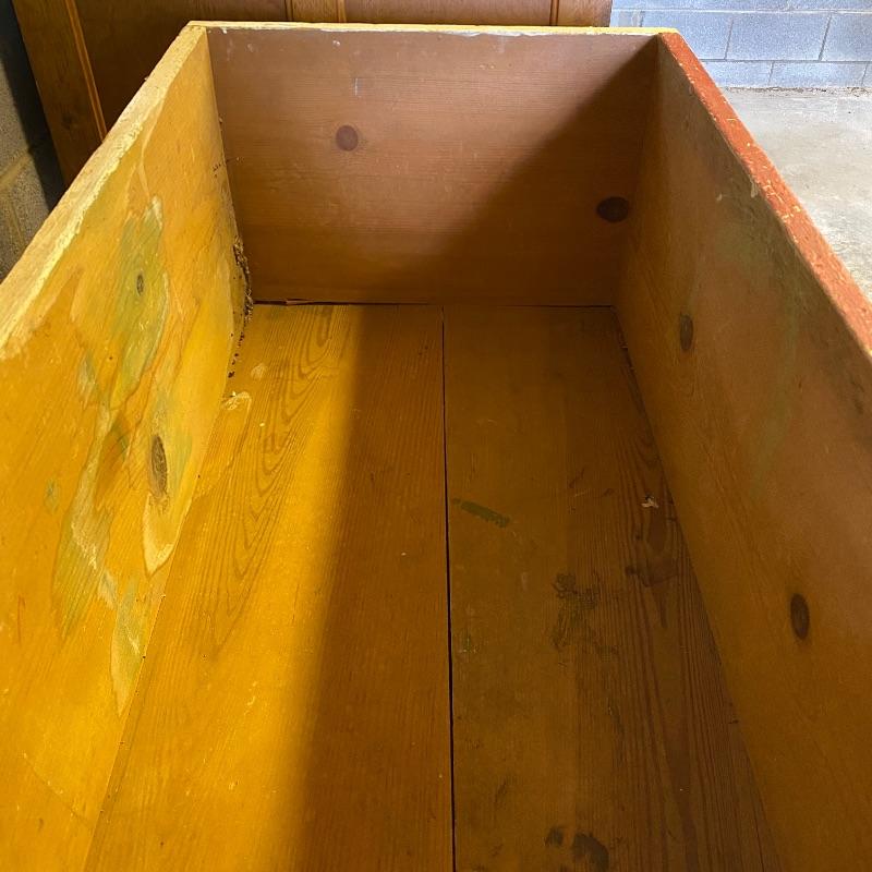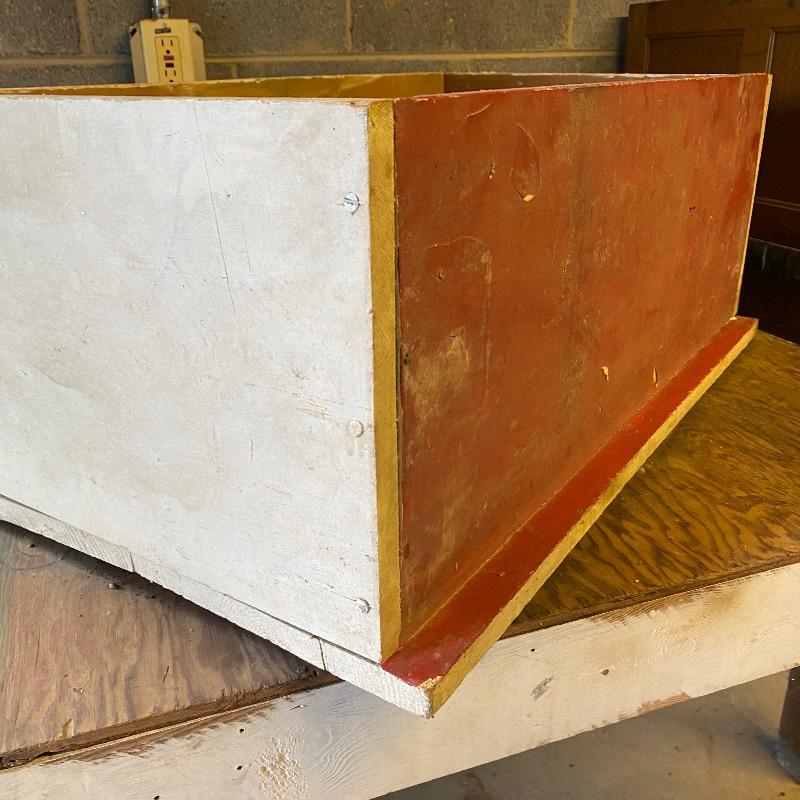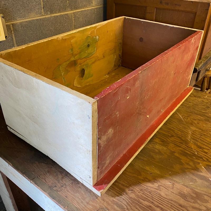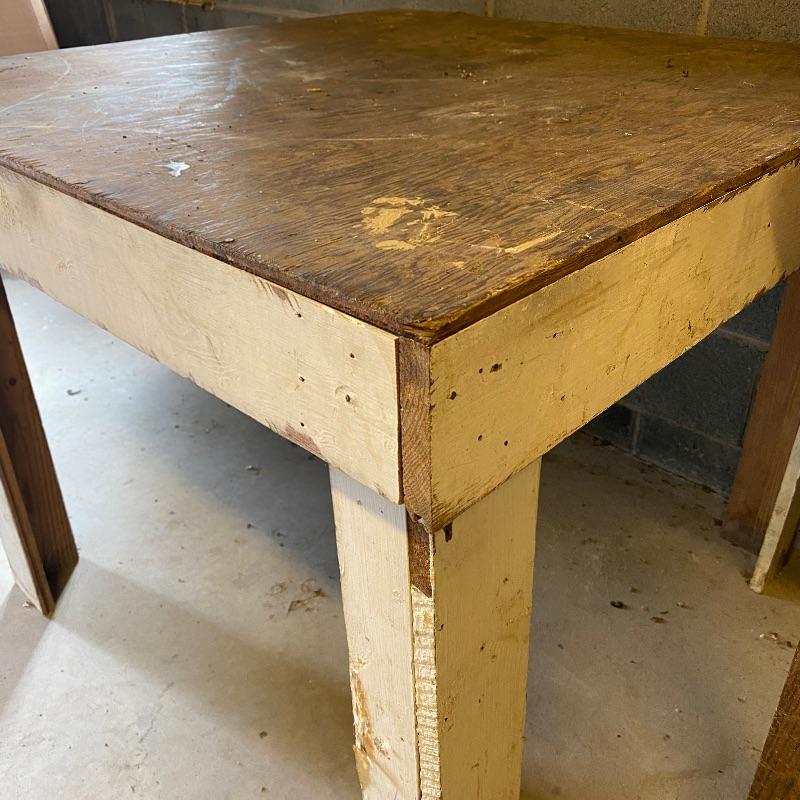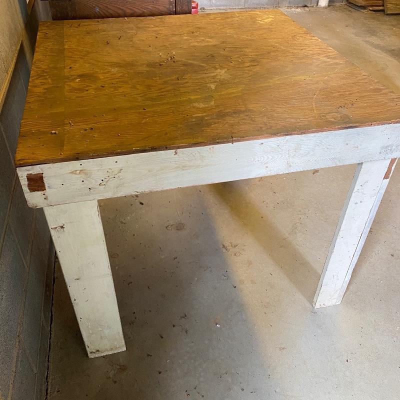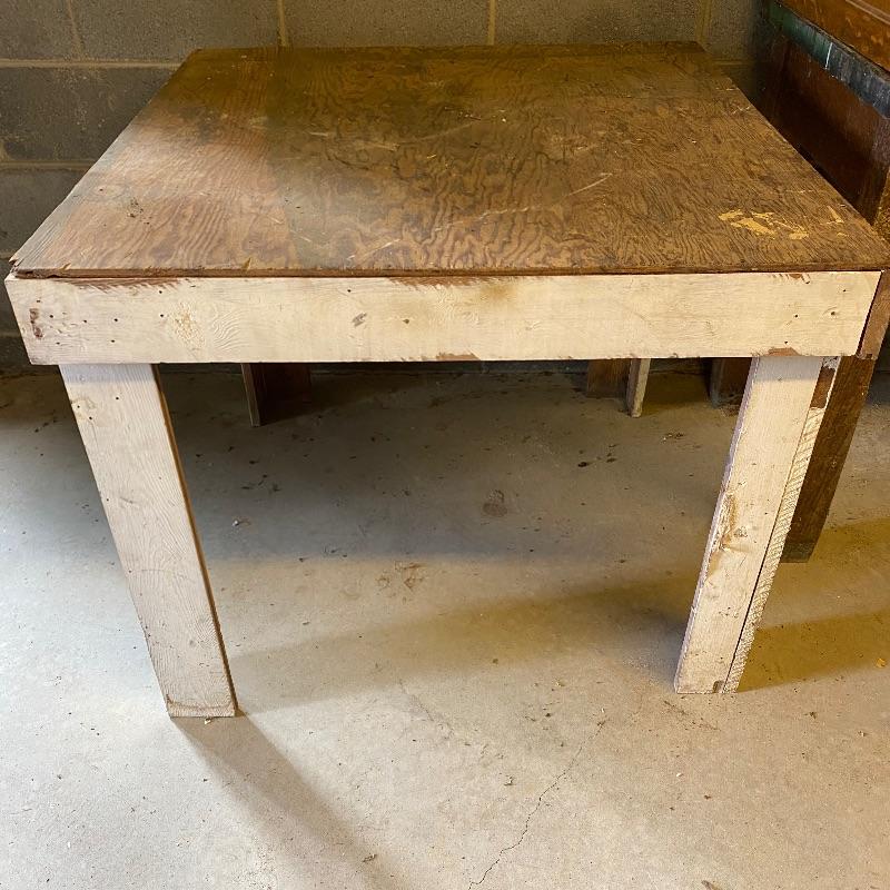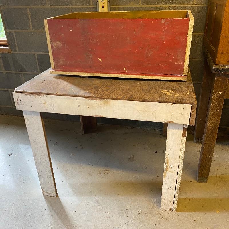 Nice square wooden work table and solid wood storage box. Super handy lot to use for whatever you need. Both have some white paint on them while the box has one side painted red. The table legs could possibly use some reinforcement if you are going to use for something heavy. Table has a plywood surface and solid wood legs and measures 37” square top by 30” high. Box measures appx 32” x 19” x 12”.