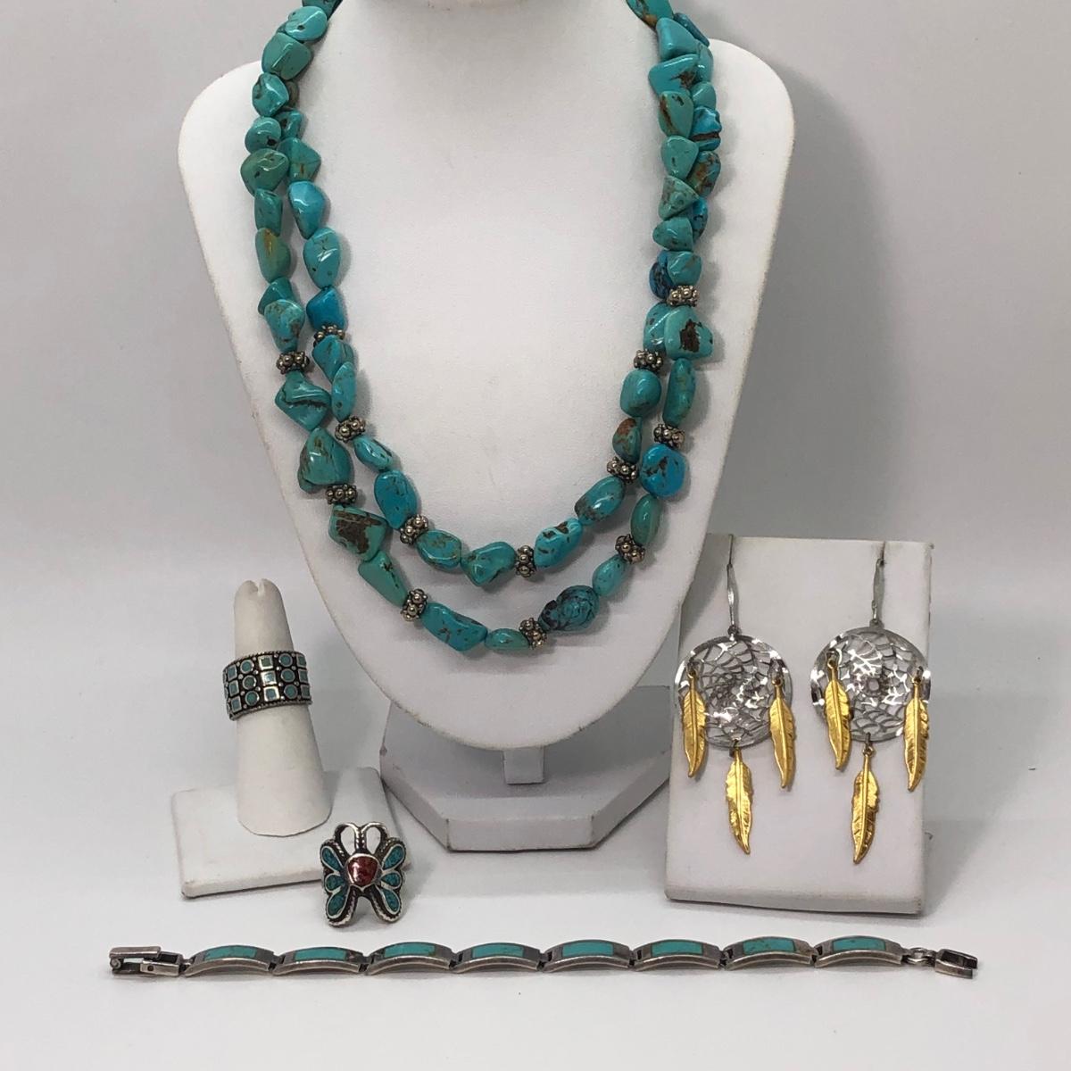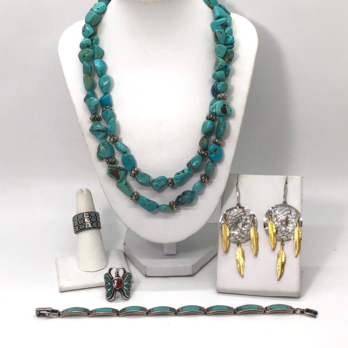 LOT 239M: Turquoise Necklace (16"), Sterling Ring (Size 6), 925 Bracelet (7"), Dream Catcher Earrings & Butterfly Ring