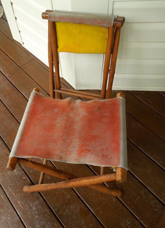 Vintage midcentury folding camp stools with canvas seat or use as a foot ottoman. Manufactured by "Gold Medal" with orignal decal label on both chairs. Seat fabric is aged, fragile, dirty and delicate. Fabric red on one side and yellow on reverse. Wood has aged to a nice patina and construction is solid.