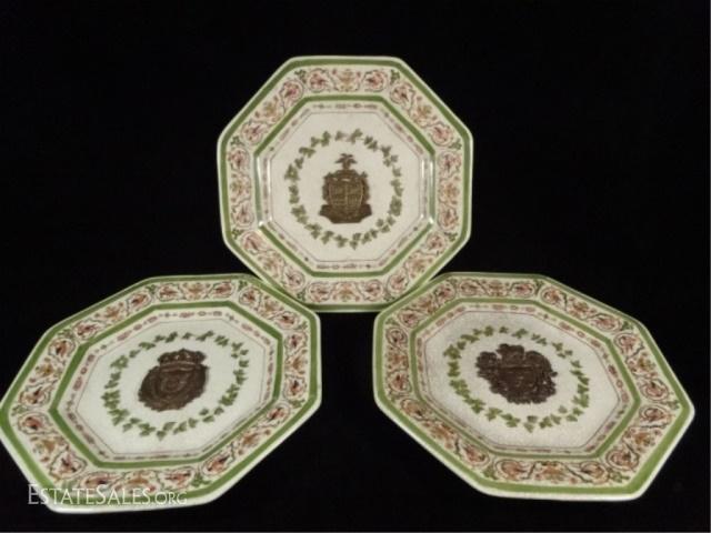 LOT 23C: 3 PC PORCELAIN PLATES WITH BRONZE APPLIQUES, HEXAGONAL, DECORATIVE, APPROX 10 5/8"