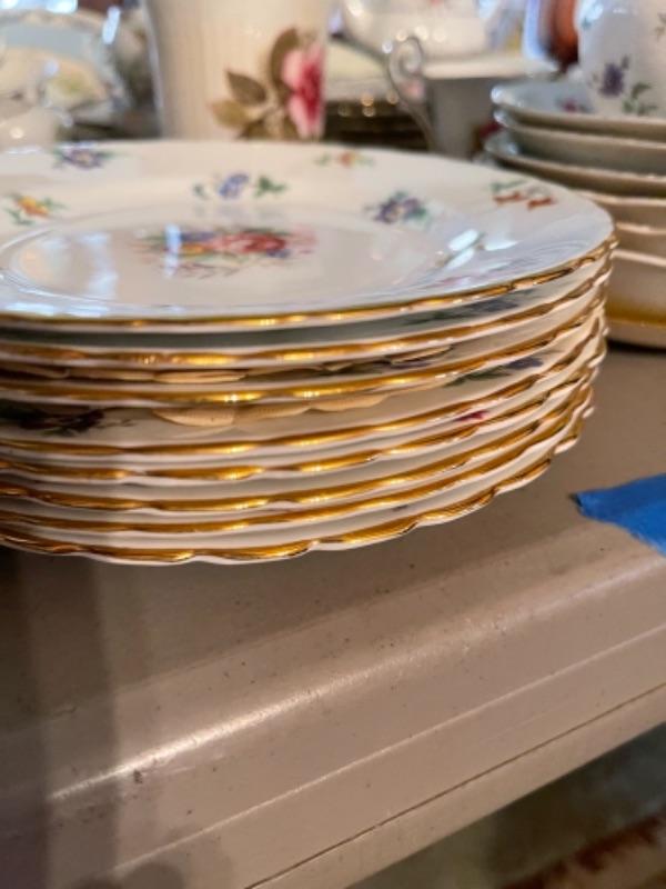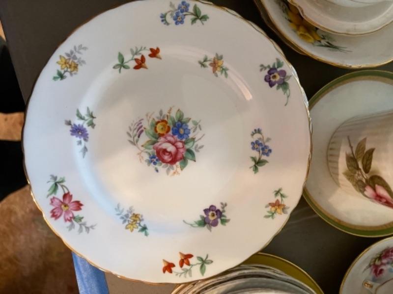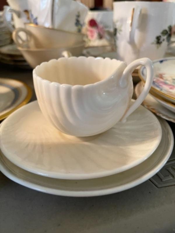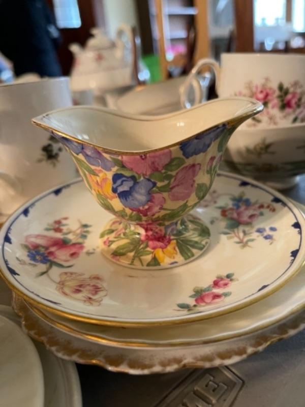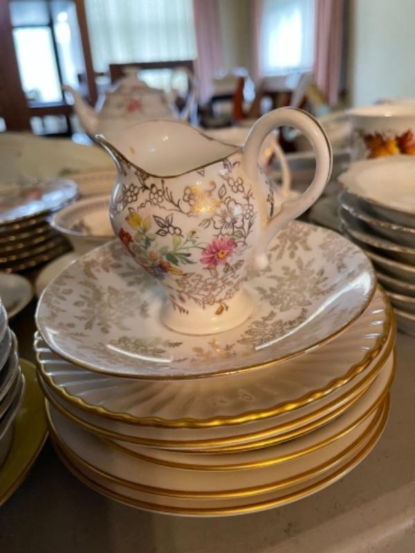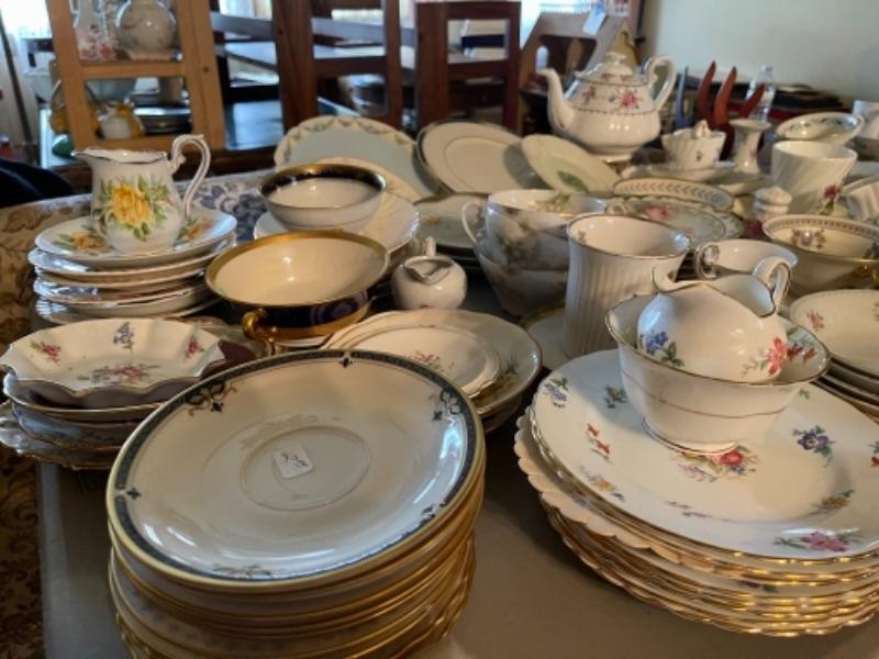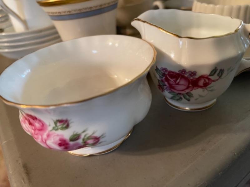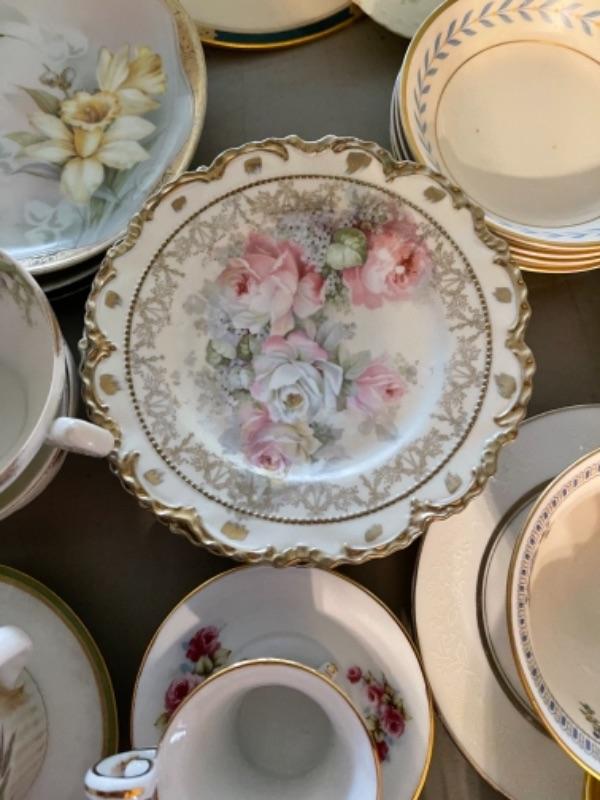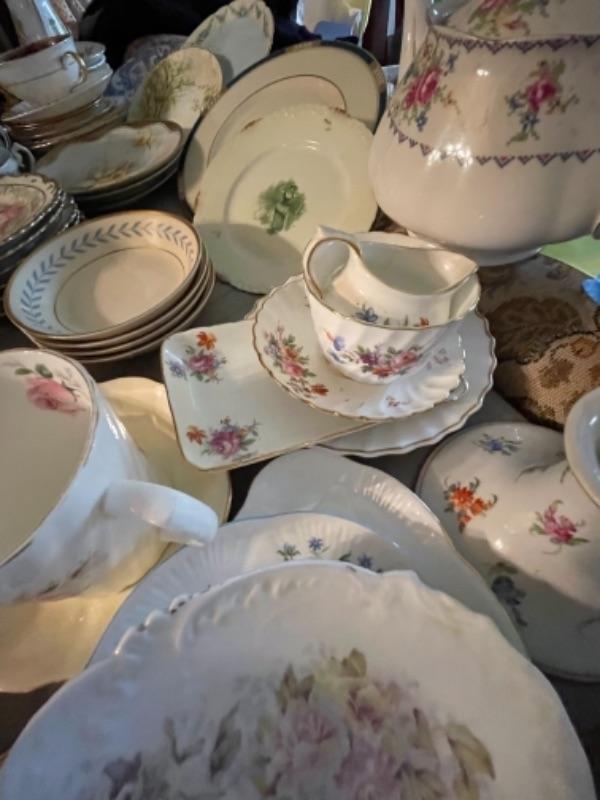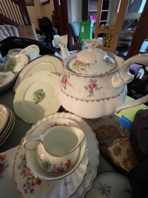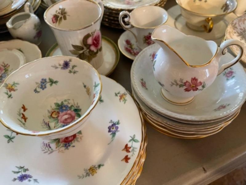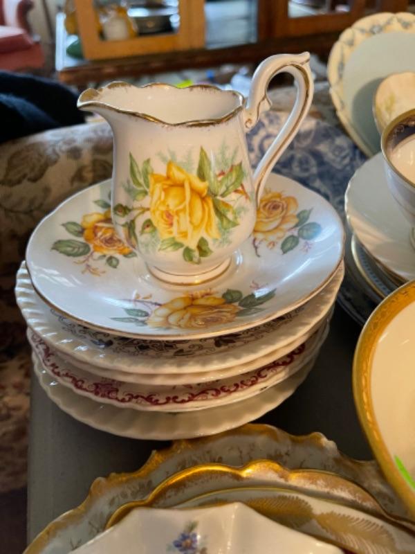 Lot 23DR. Huge lot of assorted cups and saucers along with teapot, creamers and sugars, dessert plates, extra saucers--$95