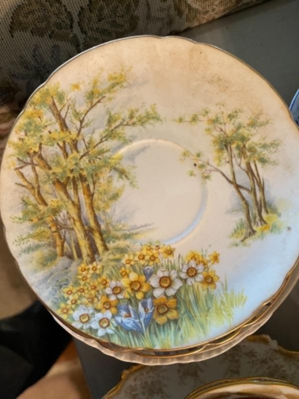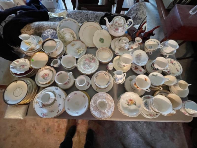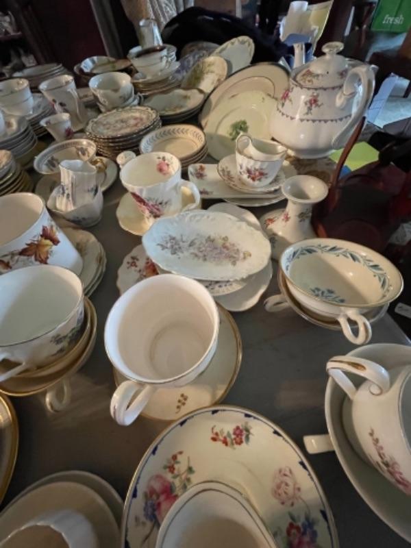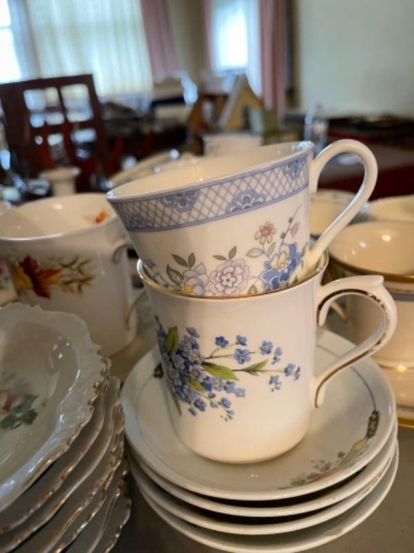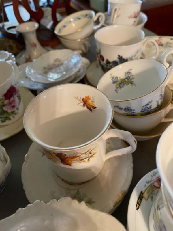 Lot 23DR. Huge lot of assorted cups and saucers along with teapot, creamers and sugars, dessert plates, extra saucers--Was $95- - NOW $47.50