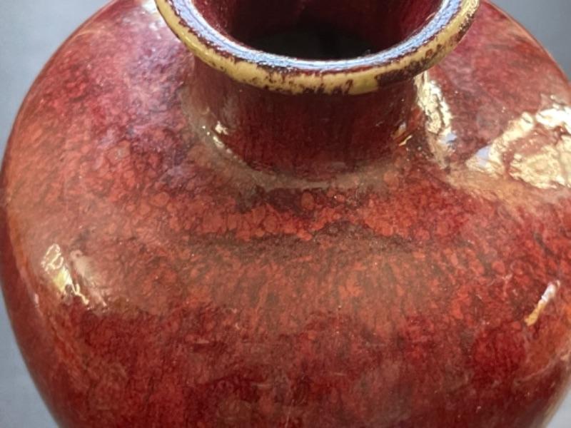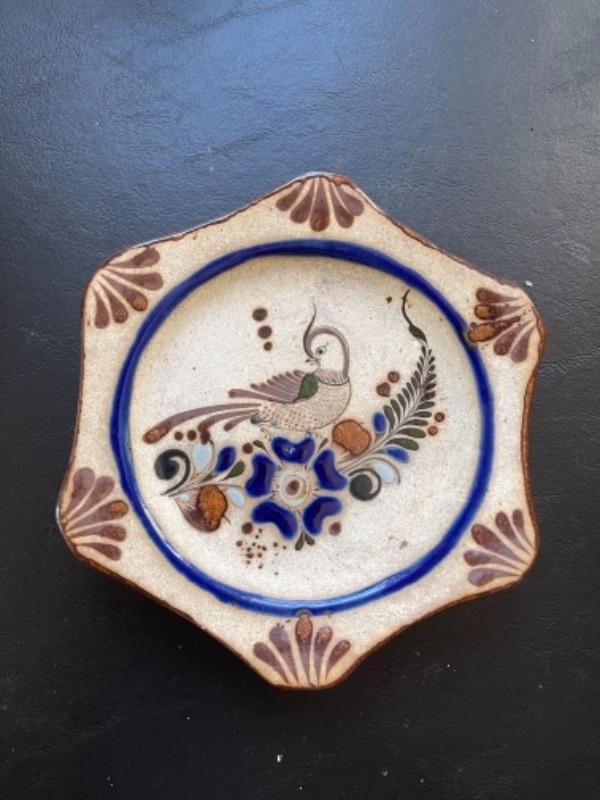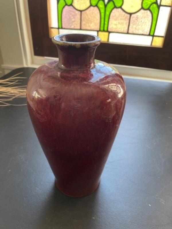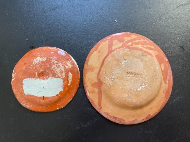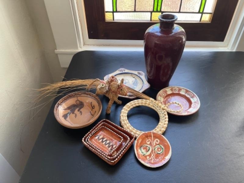 Lot 23LD. Ceramic Mexican Tlaquepaque redware nesting bowls, plates, vintage oxblood glazed vase, basketry mule and wall hanging--$130