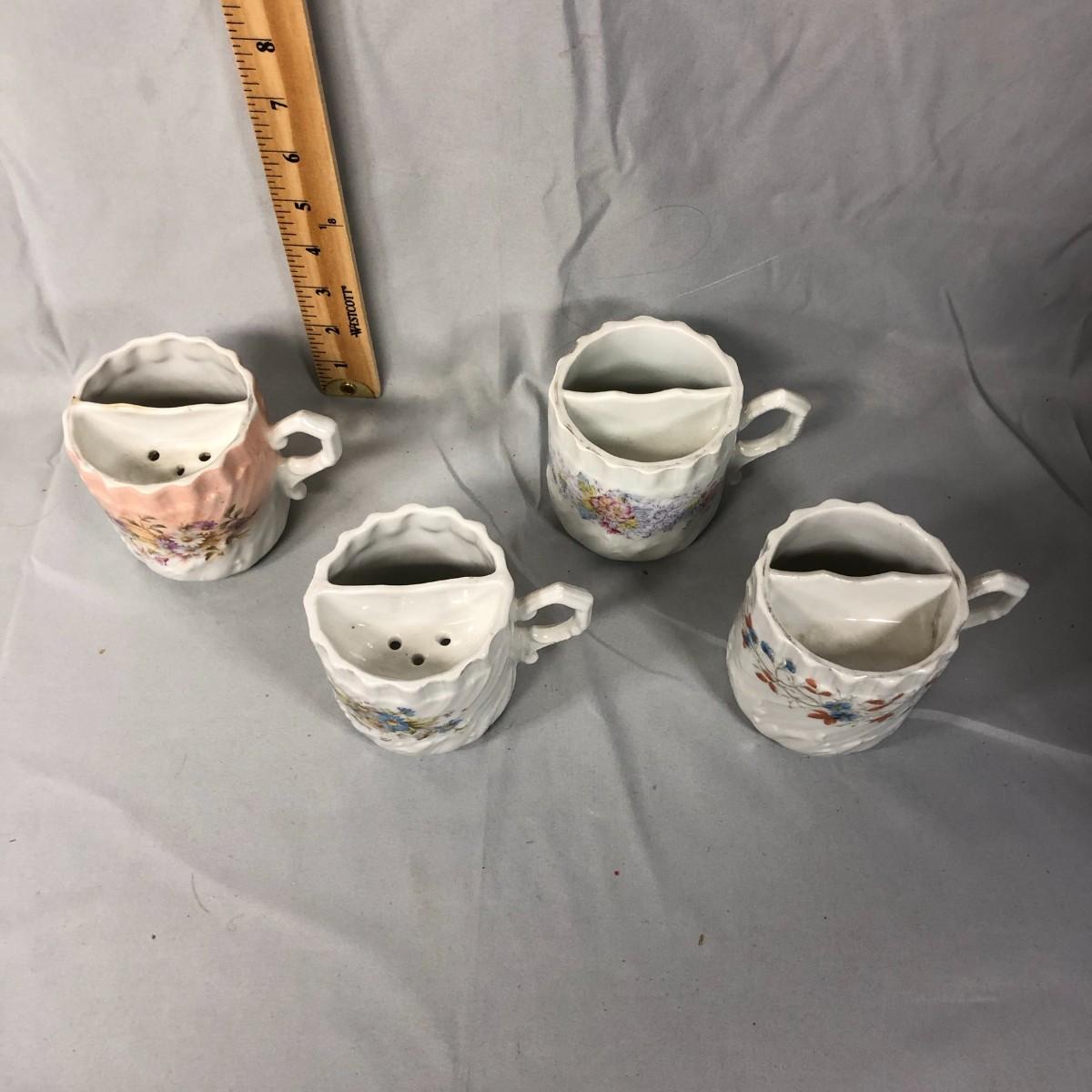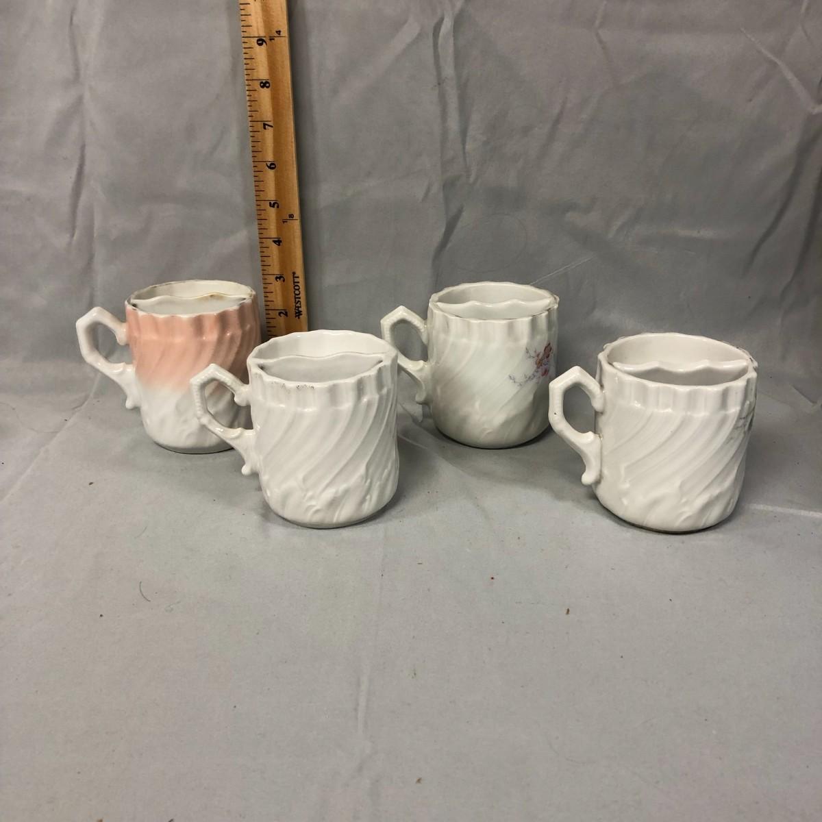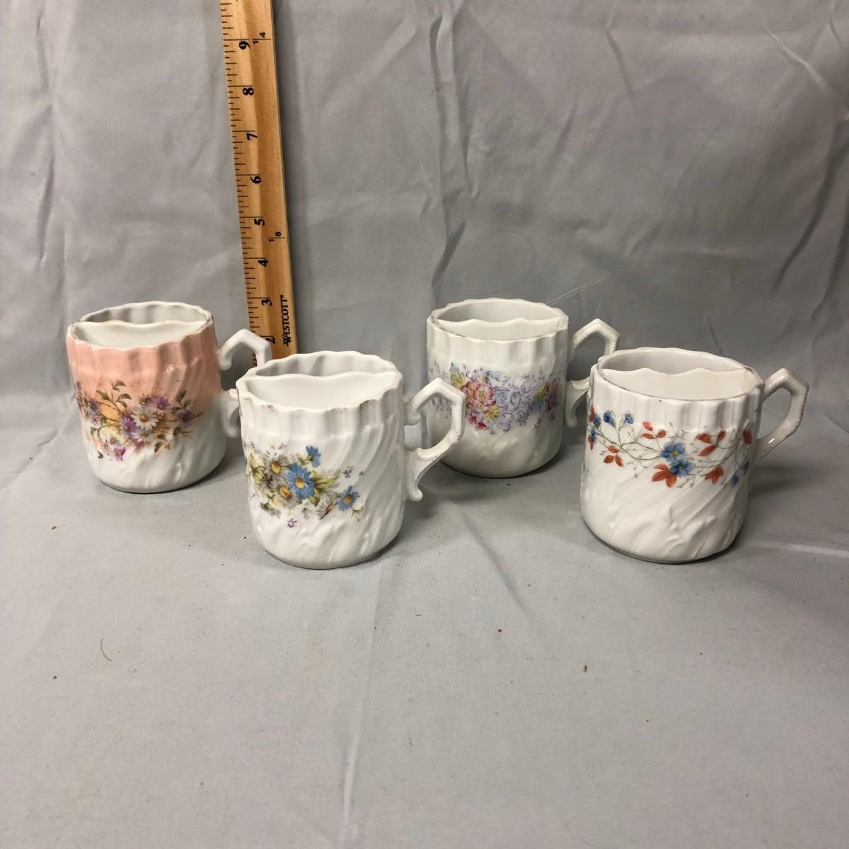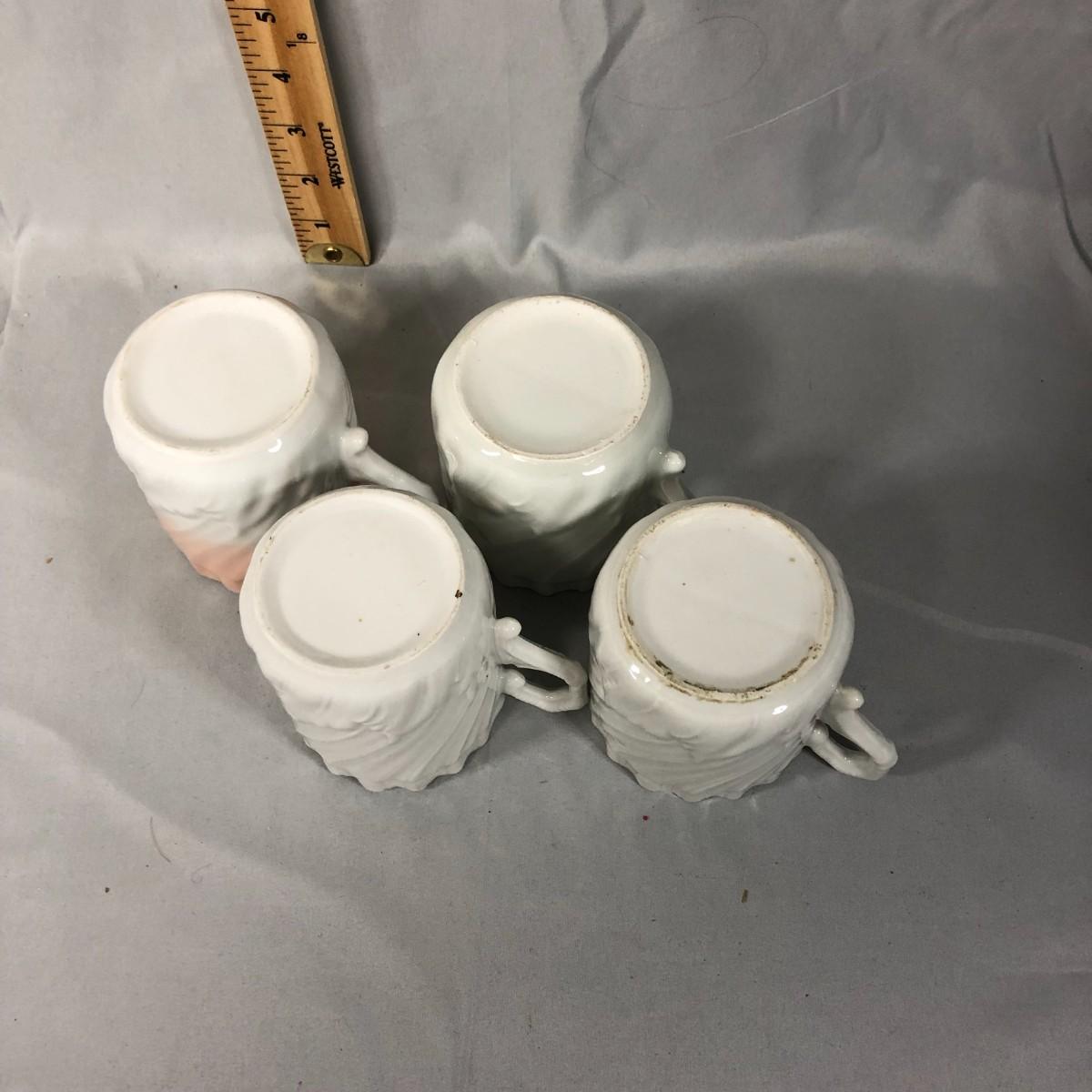Very pretty cups that have a swirl pattern and leaves embossed and then are painted with different floral patterns. All are in very good condition with no chips or cracks found. They are each about 3.5" tall