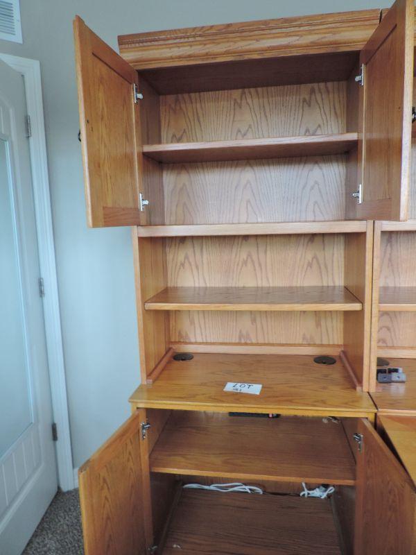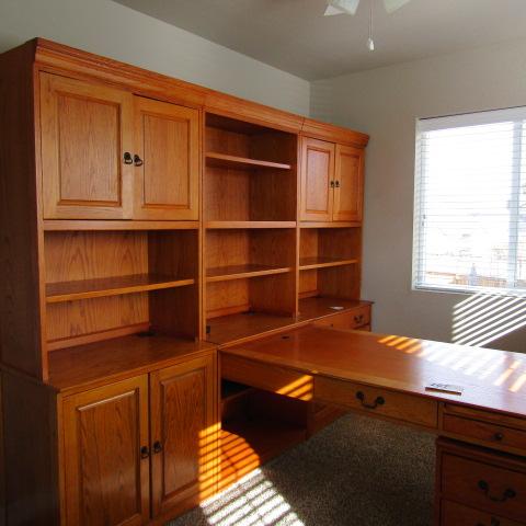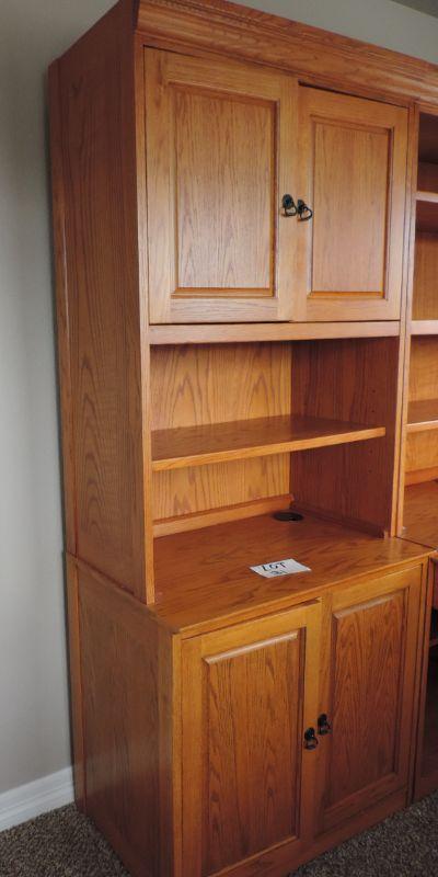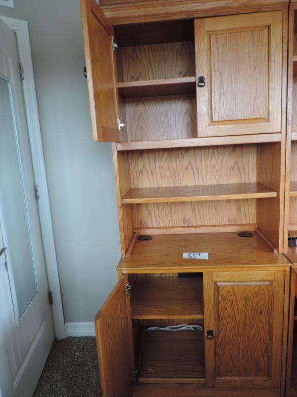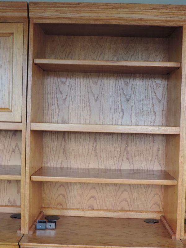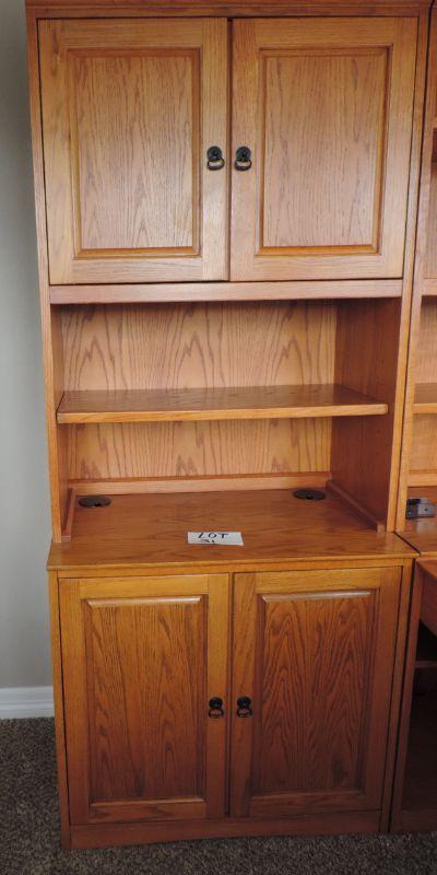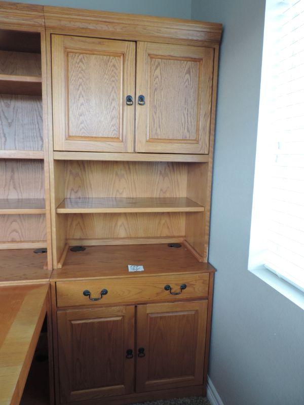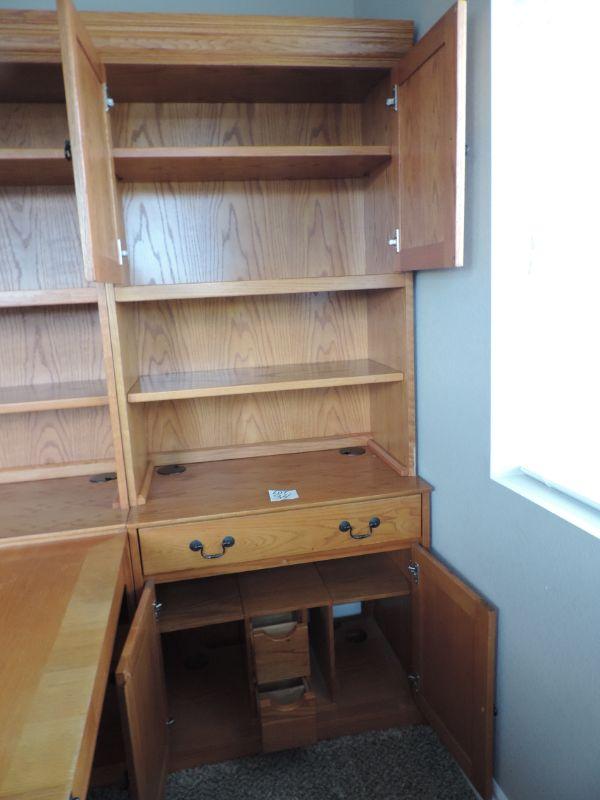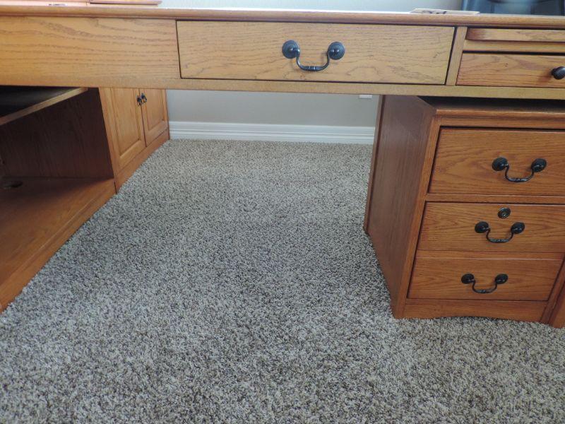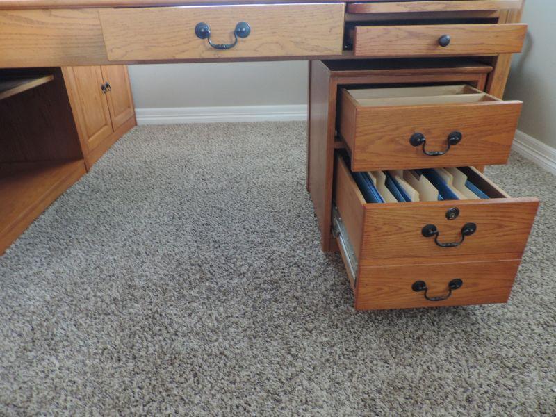 2 PEOPLE CAN WORK TOGETHER COMFORTABLY WITH THIS SOLID OAK PARTNER DESK. EACH SIDE HAS ITS OWN 2 DOOR CUPBOARD WITH A SHELF, 2 SHELVES BELOW THAT AND A LARGE 2 DOOR CABINET WITH SHELF. EACH SIDE ALSO HAS A FILING CABINET DRAWER, DIVIDED DRAWER, A MIDDLE AND SMALLER DRAWER. THERE IS ALSO A PULL OUT FOR EXTRA WORKSPACE