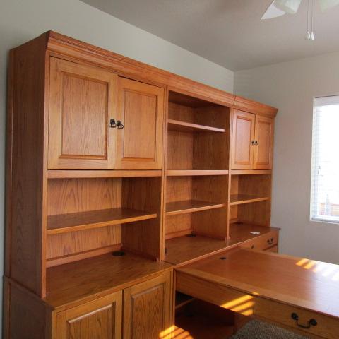 THE SHARED MIDDLE SECTION HAS SHELVING AND MORE WORK AREA