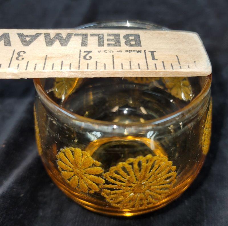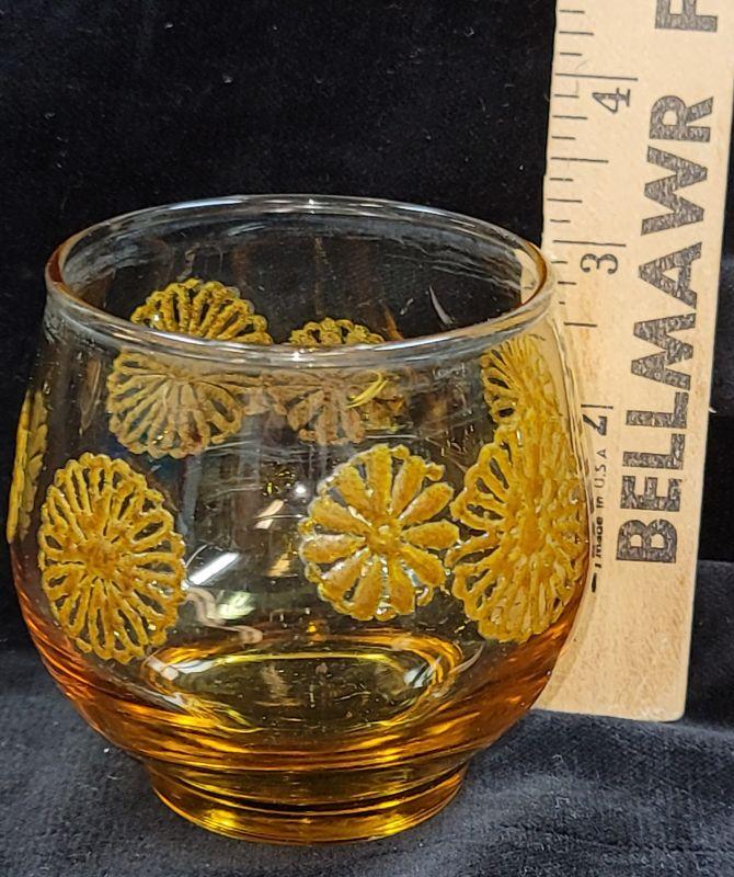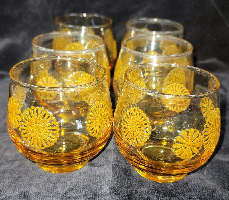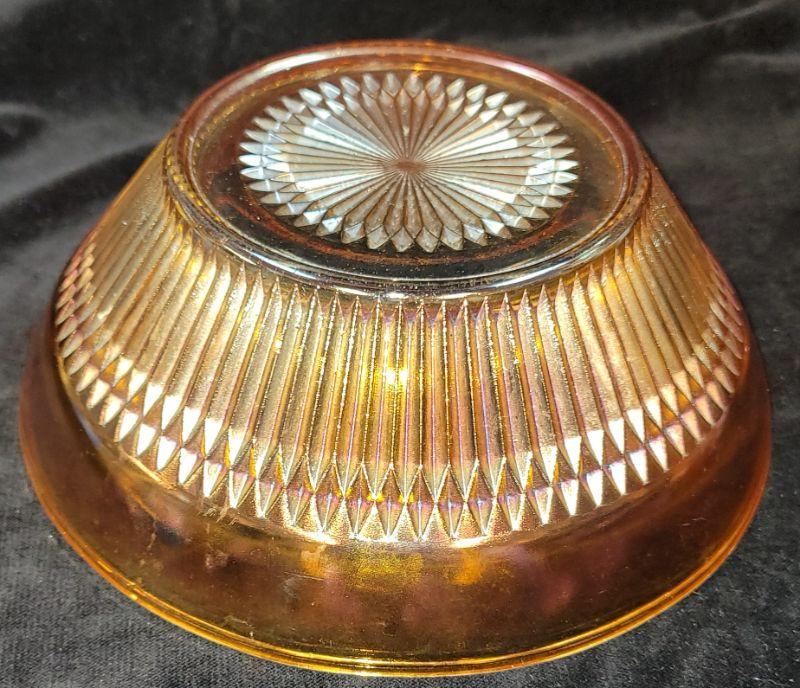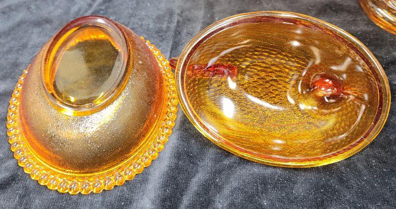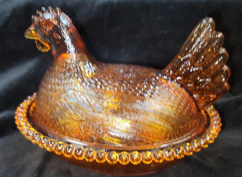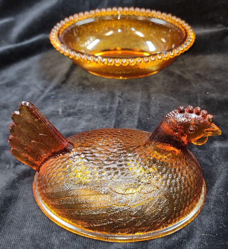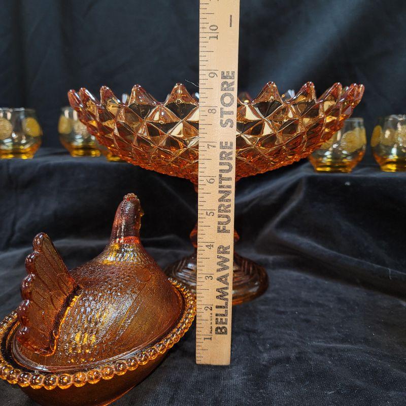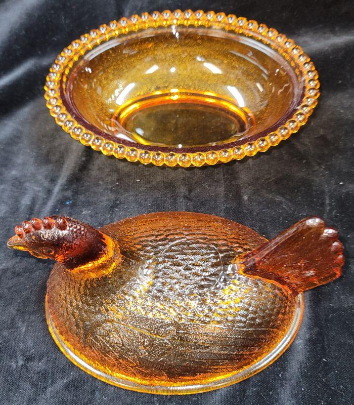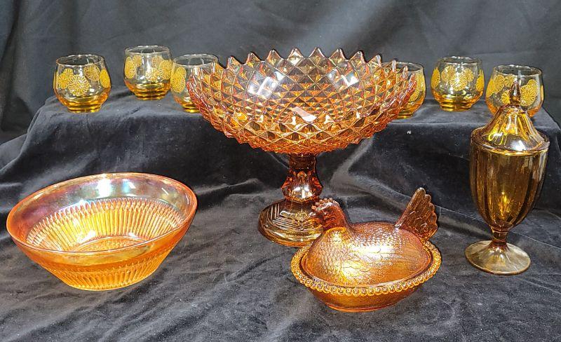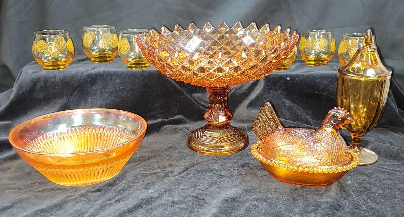 Lot also includes Carnival glass bowl, hen on nest, covered candy dish and vintage gold amber orange juice glasses with raised flowerette.