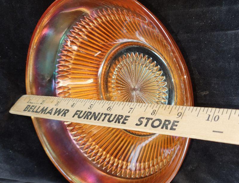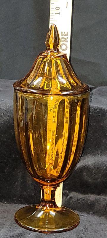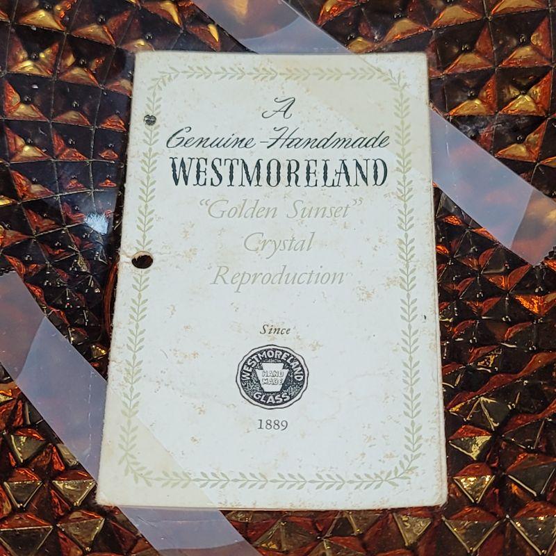 VINTAGE WESTMORELAND AMBER GOLDEN SUNSET SAWTOOTH DIAMOND POINT PEDESTAL COMPOTE. In Very good gently used condition, no chips or cracks. Measures:9” Tall x 11 1/2” Wide x 3 1/2” Deep, this is a fairly Heavy Piece.