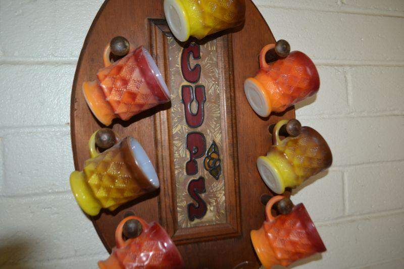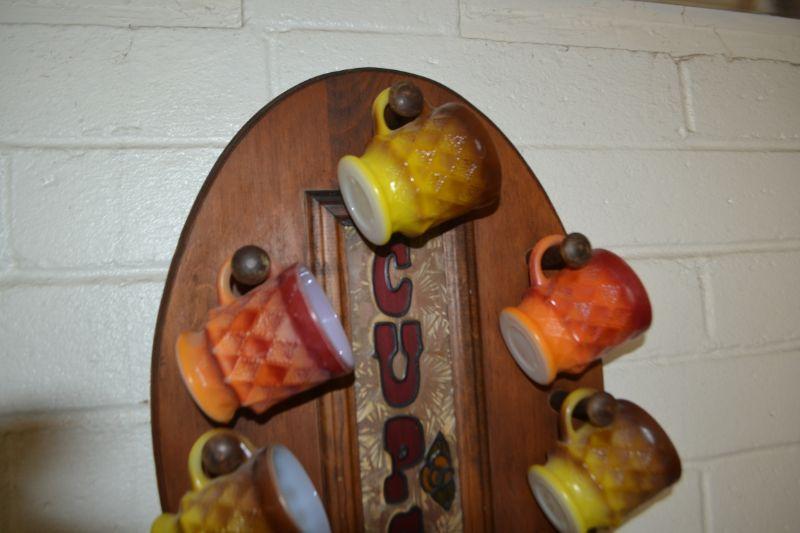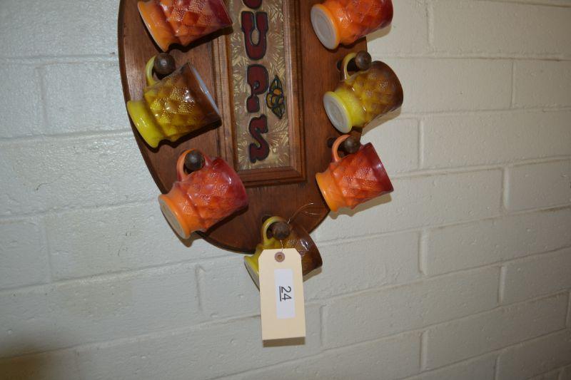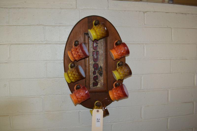 LOT 24. Vintage Wall mounted cup rack with six mugs