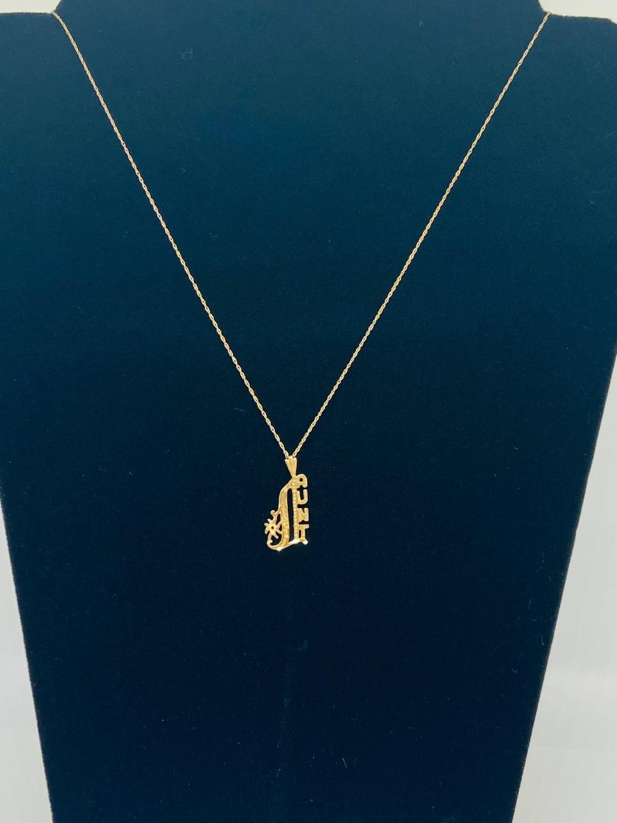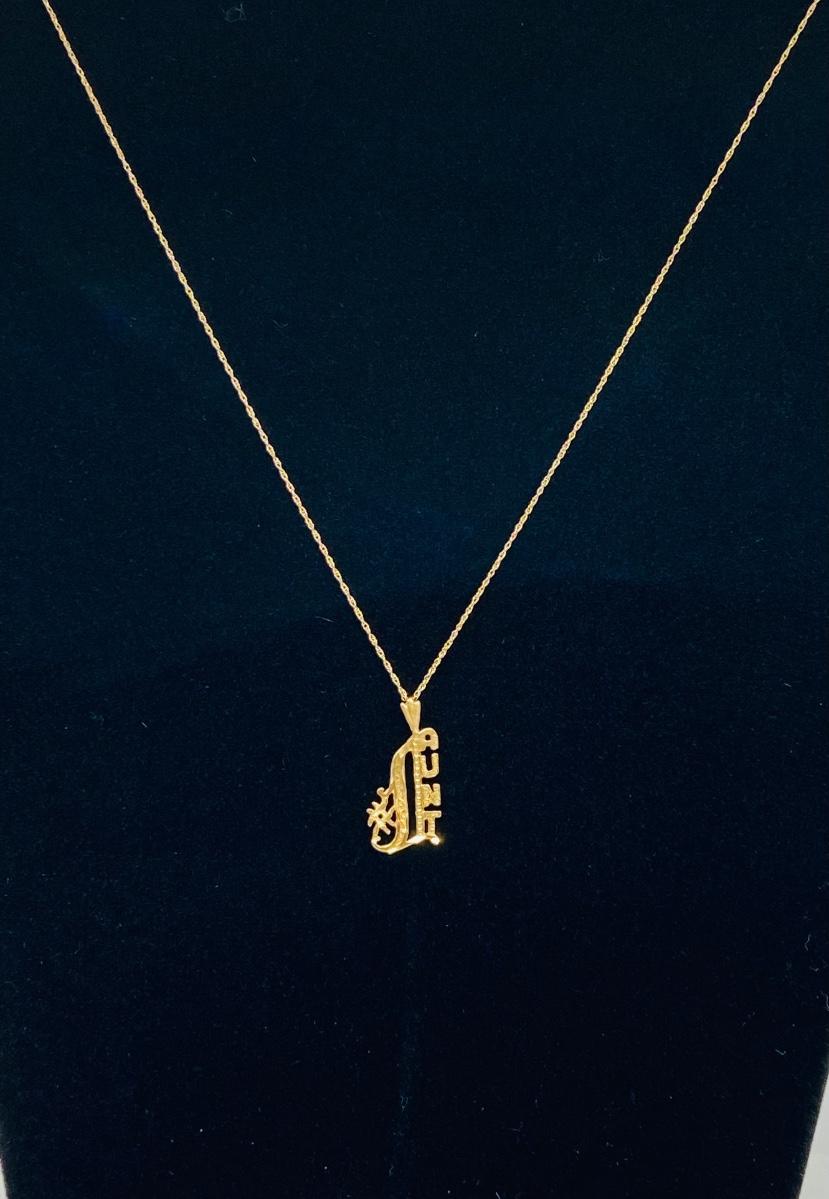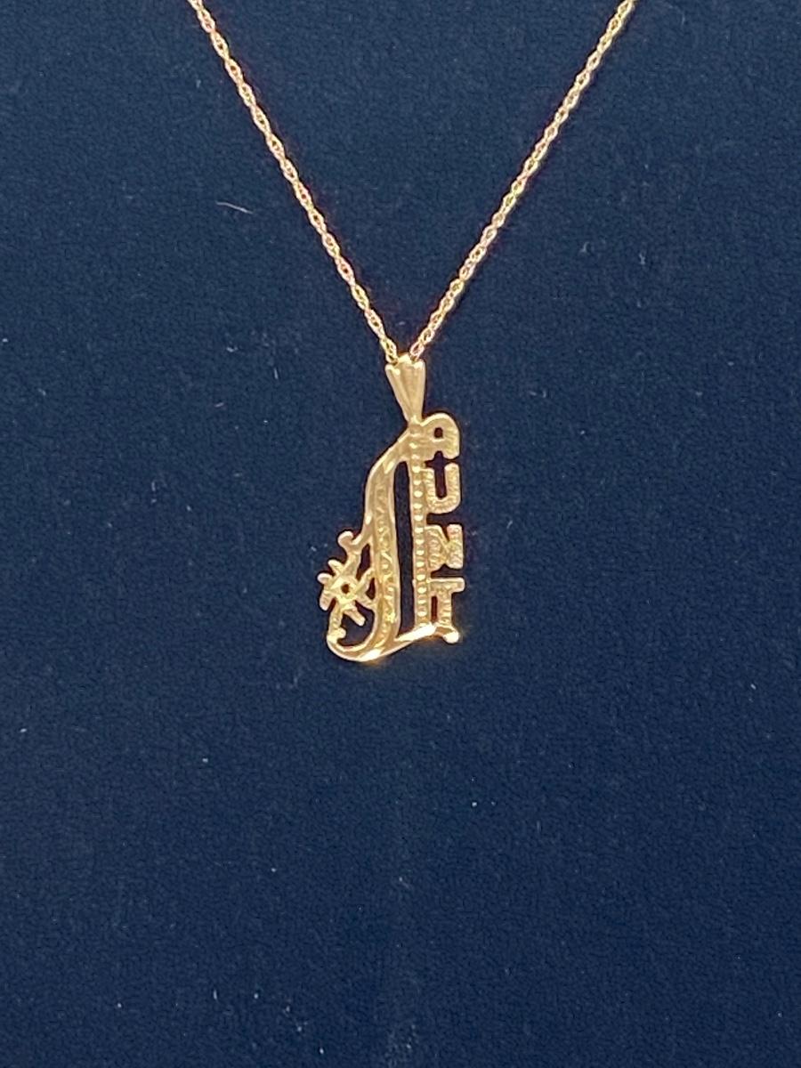 1.3g pendant and .5g chain 14k yellow gold. What a great way to honor that special Aunt in your life! The pictures show condition, measurements if taken, and what is included in the lot. Due to the large amount that we photograph and the time frame, we are not always able to take measurements. All items unless noted, are pre-owned and have been used, and are untested. Thank you