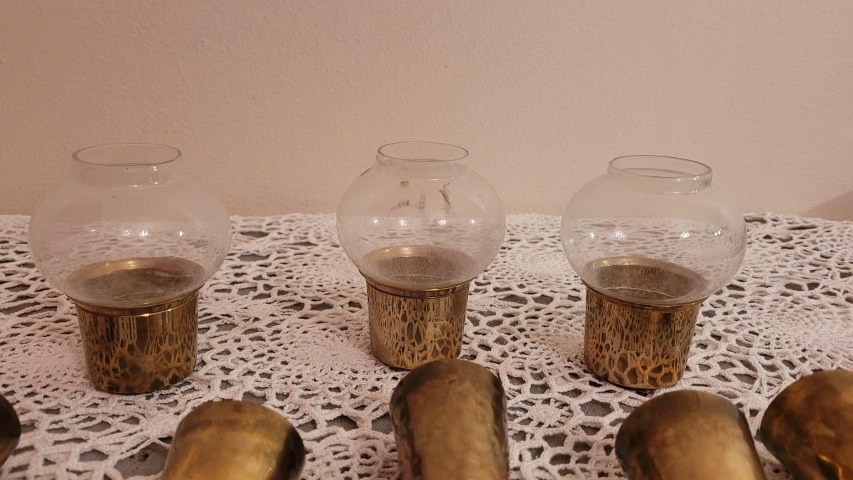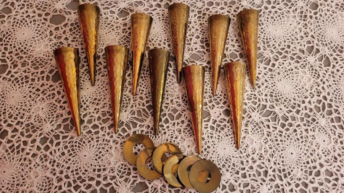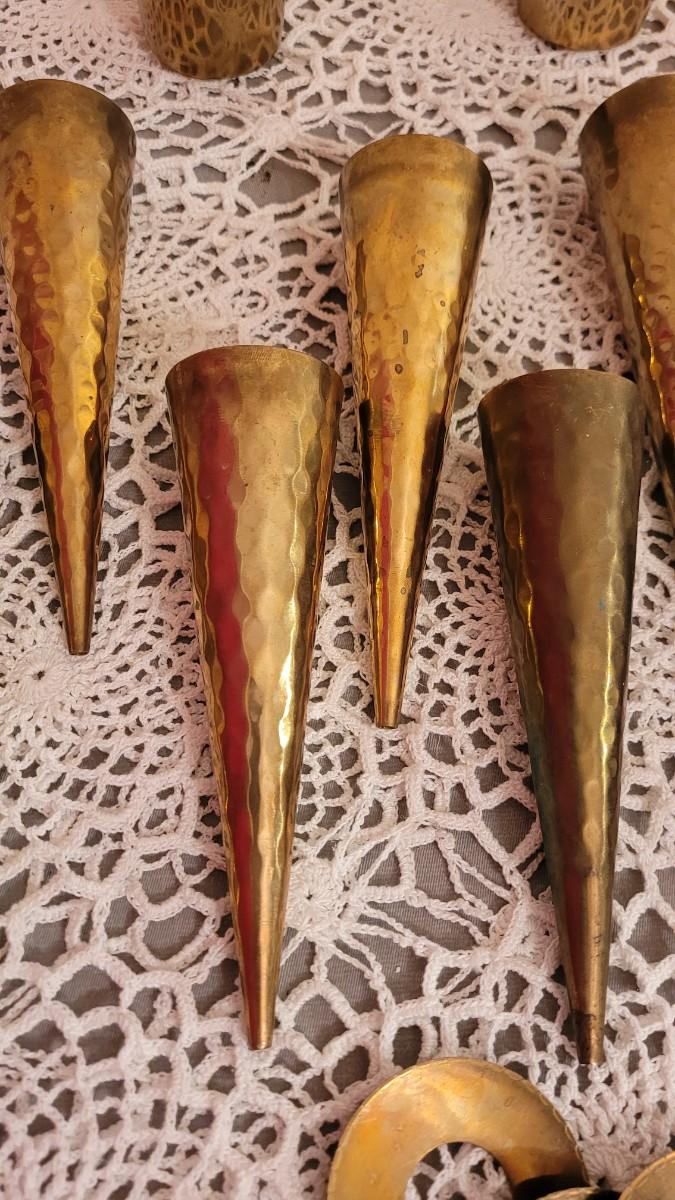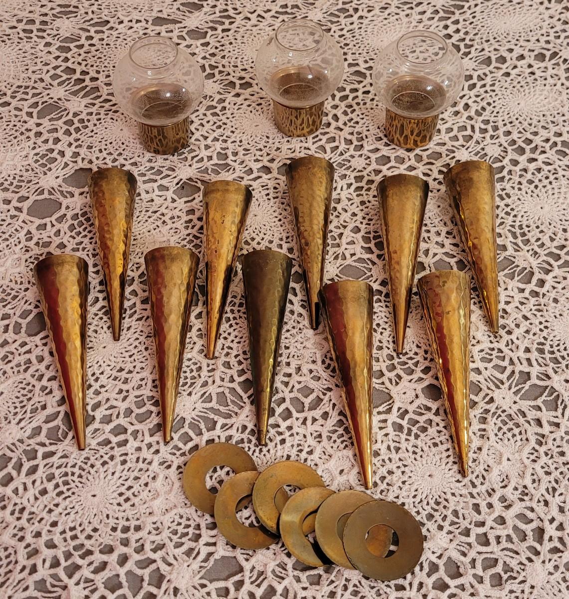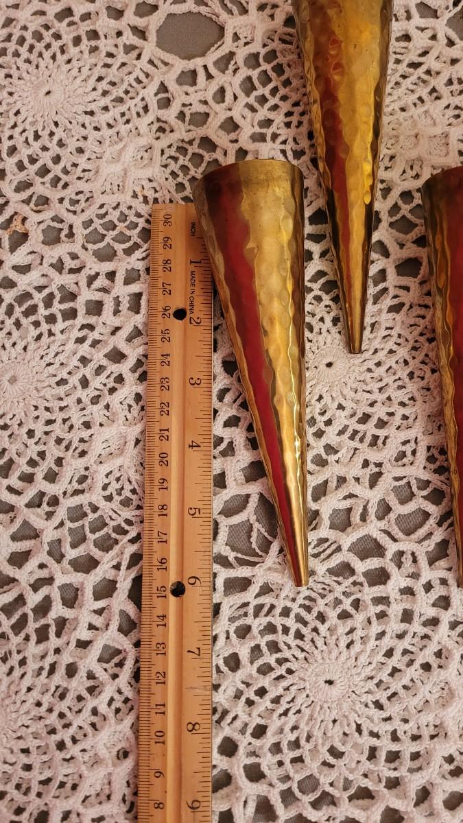 Lot 24: Vintage Brass Candleholders- Hammered Cones and Small Brass & Glass Lantern Candleholders