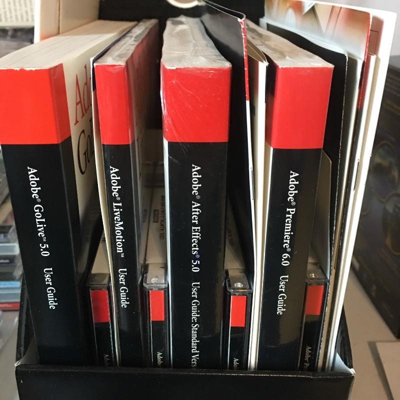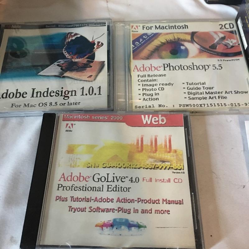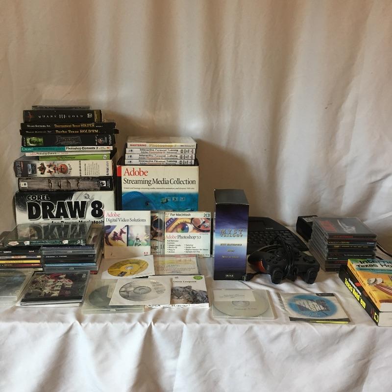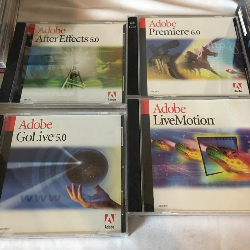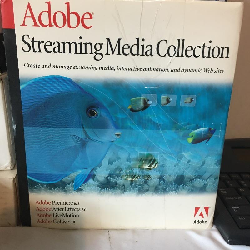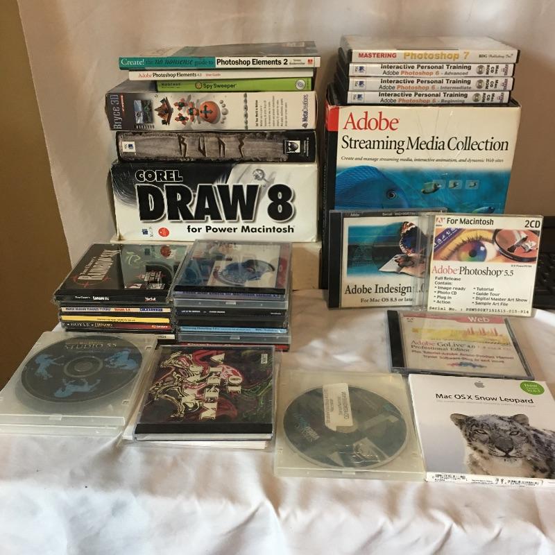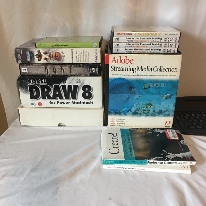 Adobe streaming media collection and more. Lot includes Adobe Indesign 1.0.1, Go Live 4.0, Photoshop 5.5, Corel Draw 8, Painter 5 and trading CDs. Lot also includes Myst Trilogy, Star Trek game, Rainbow six game NEO2 keyboard, Nostromo game controller and more.