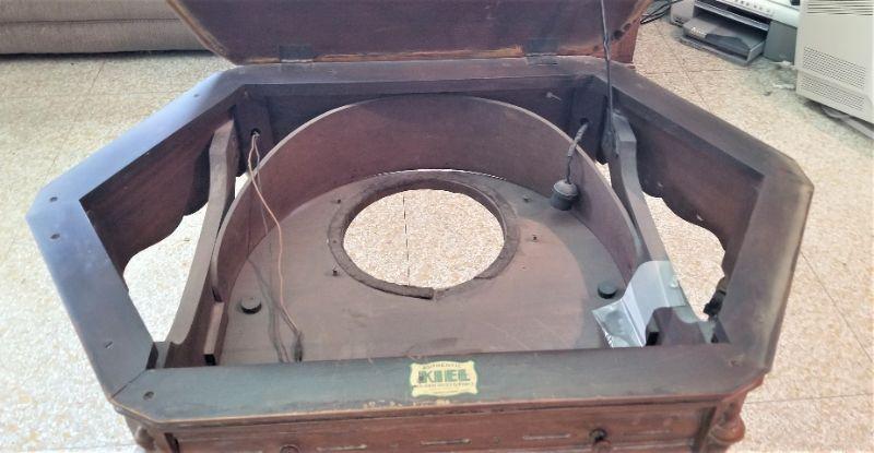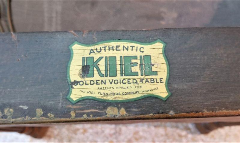 Here's a good chalk paint item or project piece - needs painting or refinishing. Vintage KIEL Furniture Company of Milwaukee "Golden Voiced" table for an old-time radio. Drop down front reveals hole for radio knobs. Sturdy. This was designed for one of the larger "family" radios. Measures 36.5" wide x 25", stands 26.5" tall.