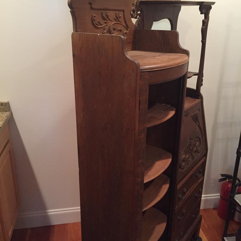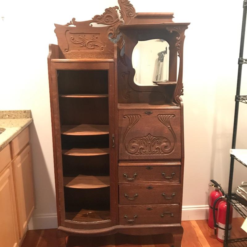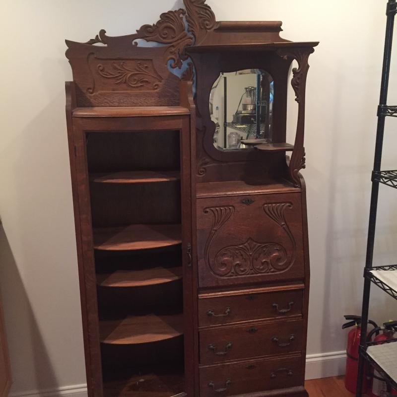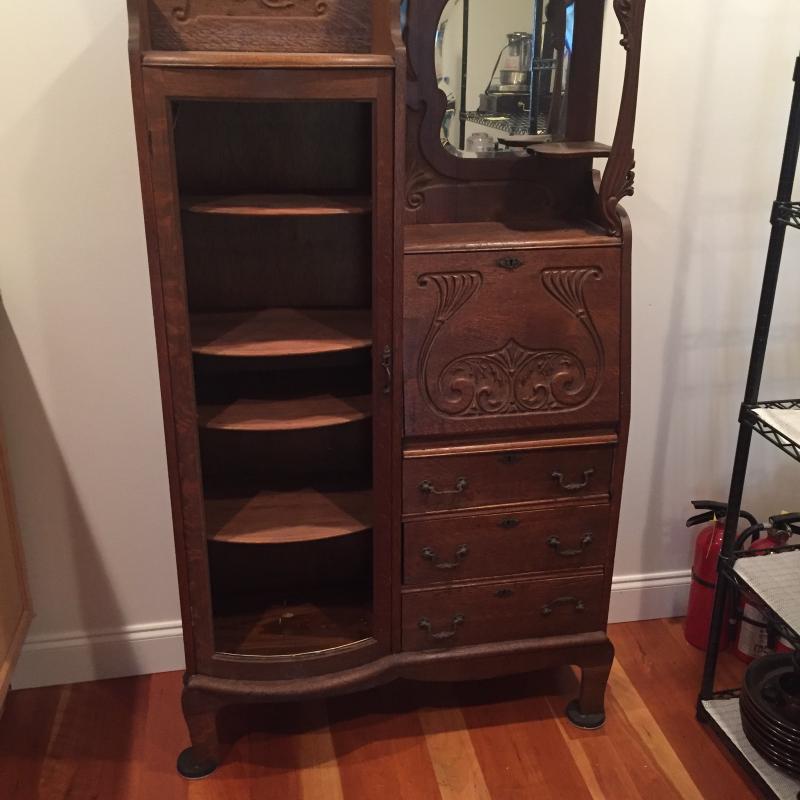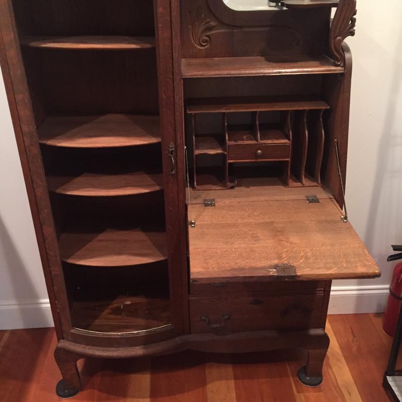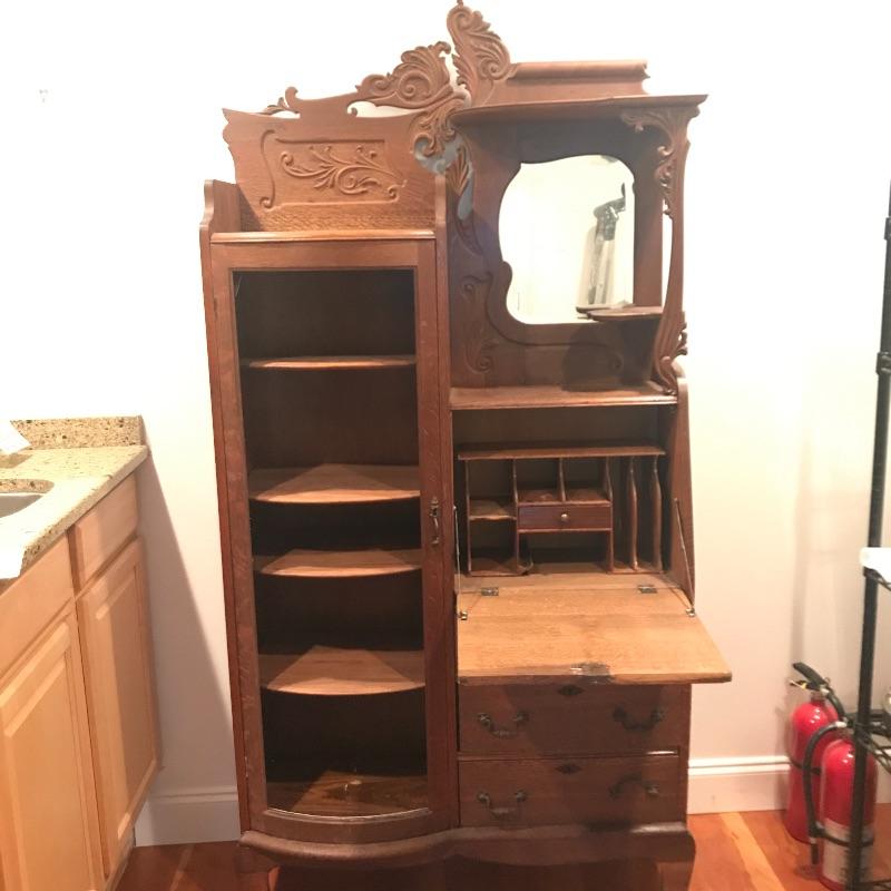 Stunning antique secretary desk with curio cabinet and beveled glass mirror. Cabinet is missing glass and drawers are a bit wobbly. There is no key. This is a truly stunning piece. Cabinet measures 38” x 14.5” x 76”.