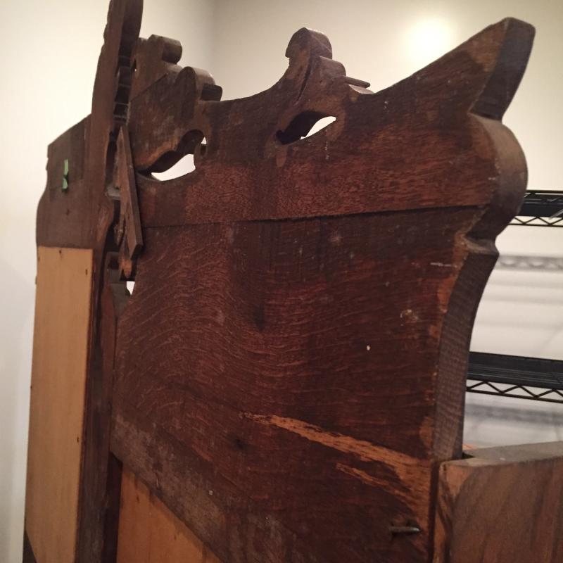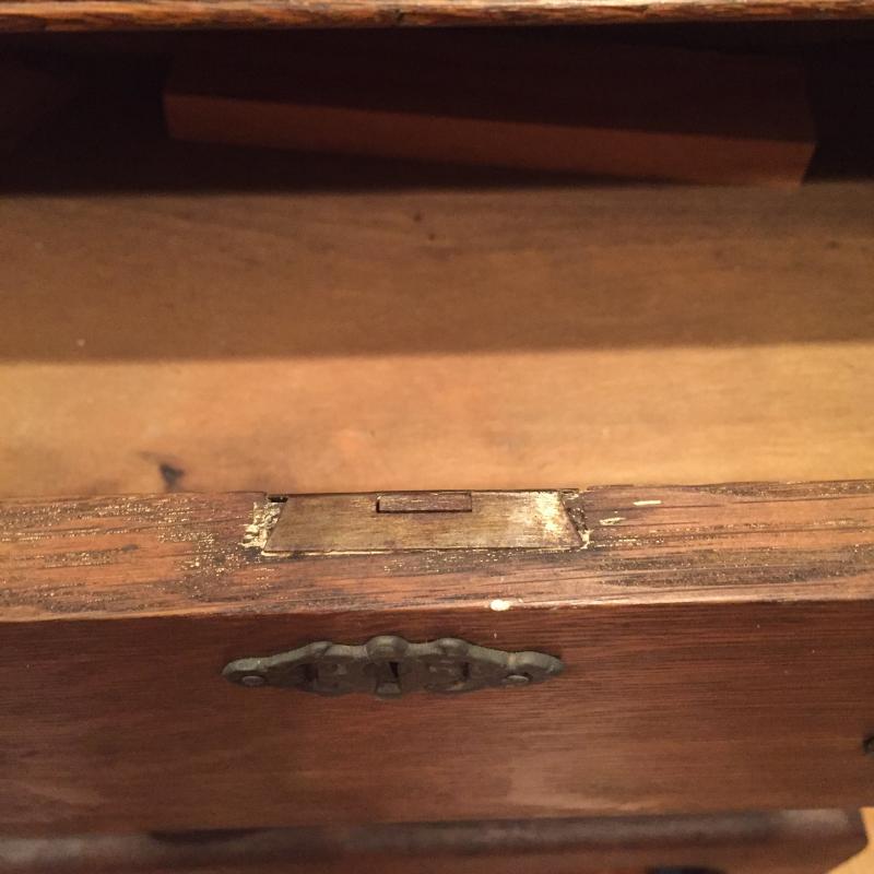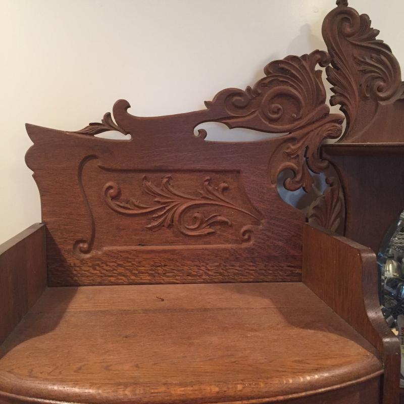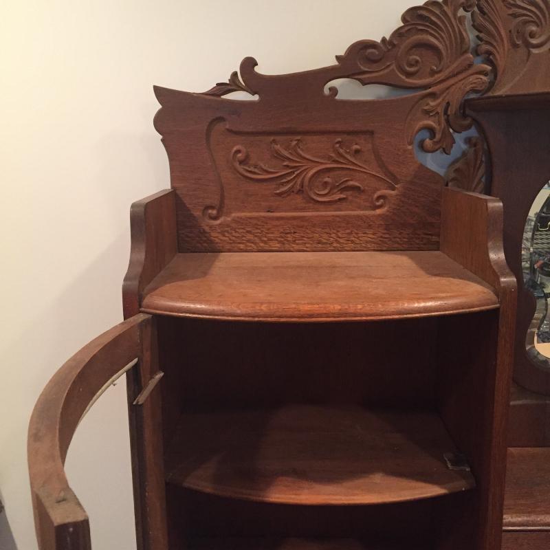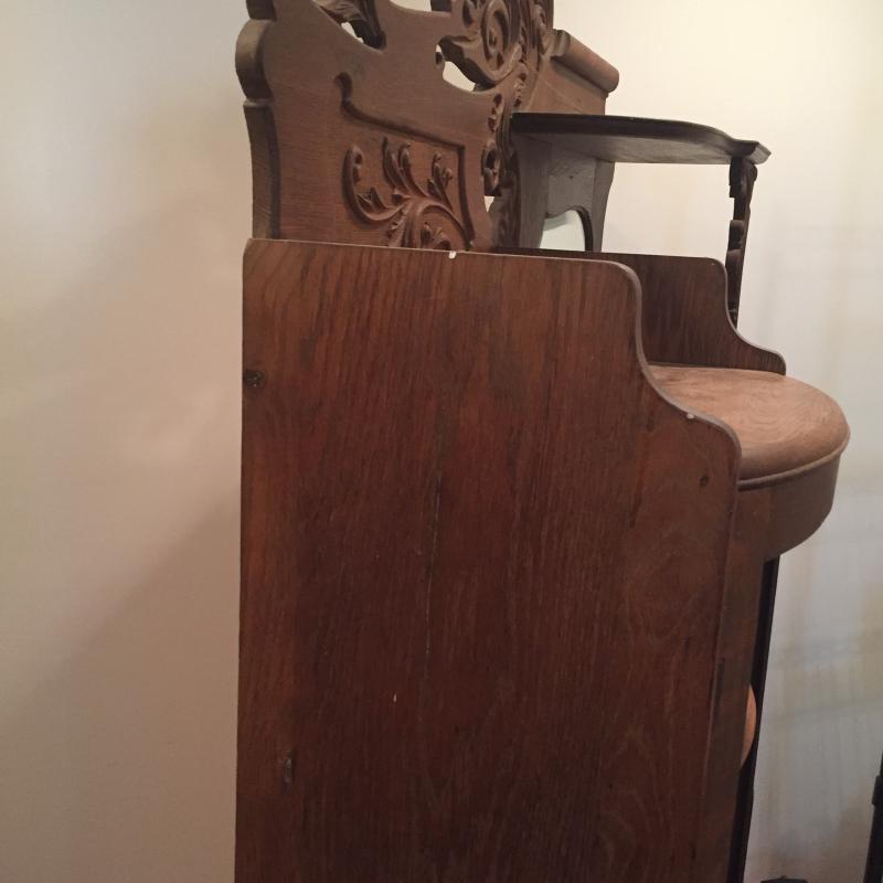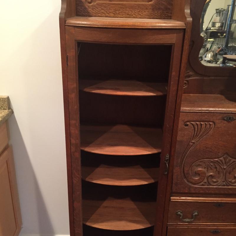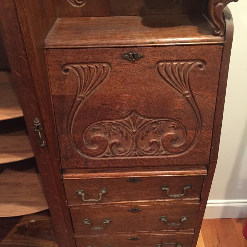 Stunning antique secretary desk with curio cabinet and beveled glass mirror. Cabinet is missing glass and drawers are a bit wobbly. There is no key. This is a truly stunning piece. Cabinet measures 38” x 14.5” x 76”.