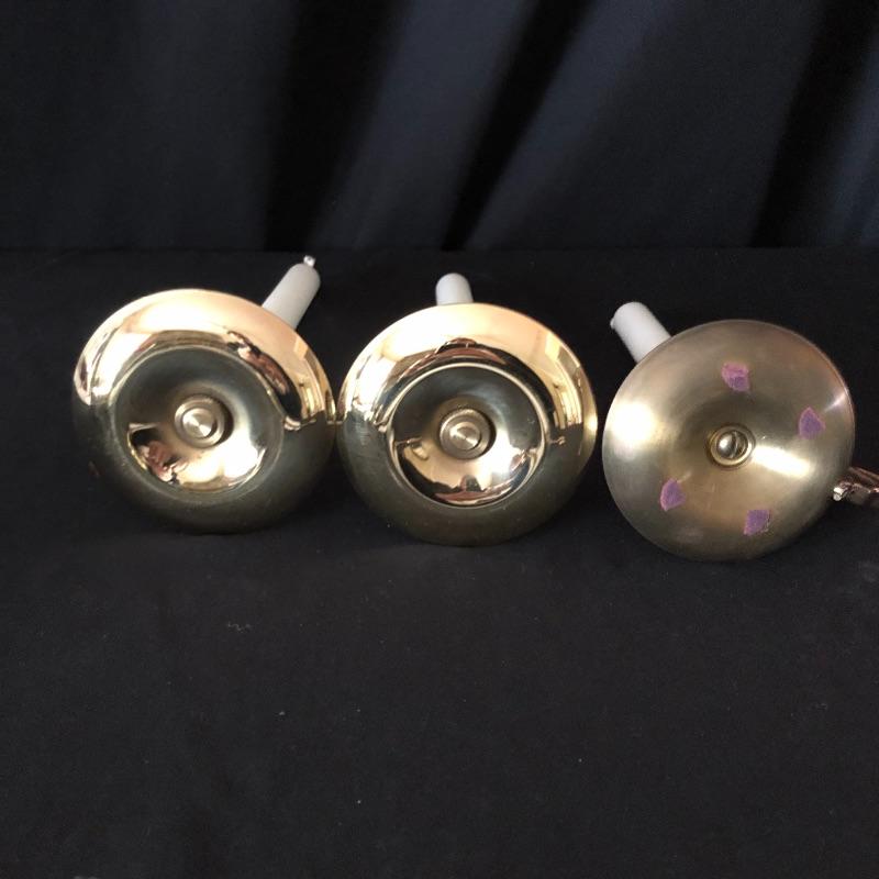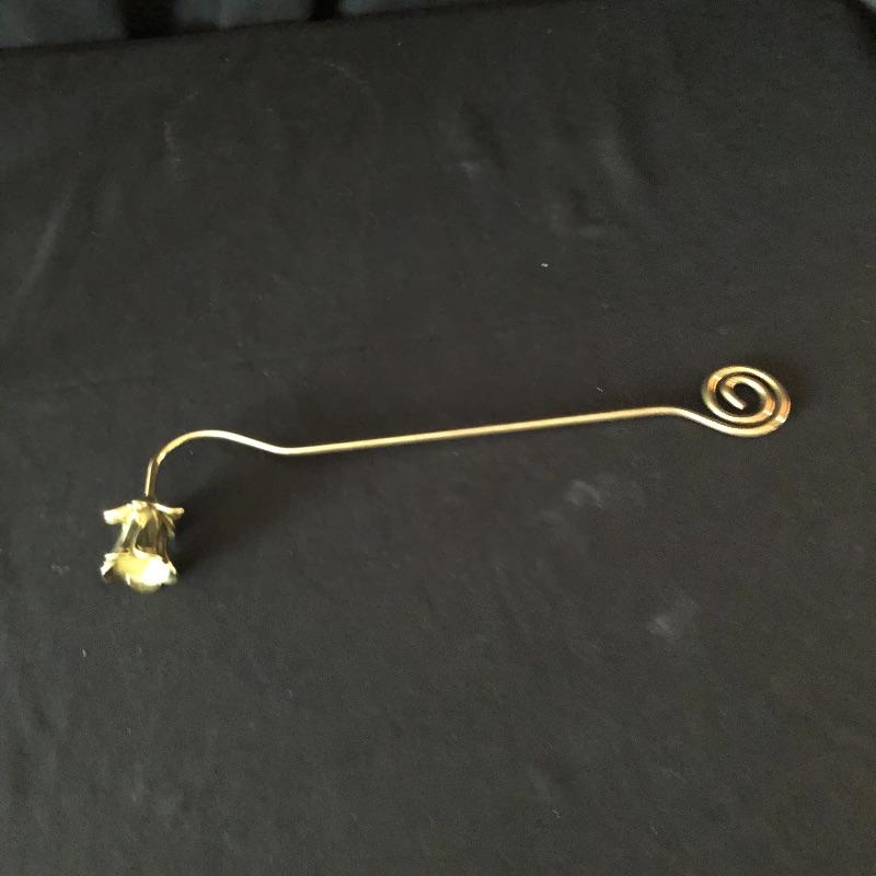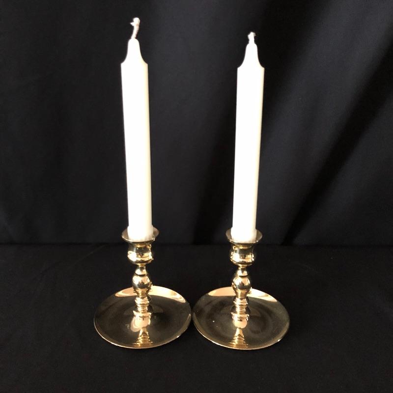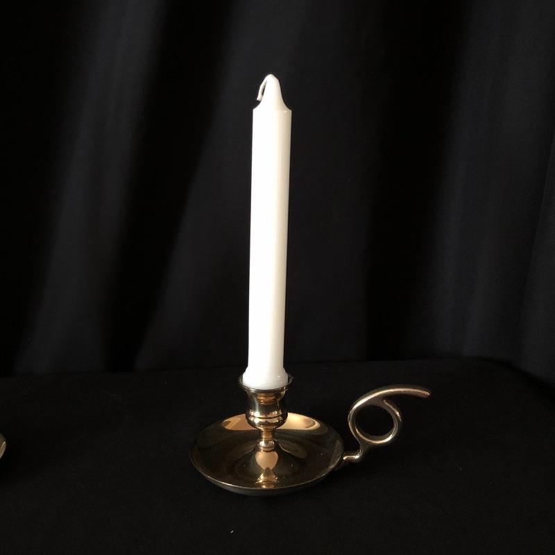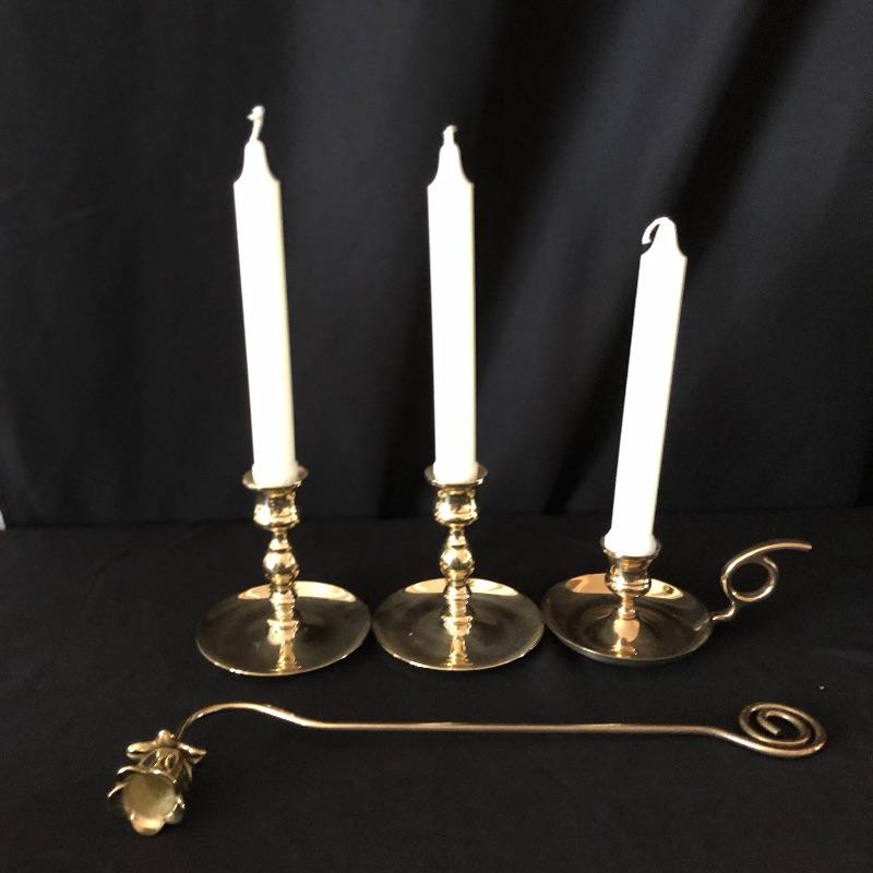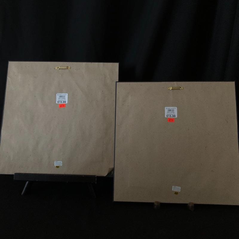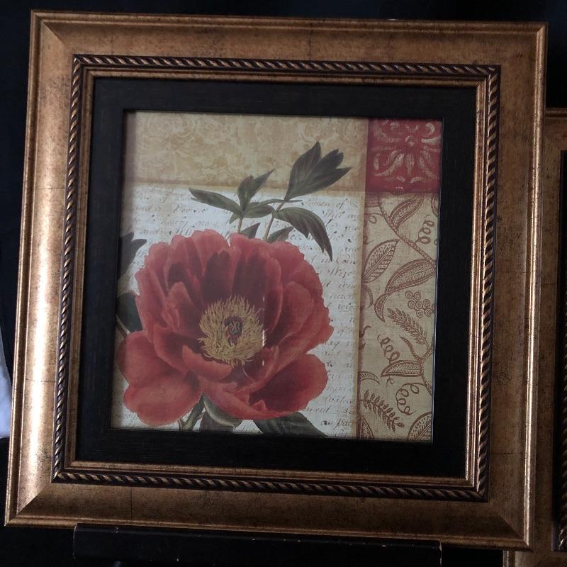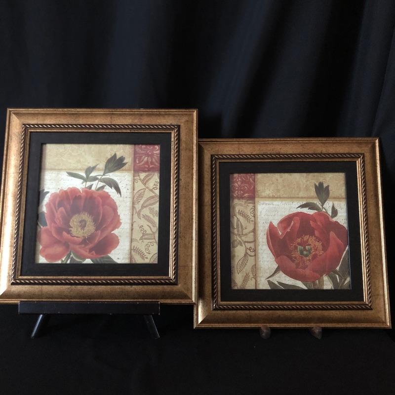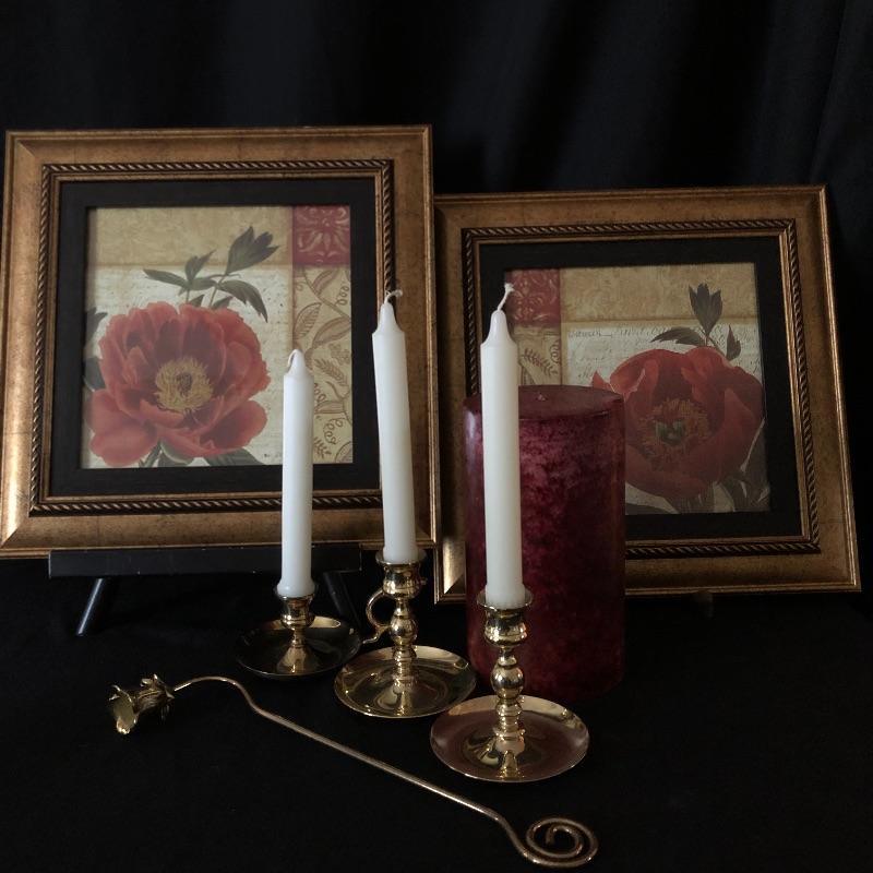 This attractive assortment of home decor includes three brass candleholders with white tapercandles, brass candle sniffer, large maroon colored candle and two pieces of framed prints. The frames measure 14” x 14” and are matching gold colored with black matting.