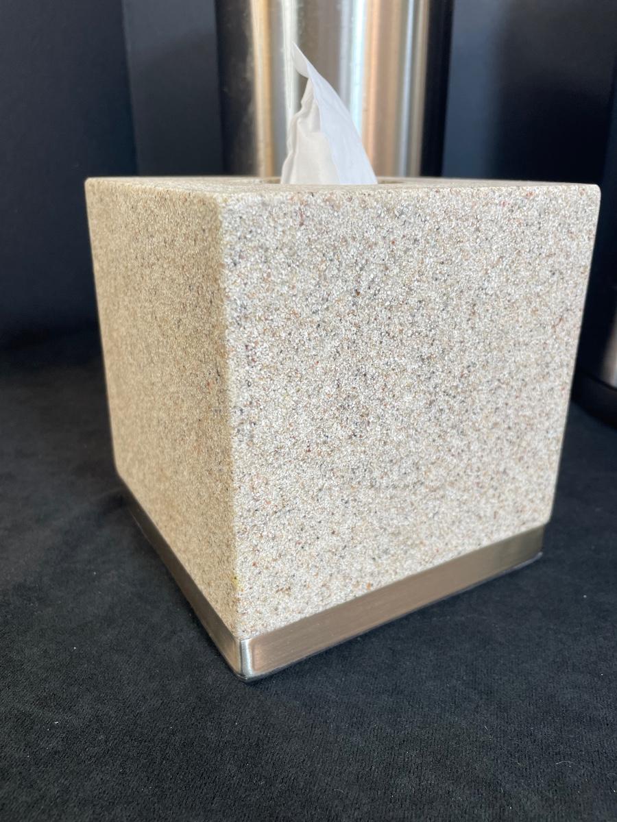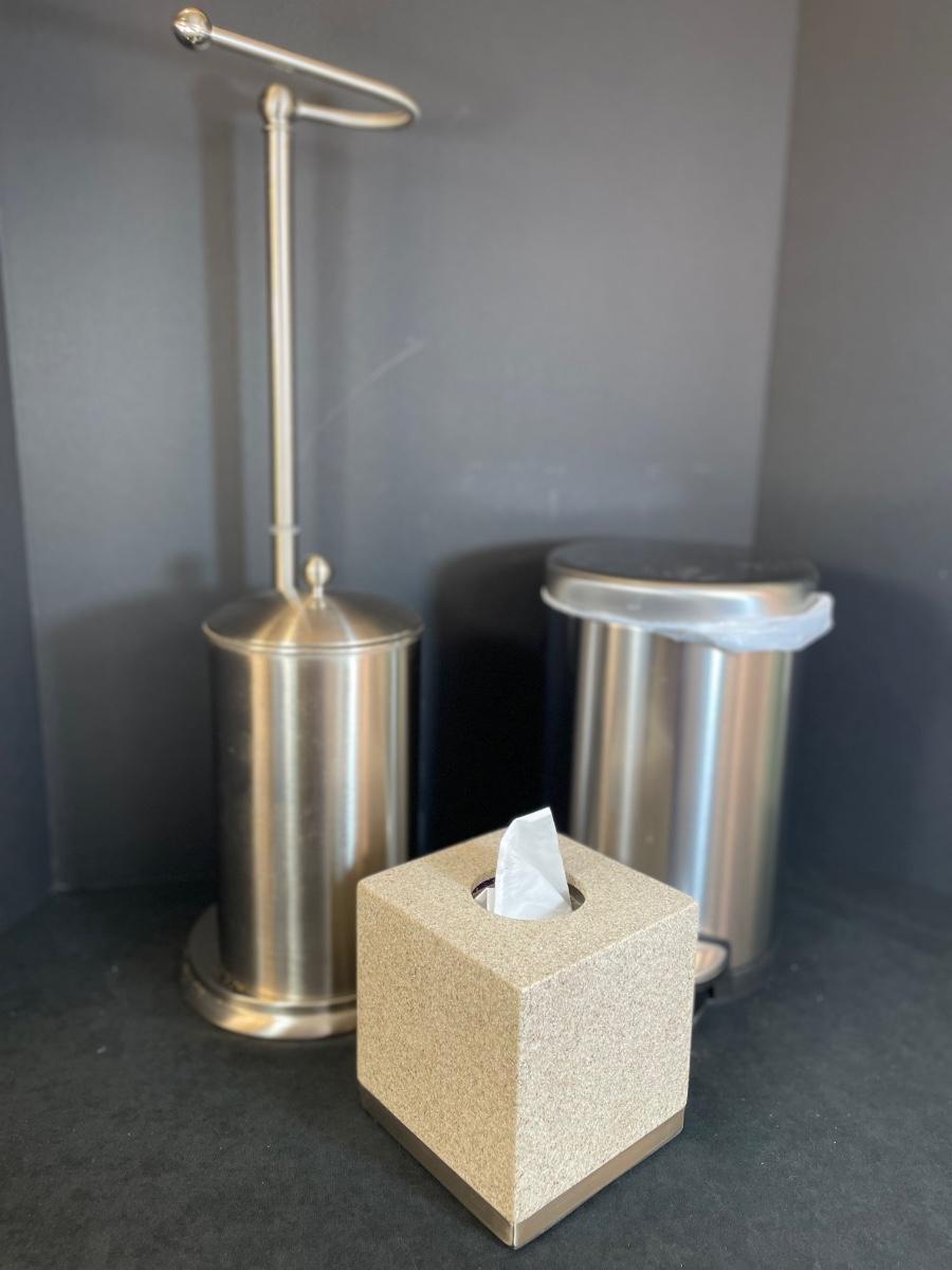 Chrome Toilet paper holder and trash can with a ceramic tissue box cover.