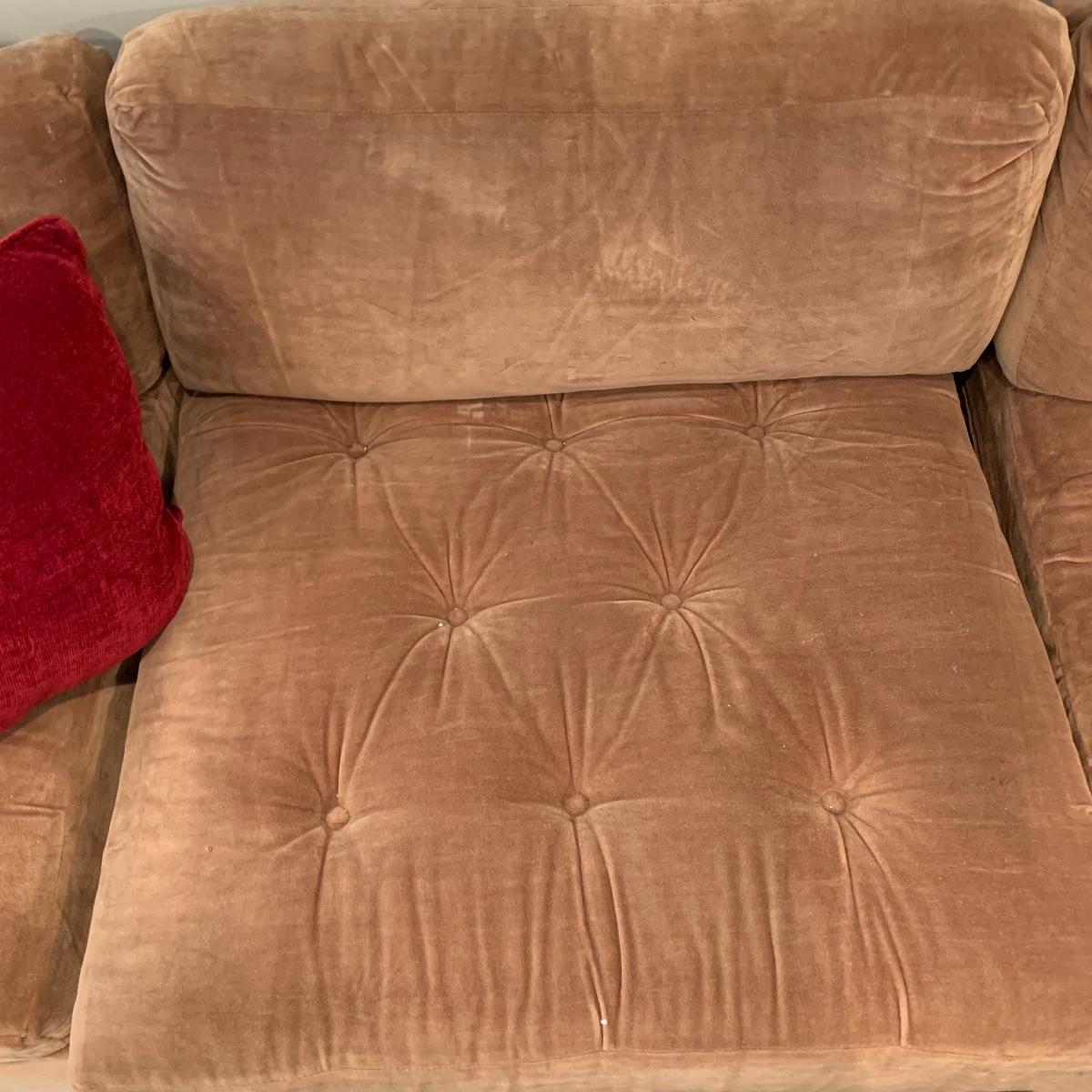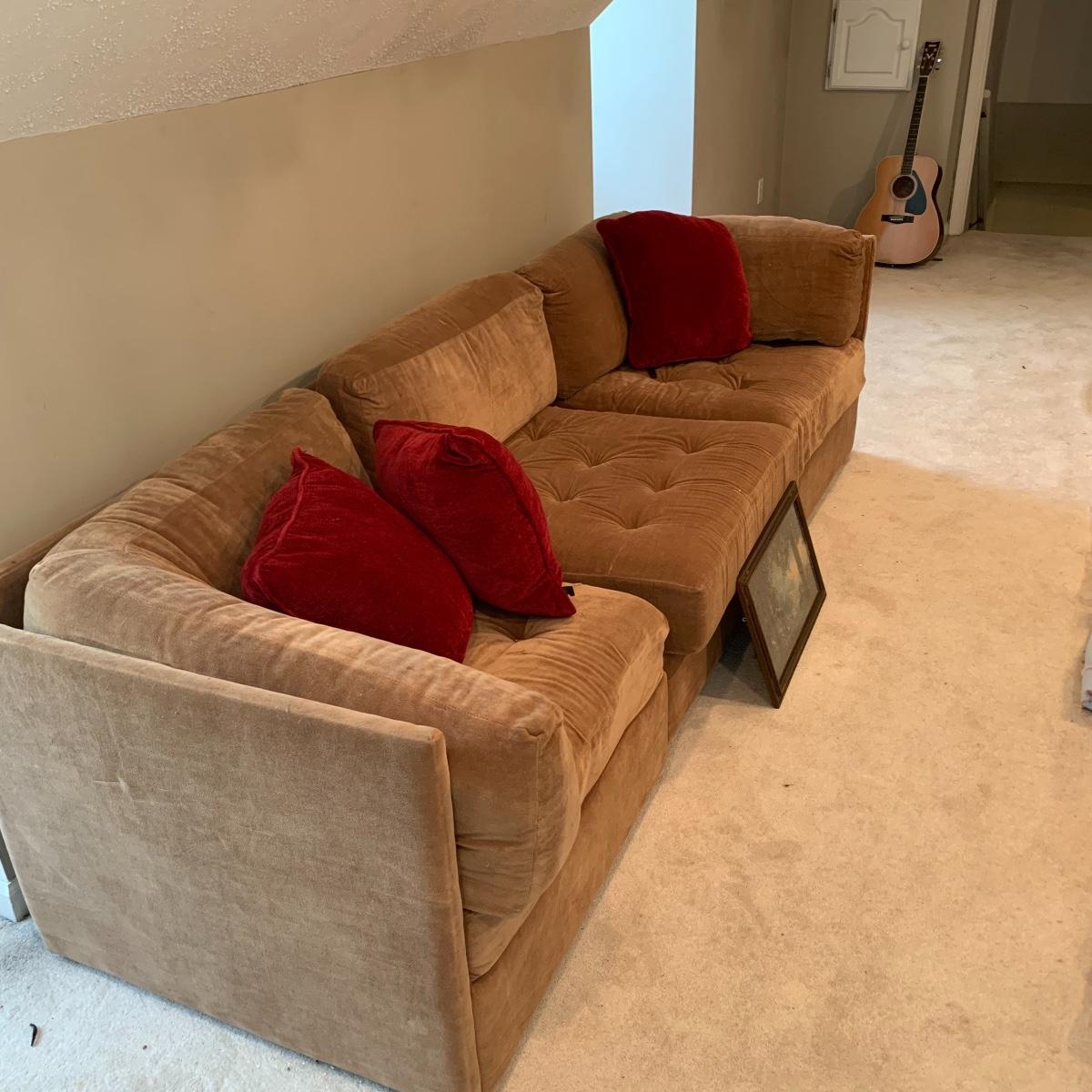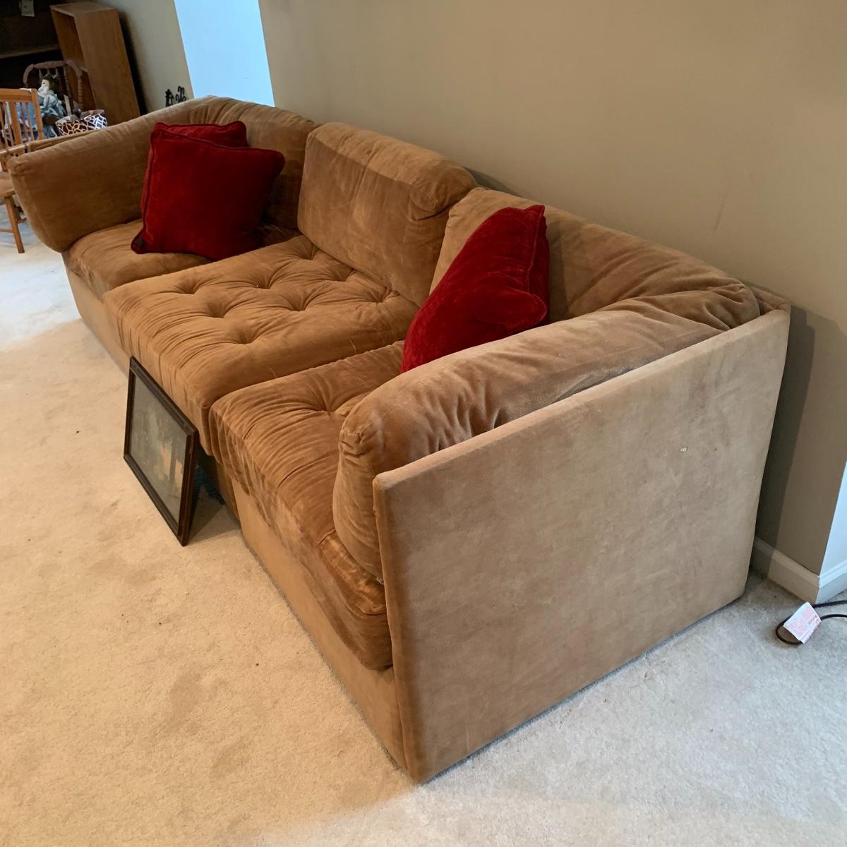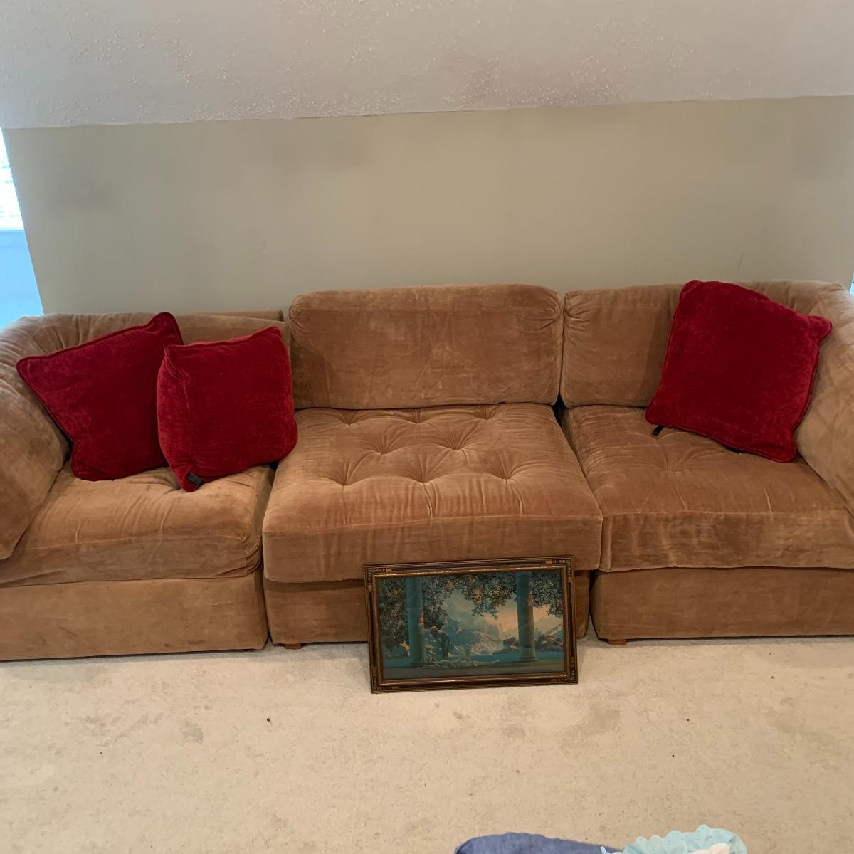 Relax on this soft, tan velour sofa made by Broyhill. This quality piece is a sectional and comes in three pieces making it a great versatile piece. It’s in good shape and is free of stains or tears. It measures 101” long X 28” tall X 33” deep. The seat height measures 16” tall and when the units are separated, each pieces measures 32” deep x 34” wide. The three red velour accent pillows are included. The picture is a beautifully framed Maxfield Parrish print and is 20” X 12”; it has a stamped signature. See pics for details. Please bring help to move this lot. Local pickup only.