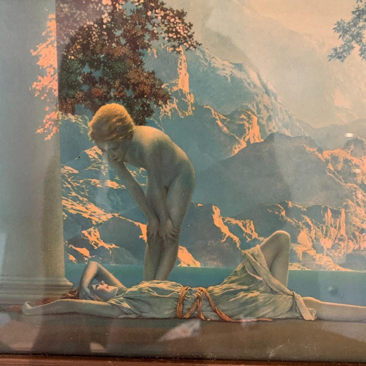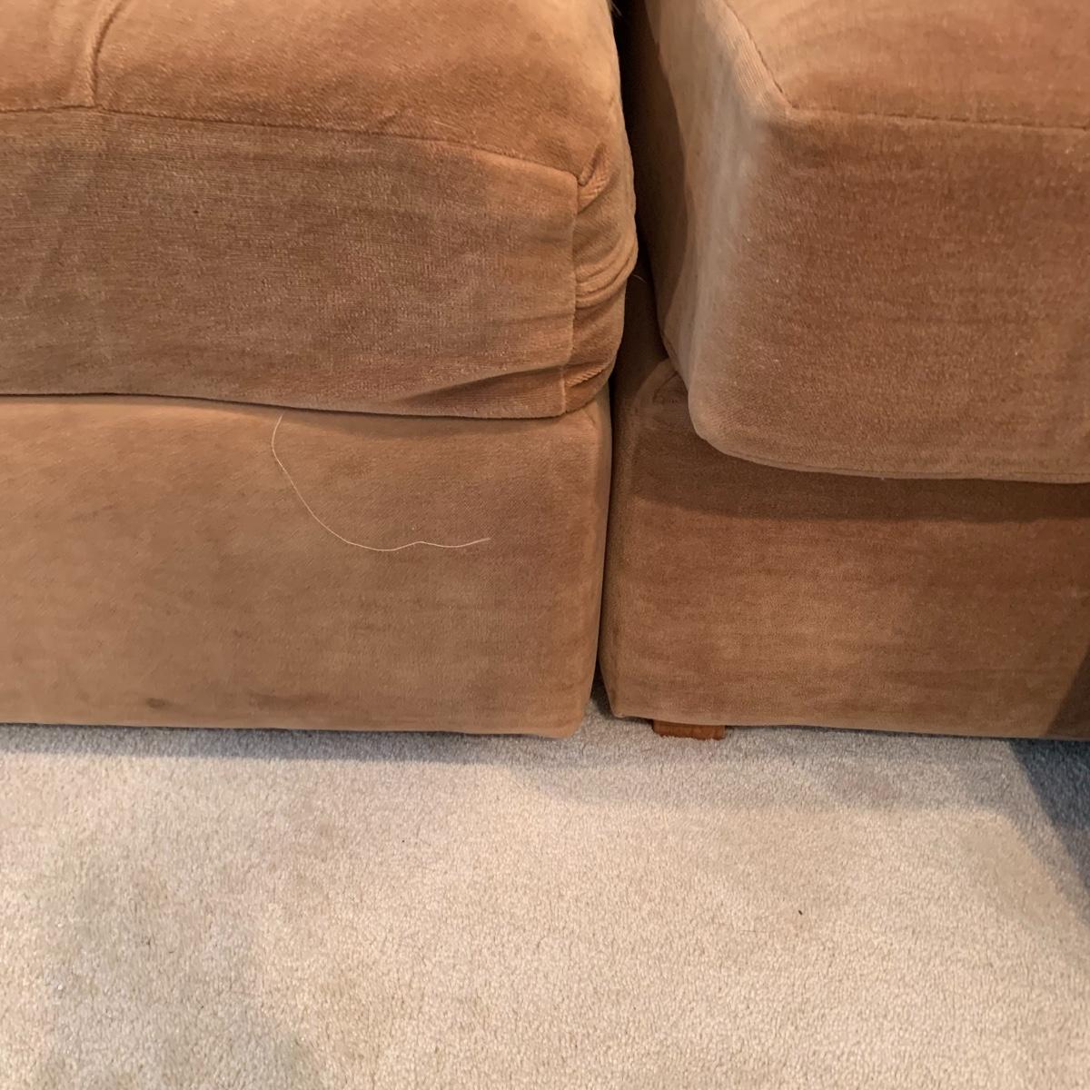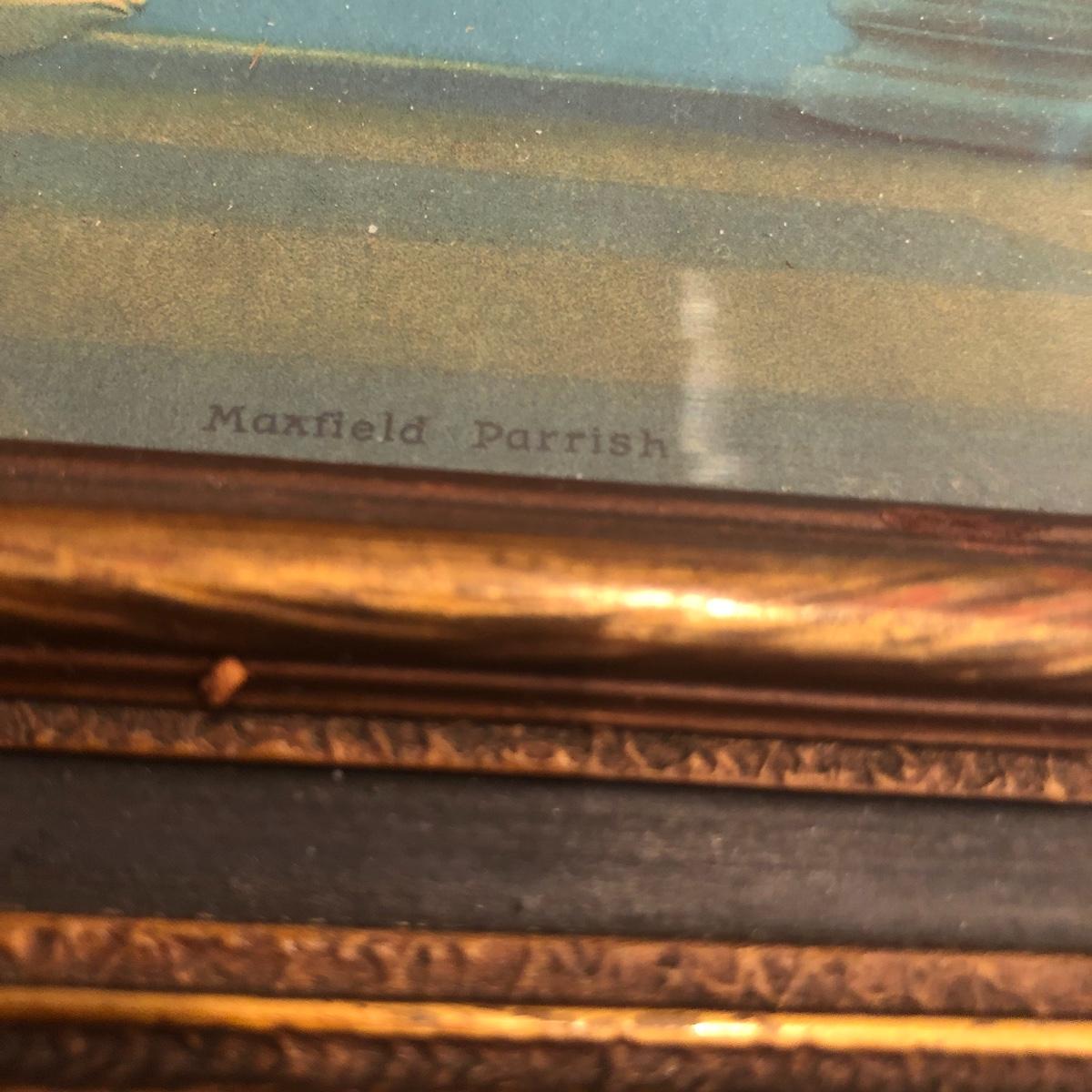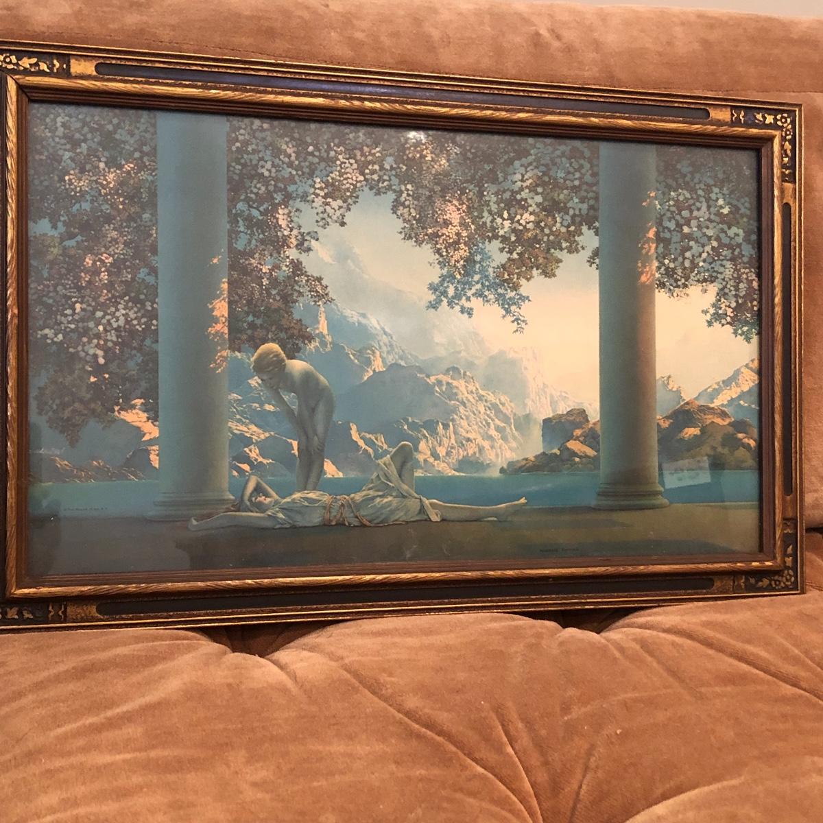 Relax on this soft, tan velour sofa made by Broyhill. This quality piece is a sectional and comes in three pieces making it a great versatile piece. It’s in good shape and is free of stains or tears. It measures 101” long X 28” tall X 33” deep. The seat height measures 16” tall and when the units are separated, each pieces measures 32” deep x 34” wide. The three red velour accent pillows are included. The picture is a beautifully framed Maxfield Parrish print and is 20” X 12”; it has a stamped signature. See pics for details. Please bring help to move this lot. Local pickup only.