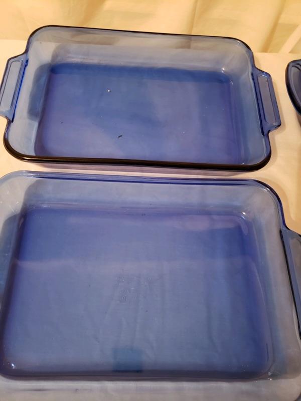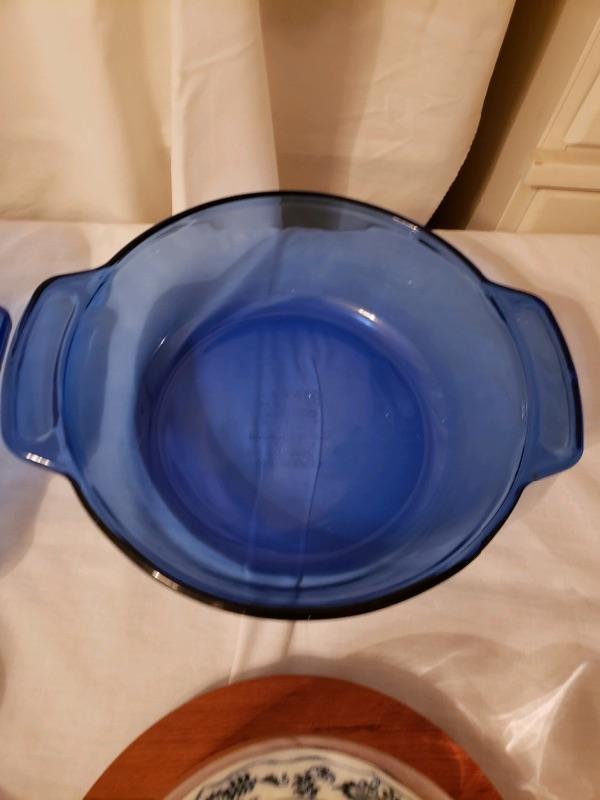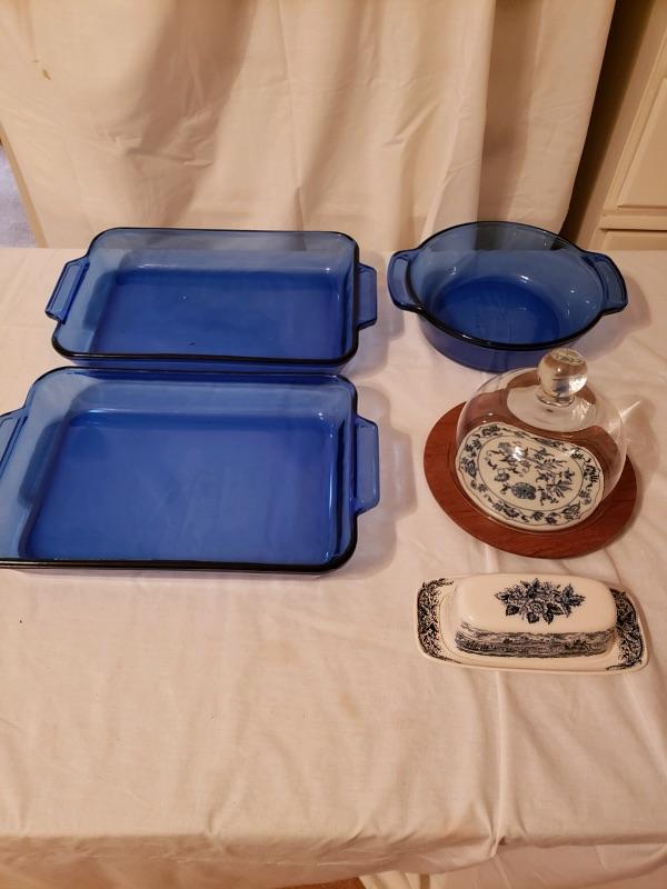 LOT #24. Cobalt Blue Lot C - 2 Anchor baking dishes 9 1/2 x 13 1/2, 3 quart; round Anchor casserole 9 inch diameter, 2 quart; teak & ceramic cheese server with glass dome; English covered butter dish Port of Dover scene