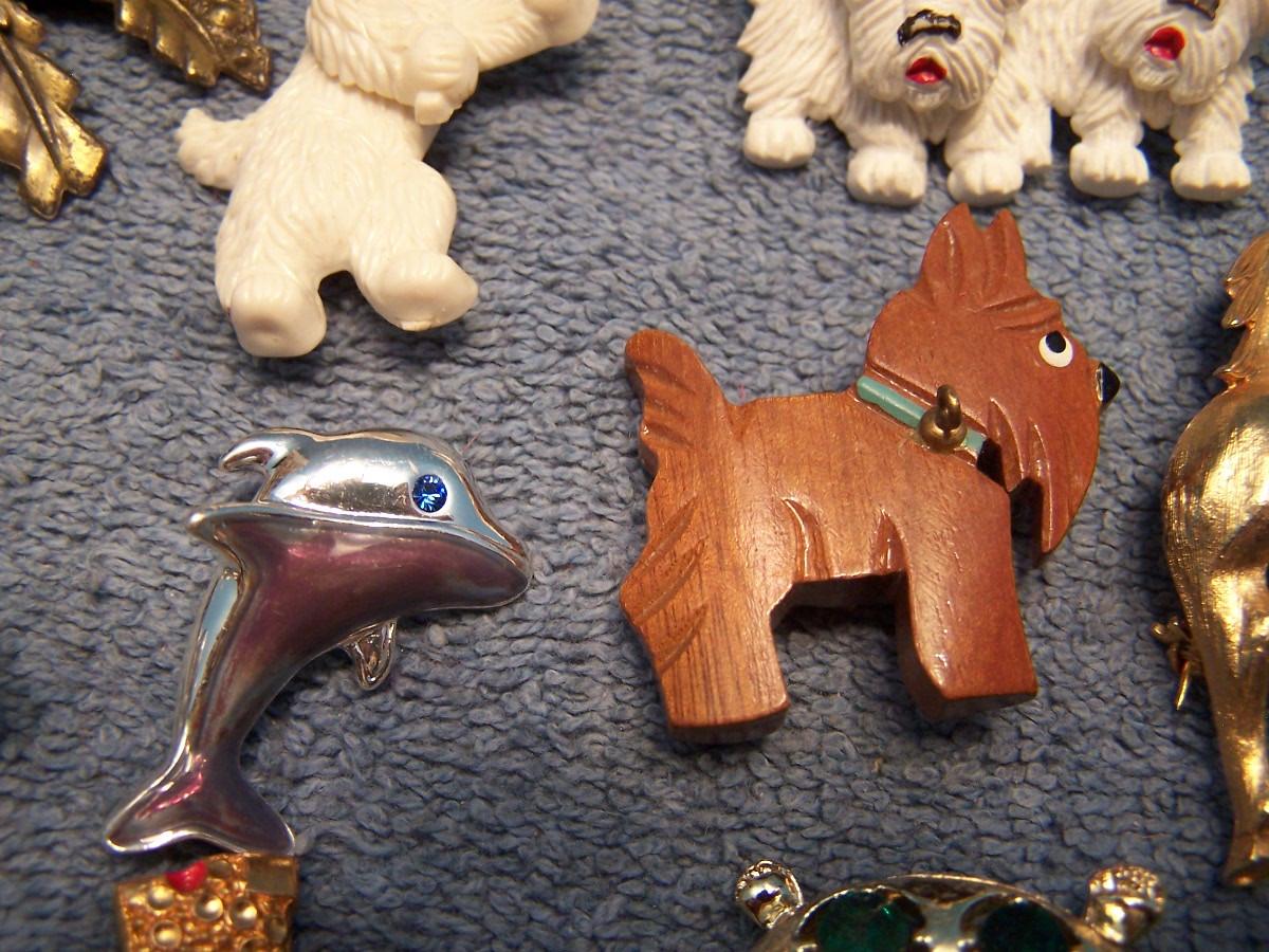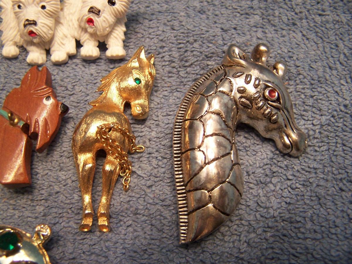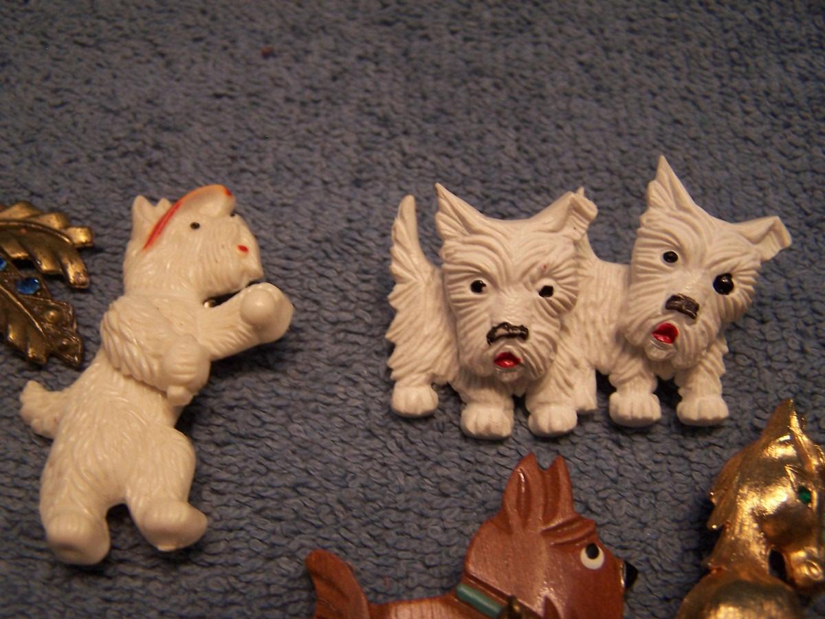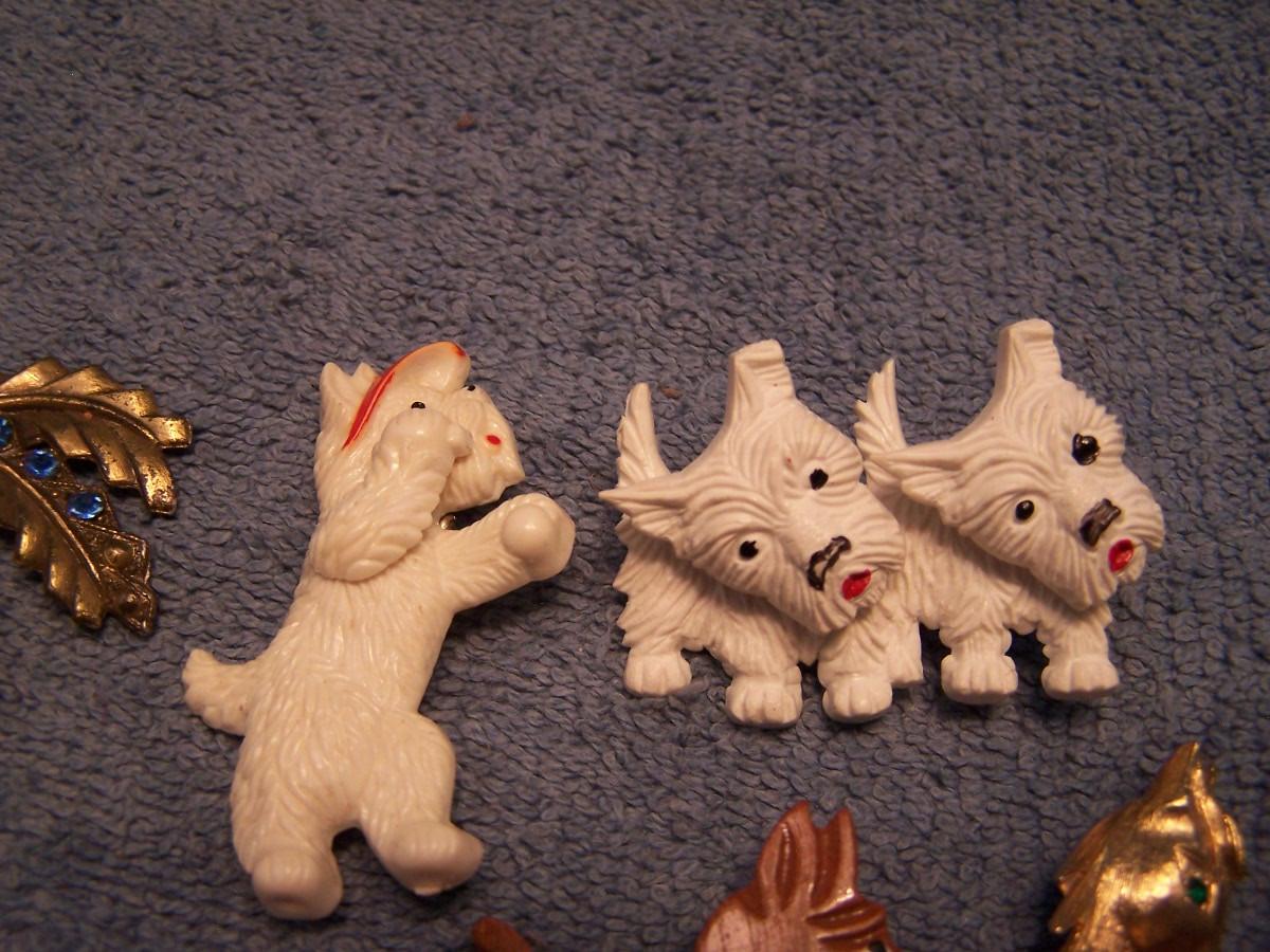 THESE ARE GREAT COLLECTABLE CRITTER PINS!!! MADE OF VARIOUS MATERIALS... UNMARKED.... THE WHITE PLASTIC SCOTTI DOGS HAVE MOVING PARTS. THE DOUBLE SCOTTI HAS A BROKEN CATCH... THE GIRAFFE PIN IS 2 1/4'' TALL... LIGHT WEAR...
