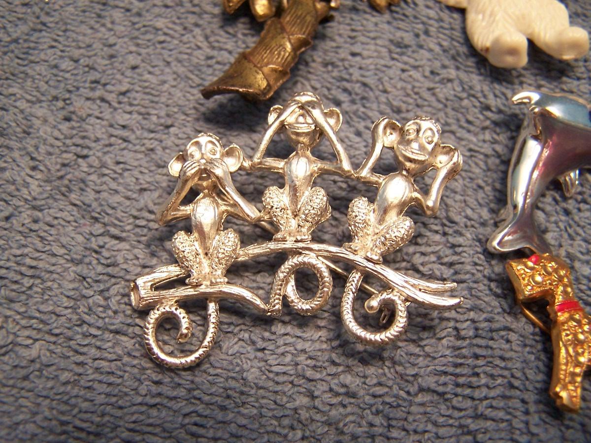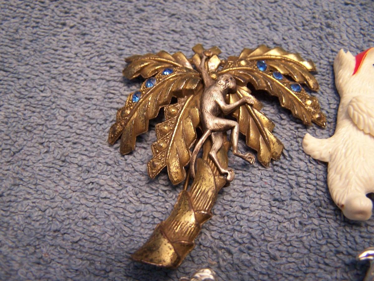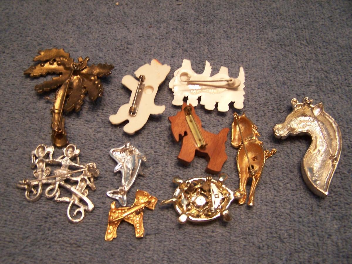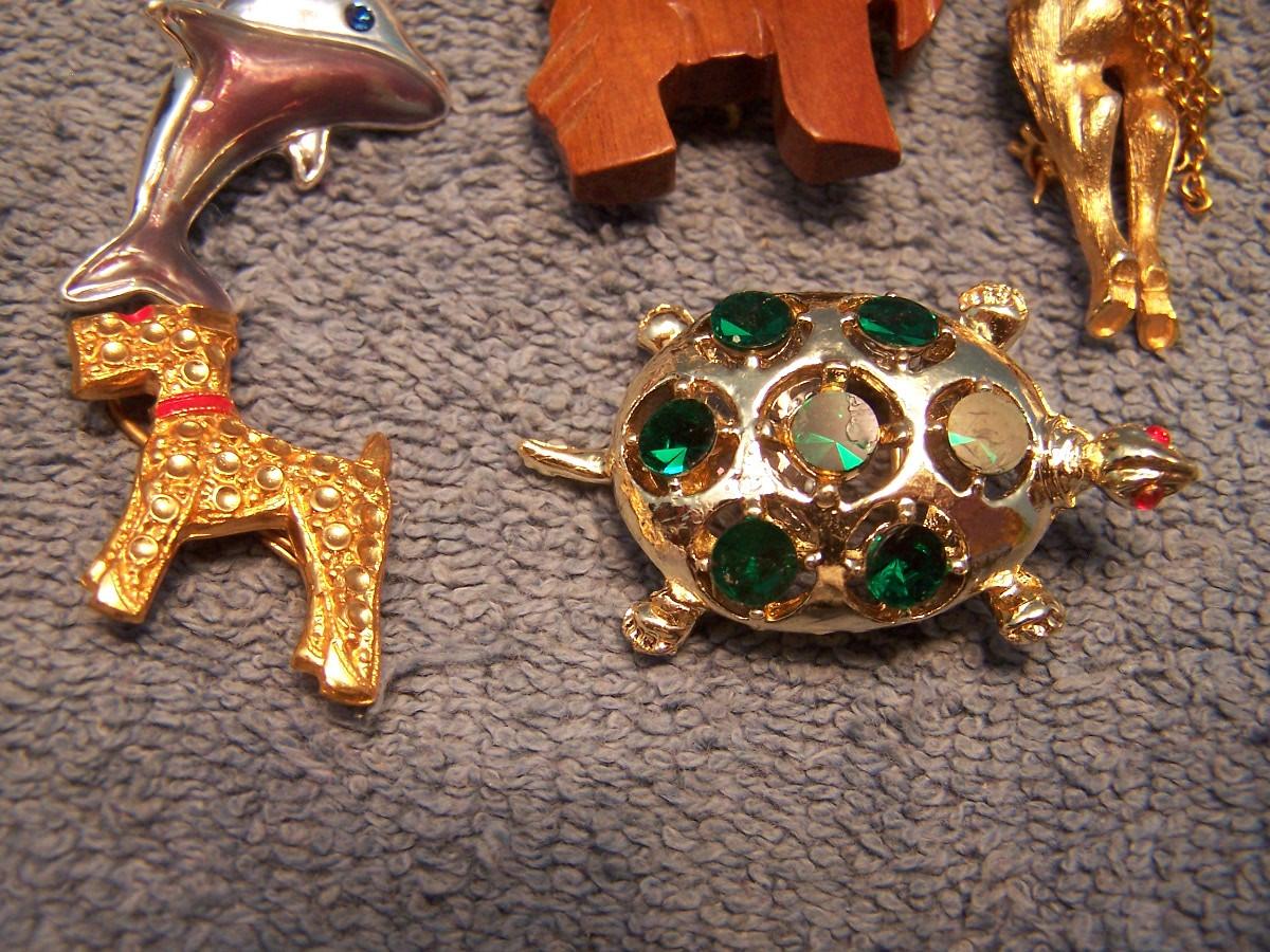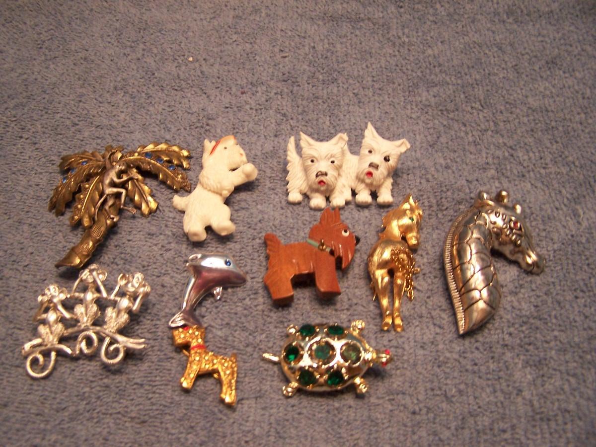 THESE ARE GREAT COLLECTABLE CRITTER PINS!!! MADE OF VARIOUS MATERIALS... UNMARKED.... THE WHITE PLASTIC SCOTTI DOGS HAVE MOVING PARTS. THE DOUBLE SCOTTI HAS A BROKEN CATCH... THE GIRAFFE PIN IS 2 1/4'' TALL... LIGHT WEAR...