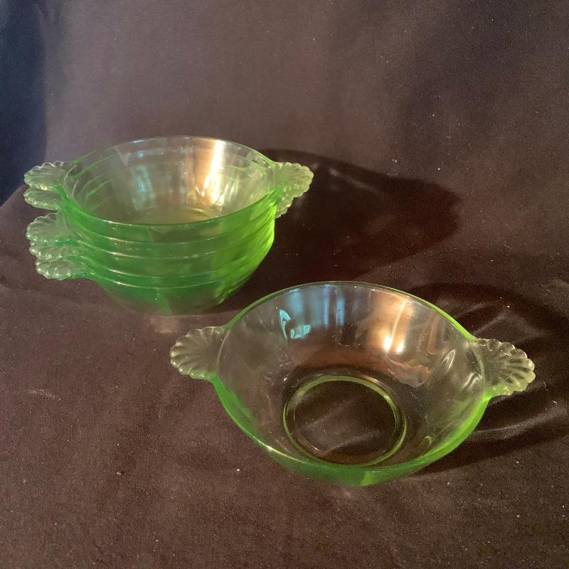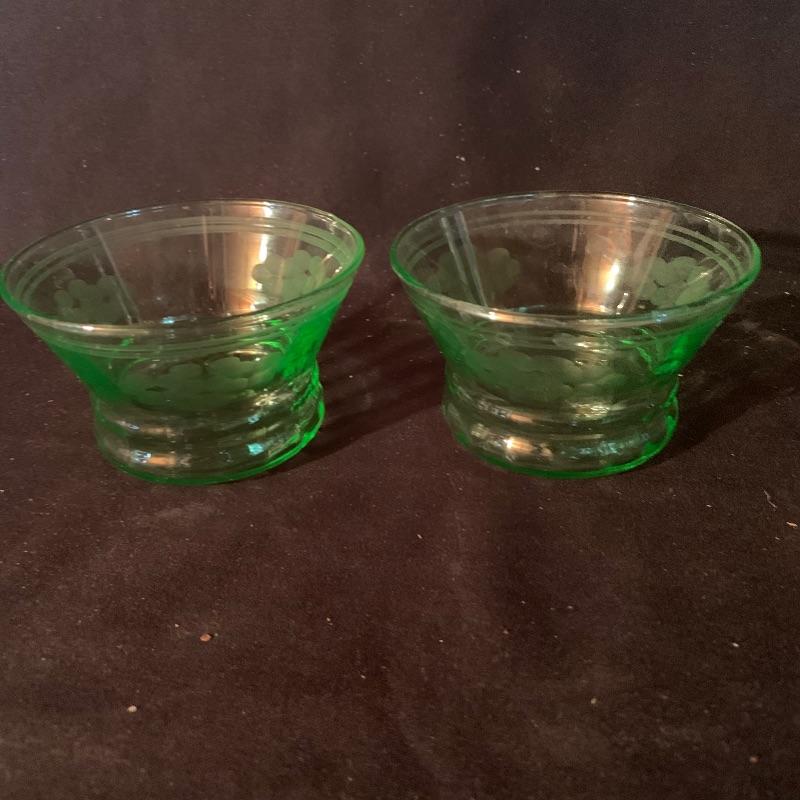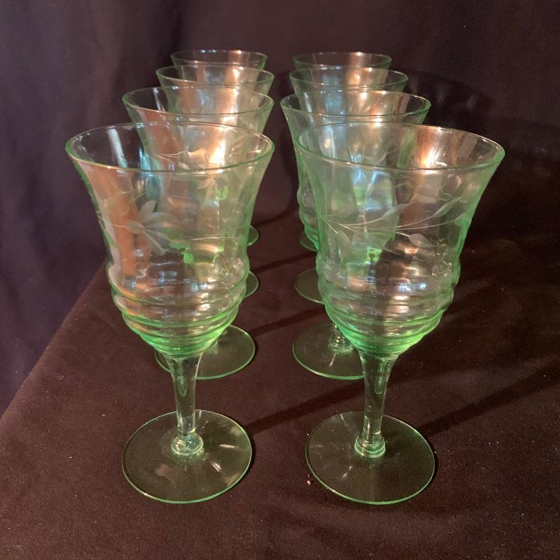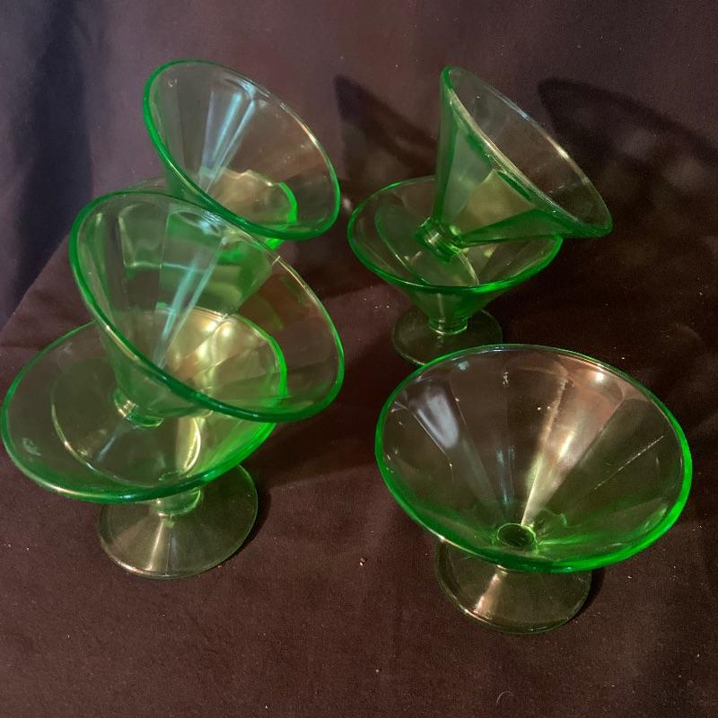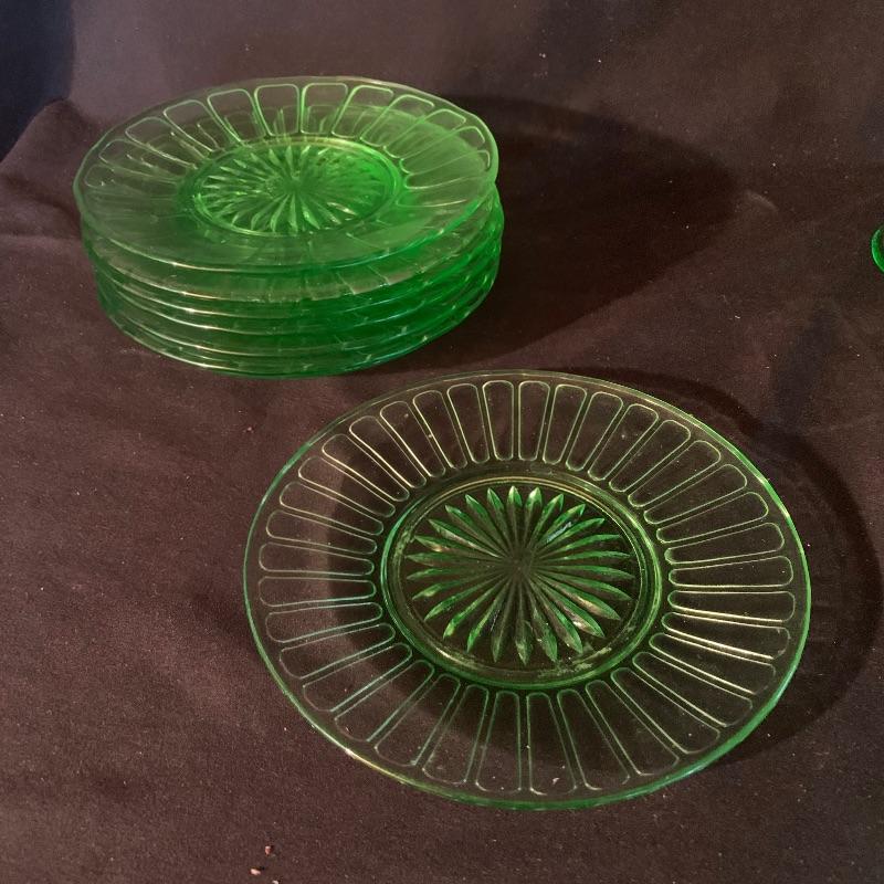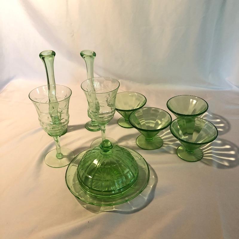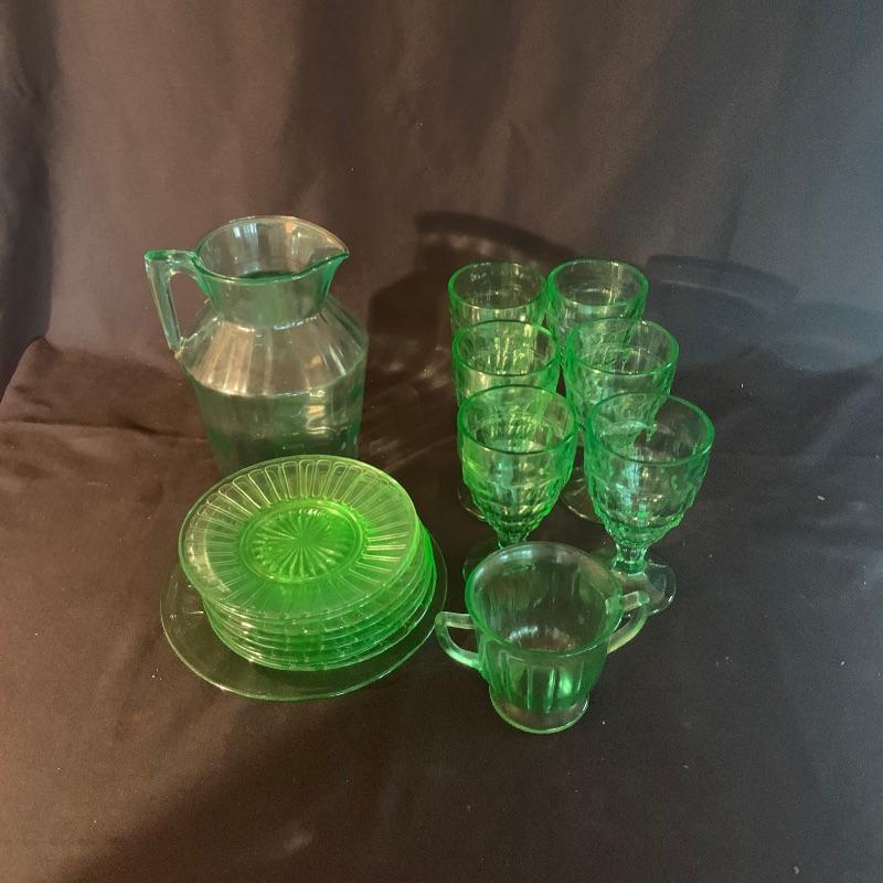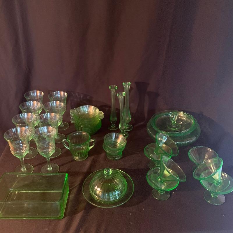 This lot has an abundance of beautiful green glassware, including Fostoria, Anchor Hocking, and possibly Depression and Vaseline glass ! This lot includes fourteen drinking glasses, seven Jell-o glasses, eight small plates, two serving bowls, a storage container, two teacups, a large pitcher, three slim vases, and eleven small dessert bowls, and more, for a total of fifty-one total pieces. These unique pieces will really make a statement in any kitchen, and will spice up your collection of glassware. Local pickup only.