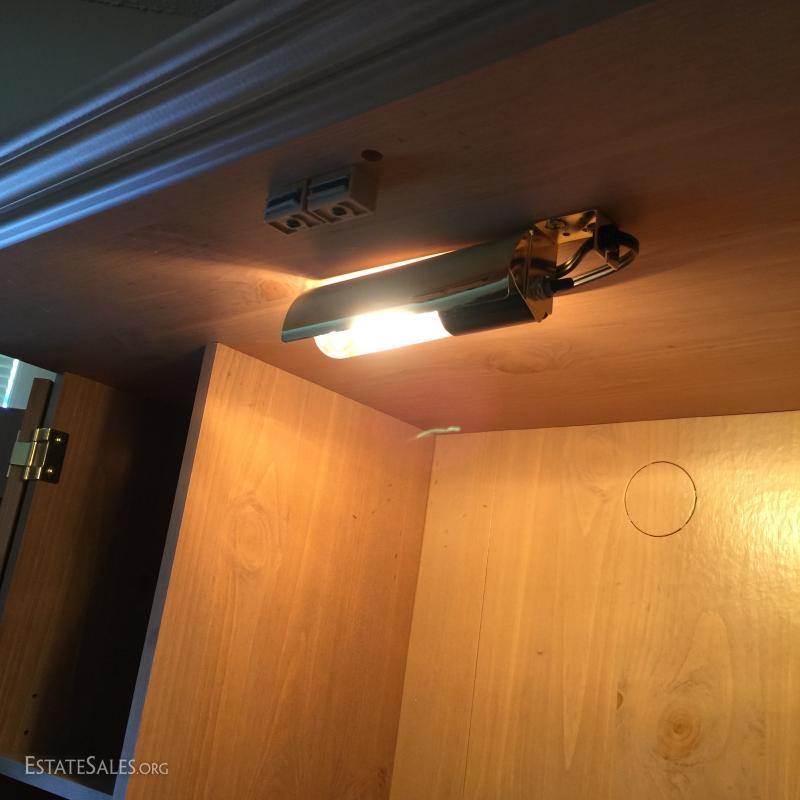 with built in light fixture. Man made materials and very sturdy. Unit measures 42"Lx23"Wx73"H, when opened right side extends out to 26" and left side to 21".