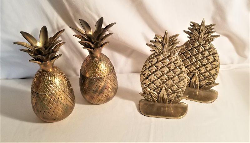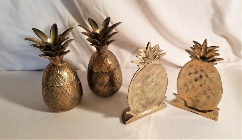 Nice solid brass lot here, all with a pineapple motif. Pair of bookends - measures 6.75" tall and 4" wide. Pair of figural pineapples with lids measures 7" tall. Good condition.