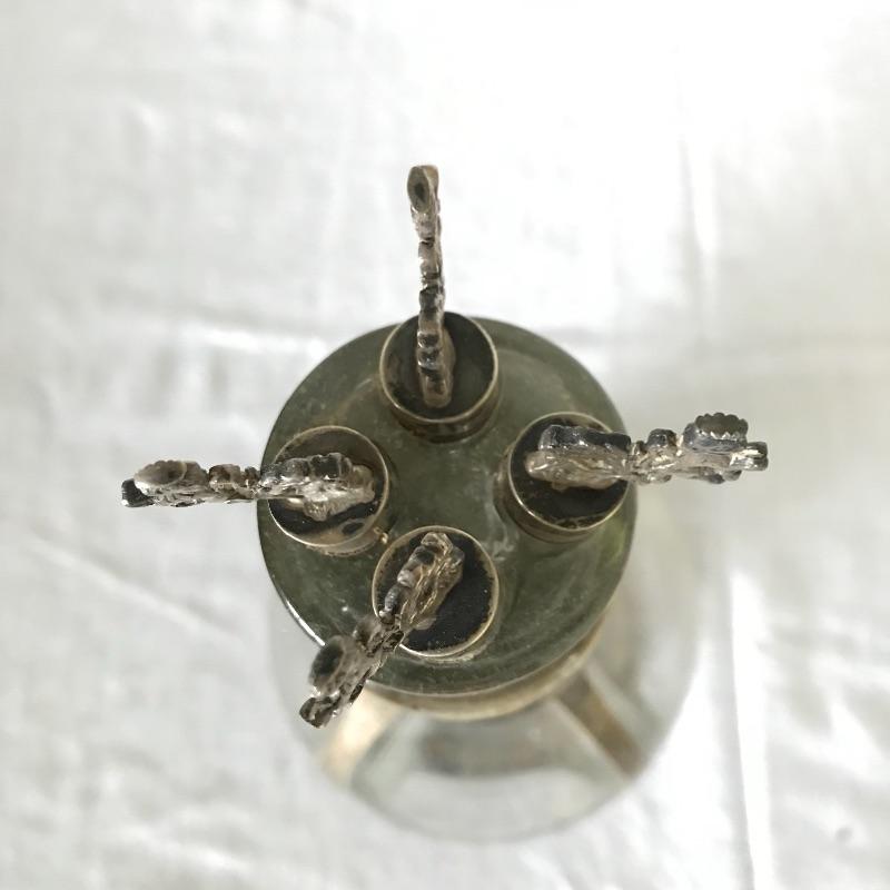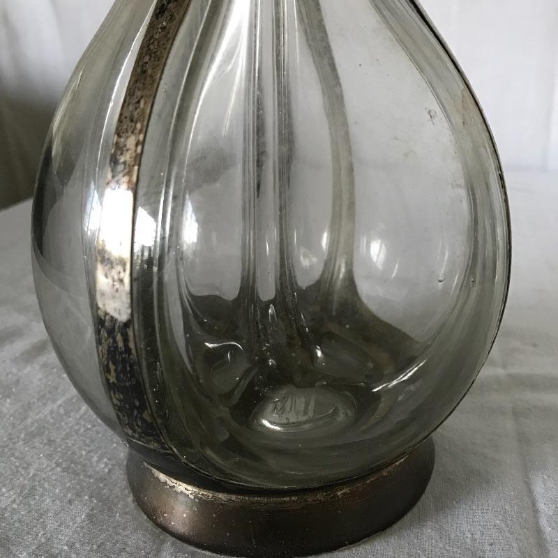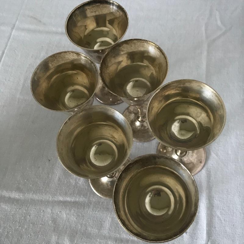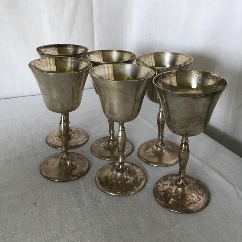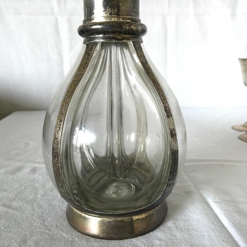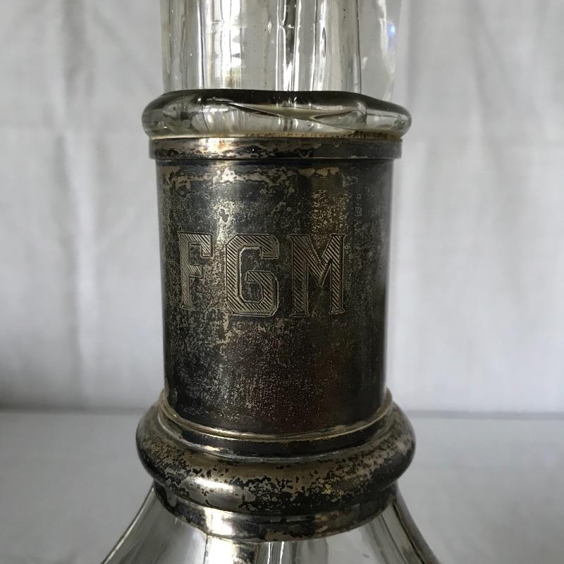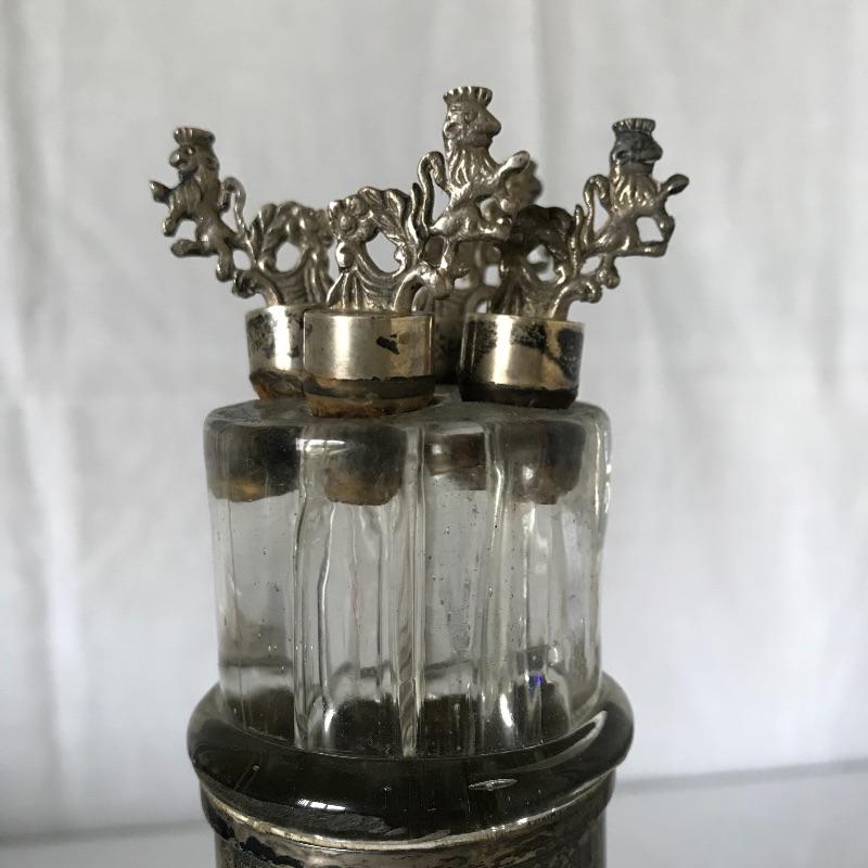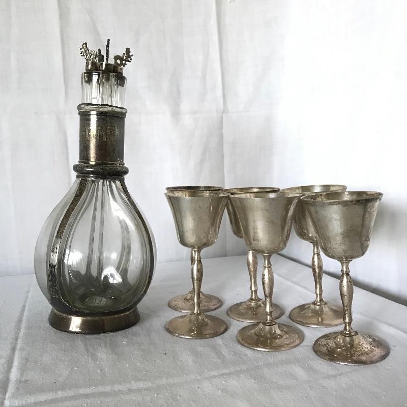 Awesome and unique four compartment blown glass and silver pitcher. The pitcher is one piece with four lion stoppers. The cork on the stoppers is worn and would need to be replaced if used for consuming beverages. The silver frame has FGM engraved in the neck. This piece has a substantial weight and the amount each compartment holds is not known. The decanter is paired with six Leonard EPNS goblets. Goblets have a nice weight to them and would definitely glam up your next event. See photos. Shipping available.