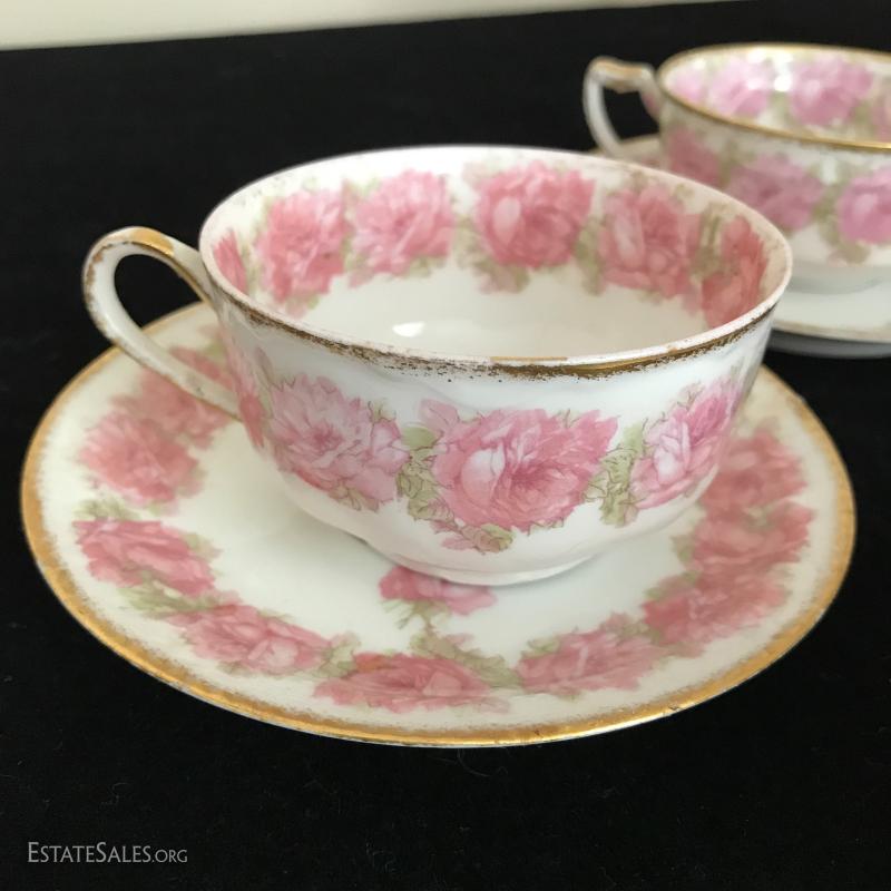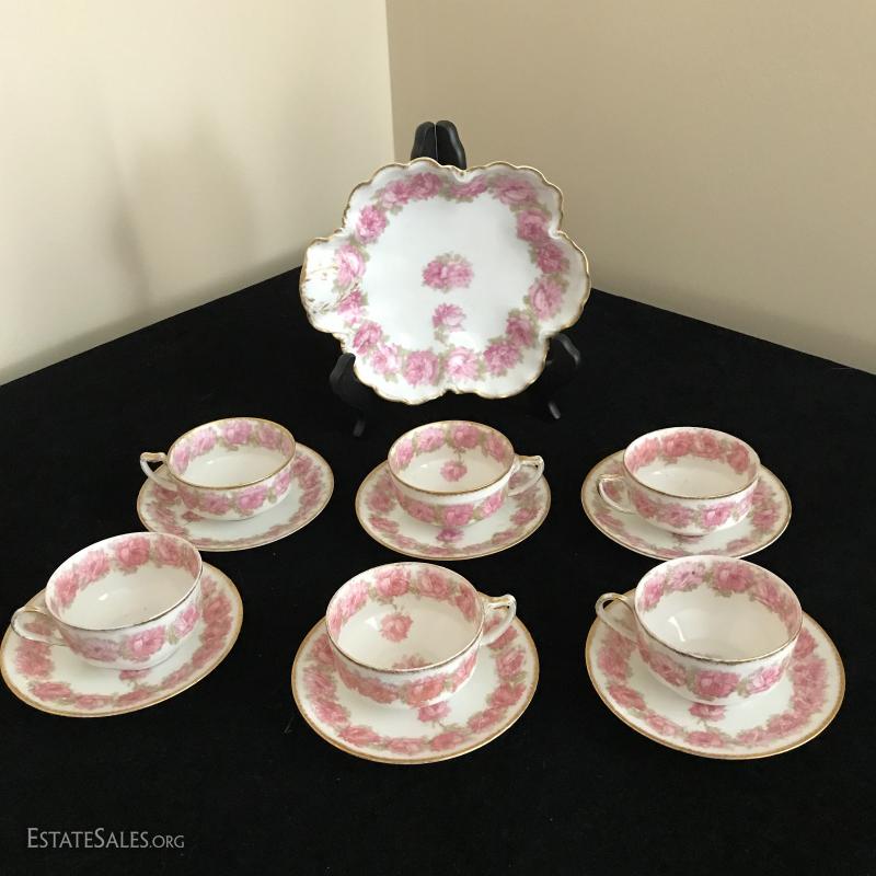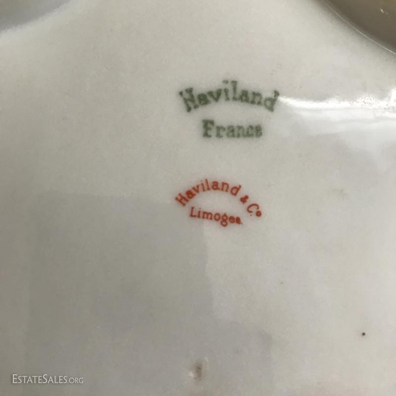 China tea set with six cups and saucers plus fluted serving plate. Markings say "Haviland France" and "Haviland and Co. Limoges". Gold plate worn on edges and handles but no visible chips or cracks.