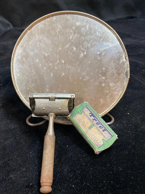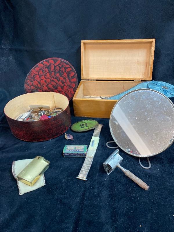 1940’s shaving mirror, Gold aria lighter and more packaged in a beautiful wooden box. Please see all pictures for condition of the items listed and what is included in the lot. Pictures will also show any measurements if taken and is the best representation of the items. Thank you for looking and have fun bidding! We appreciate Treasure Hunters!