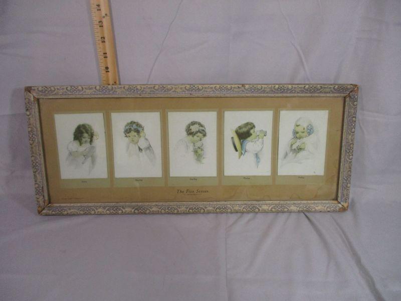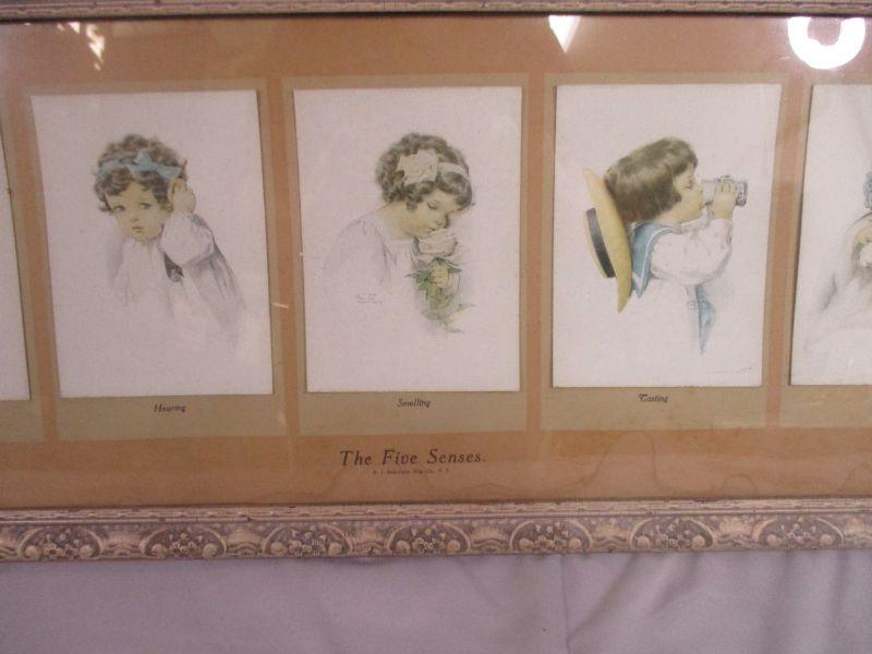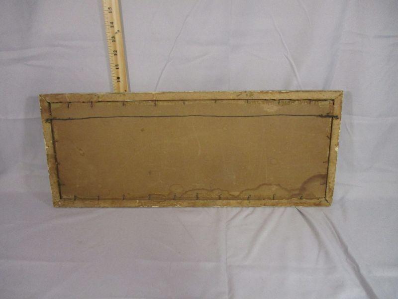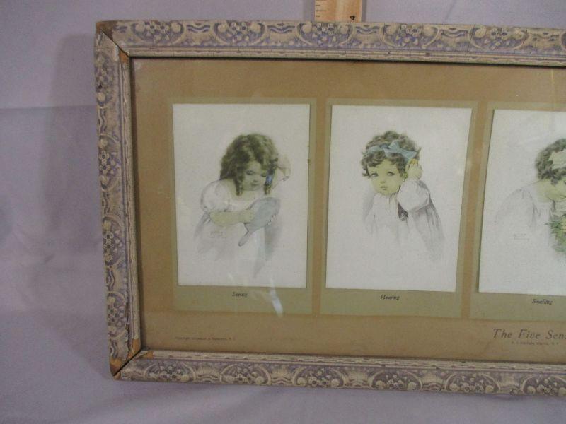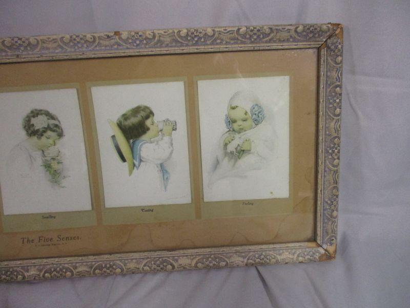 This is copyrighted "Gutmann and Gutmann" and measures 23.5" x 9.5". There is some water damage and frame damage visible, but the overall effect is still sweet. The pictures are actually cards that are attached to the background.
