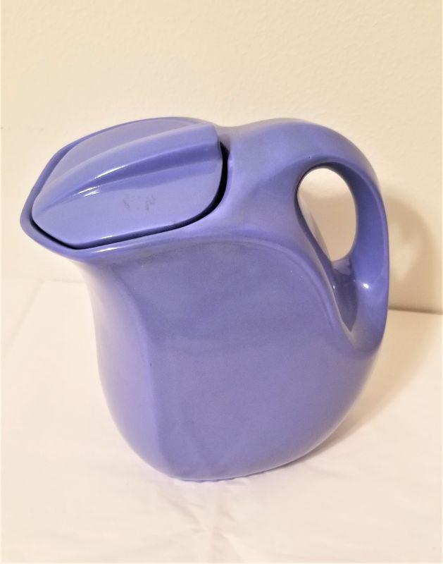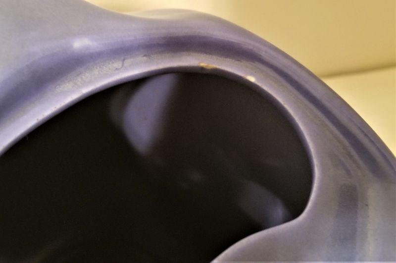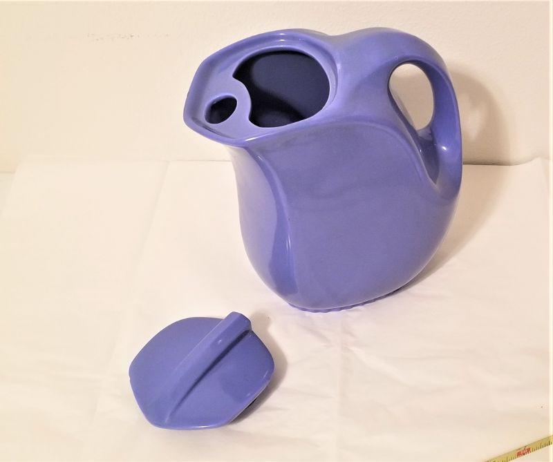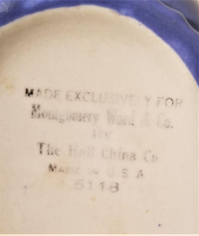 This piece has a purple case in the photos, but it's blue. HALL brand, made for Montgomery Ward. Two very small firing errors - not chips - as shown. About 8" tall.