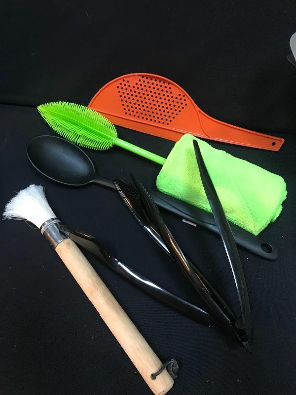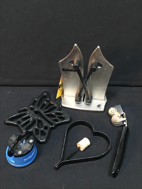 Keureg model B60, cooking utensils, an Ermetico glass gallon jar, with a wire snap lid, made in Italy, a cast iron butterfly trivet, knife sharpeners, travel cups, one with braided handle, and more. Please see all pictures for content of the lot, condition of the lot, and measurements if taken. Pictures are the best representation of the items listed and items are untested unless indicated in description. Thank you for looking and have fun bidding!