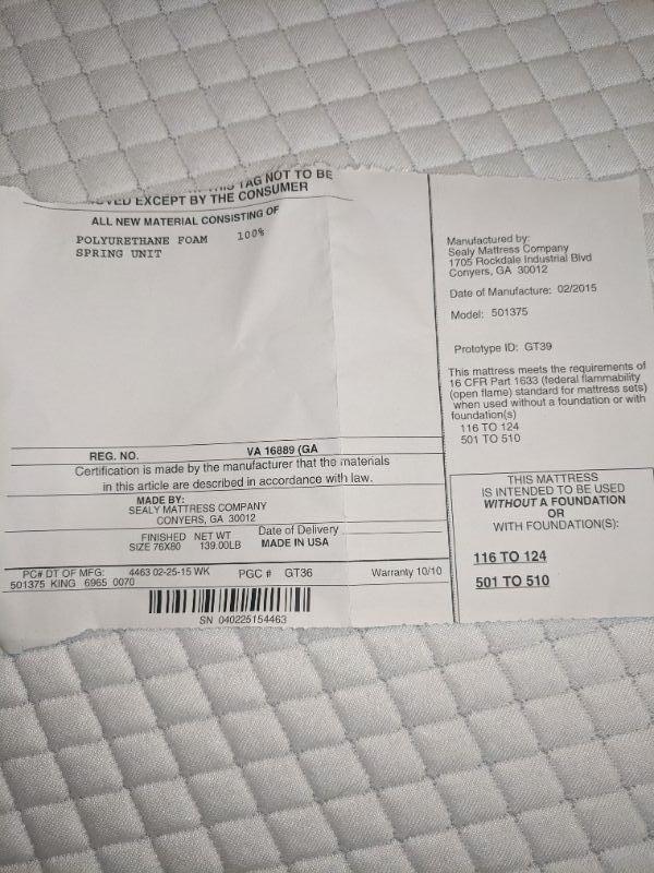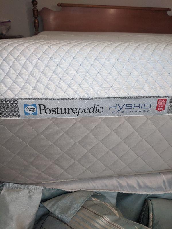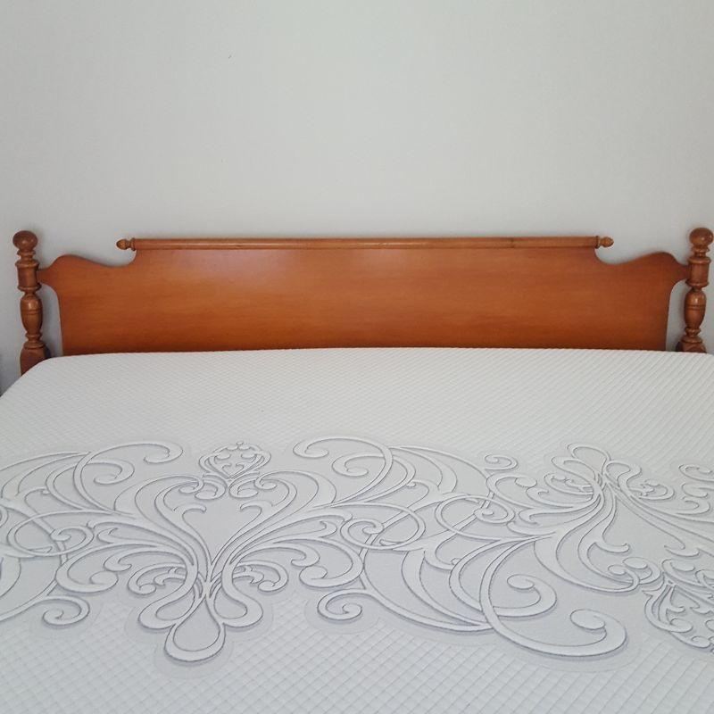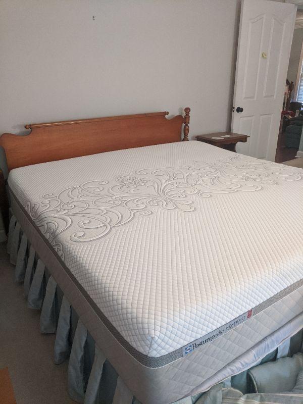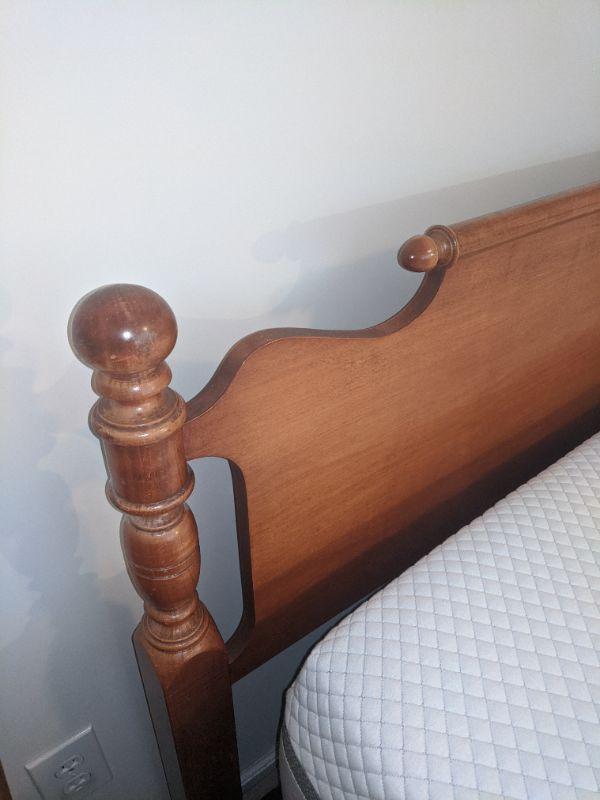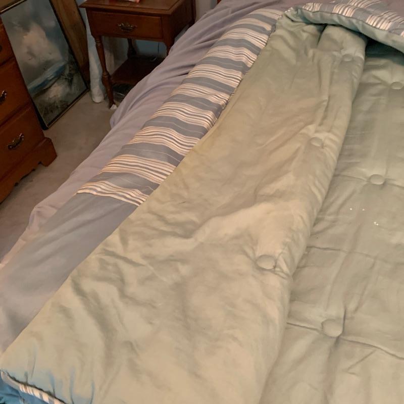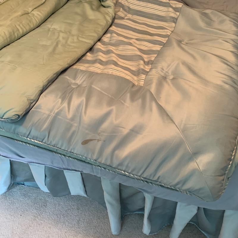 This lot includes a wooden headboard fit for a king! The headboard measures 78" wide and 38" tall.. The mattress is available also for free if highest bidder wants it. Lovely sea foam green satin bed spread,bed-skirt and sheet set also included. Spread has a stain and a little discoloration on the underside, see images. Local pickup only.
