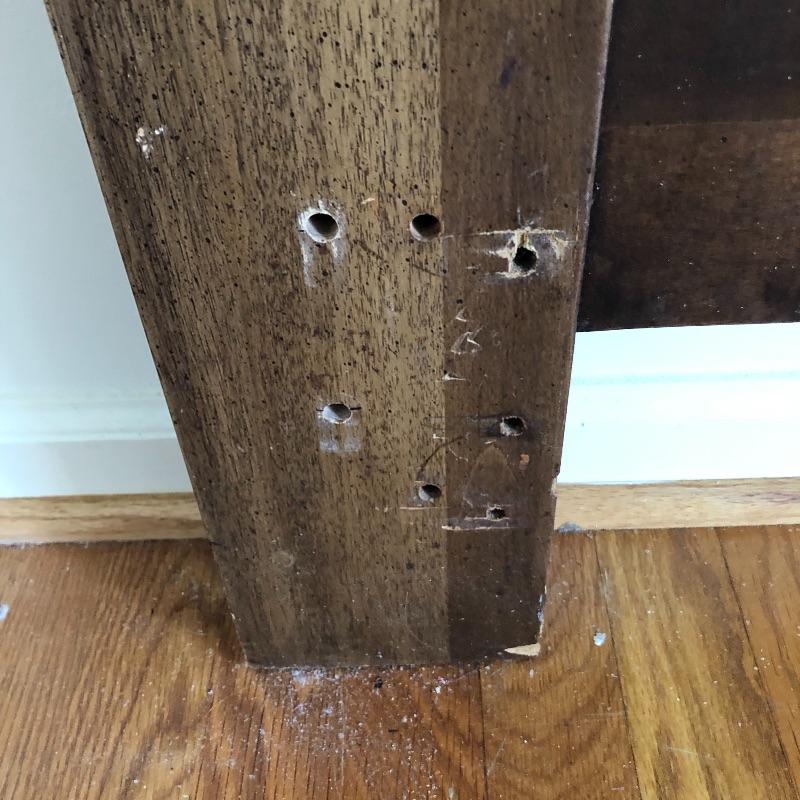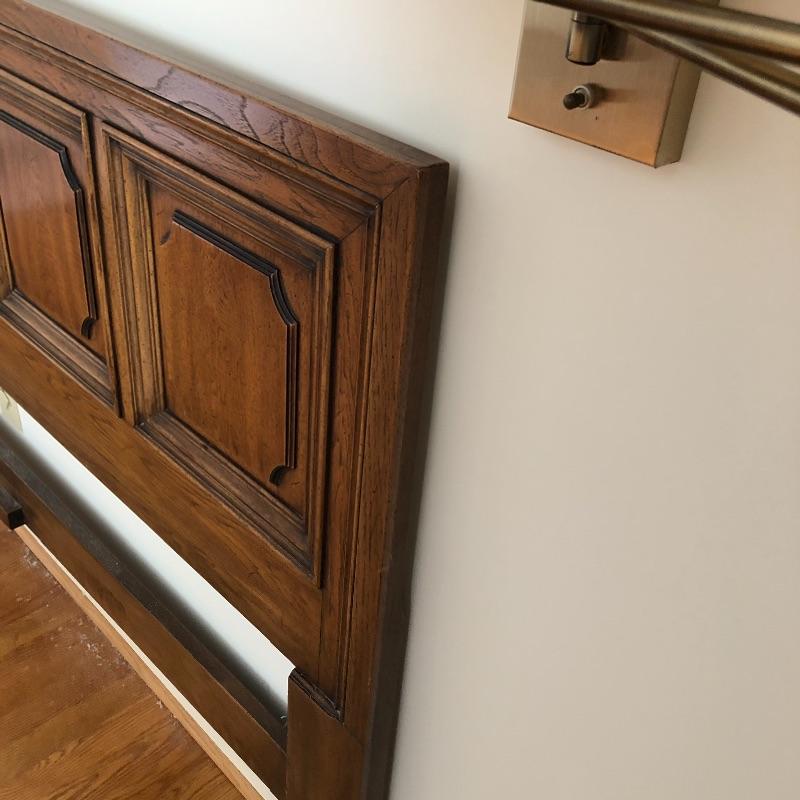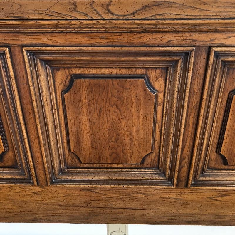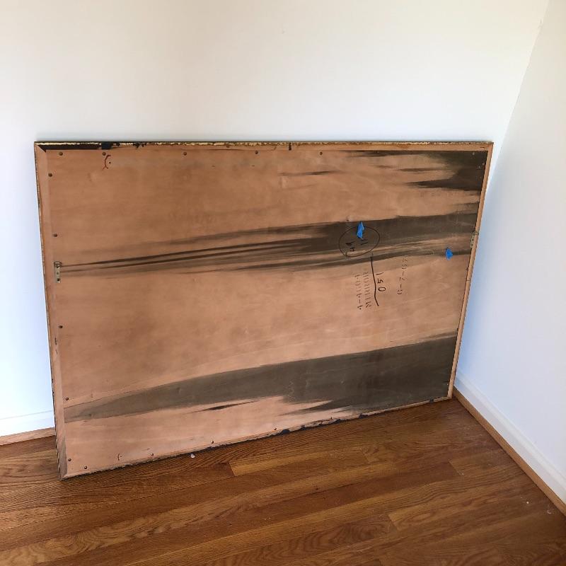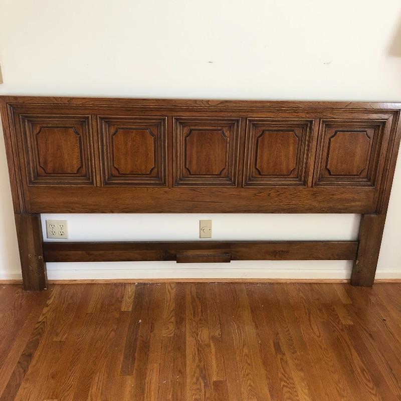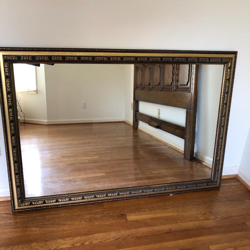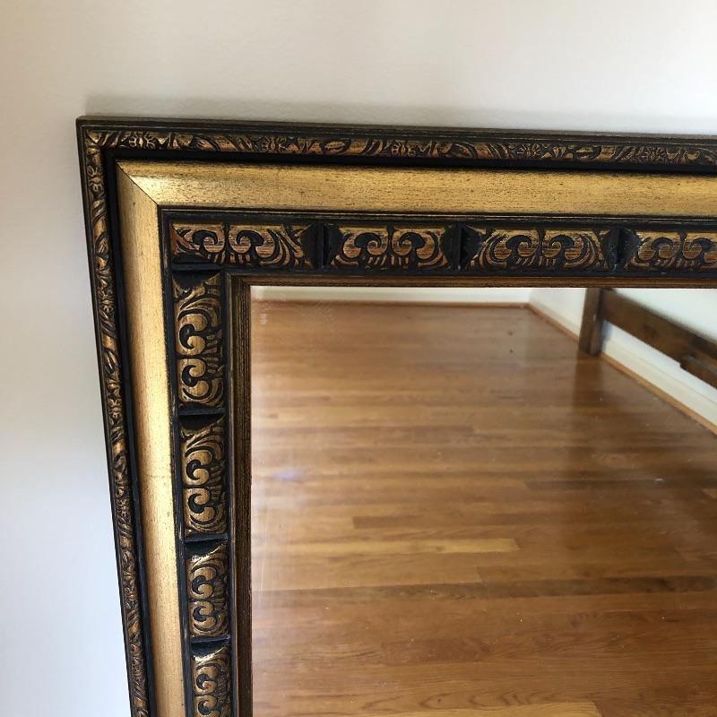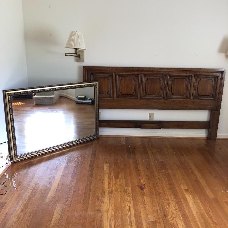 This king size headboard matches the pieces in lot 22. It’s a beautiful piece in excellent condition. There are no side rails, but it does look like ones were attached at some point. We have paired this with a large elegant gilded framed mirror that measures 50” wide x 35” tall.