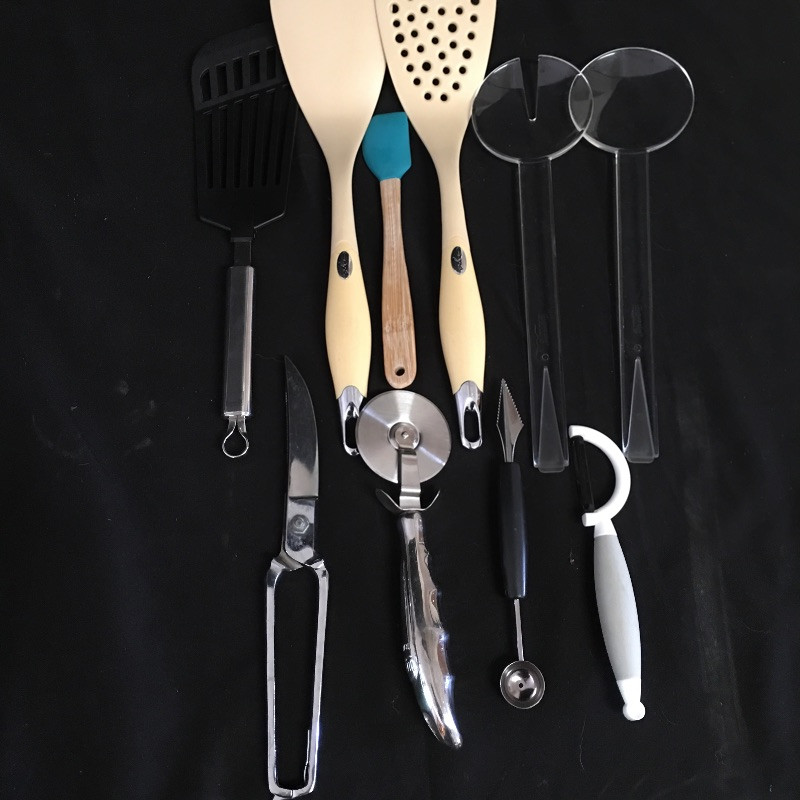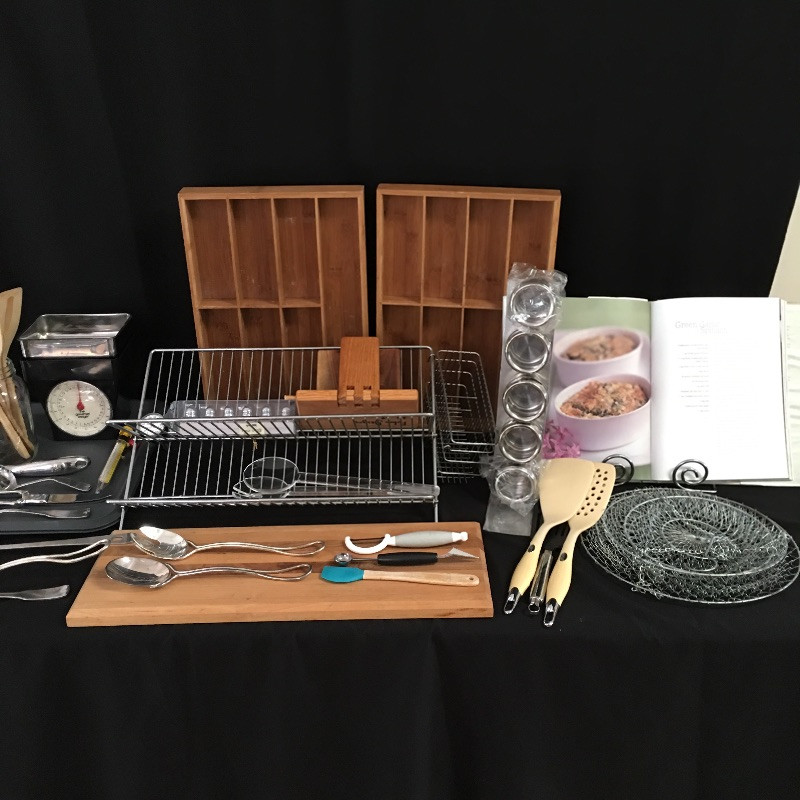 This large assortment of kitchen essentials will for sure have things you have been needing and things you never even knew you needed. Included in this lot is a folding drying rack, scale, salt shakers, cutting board, wooden utensils, recipe book, collapsible hanging baskets and much, much more.