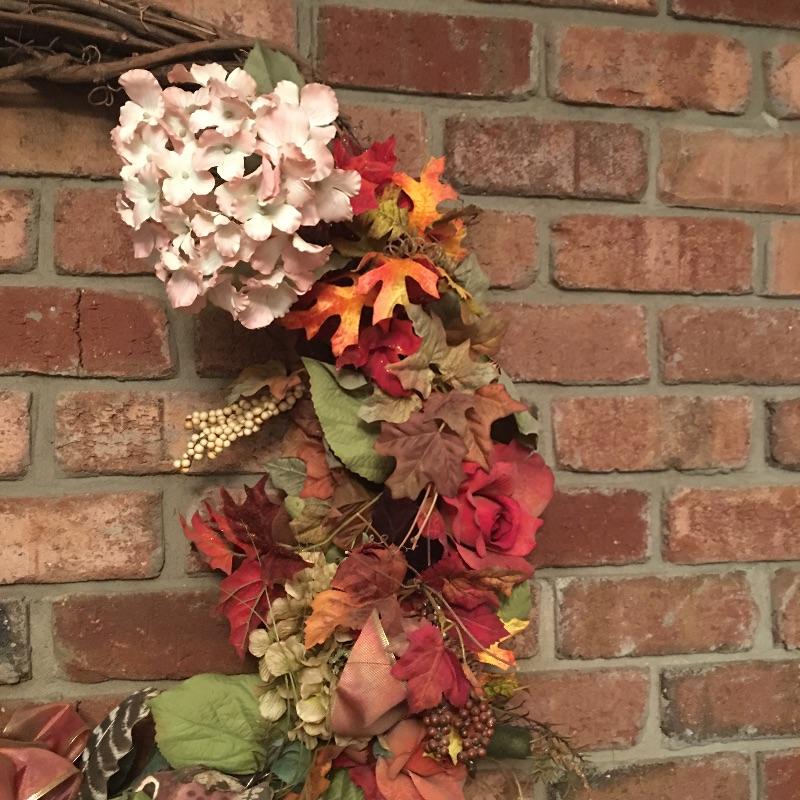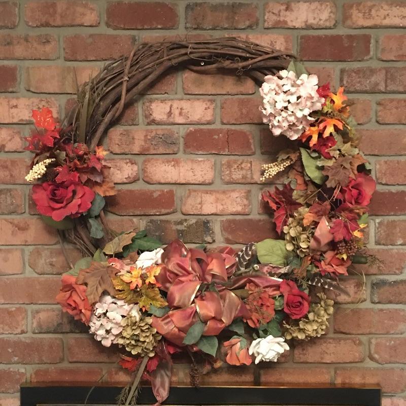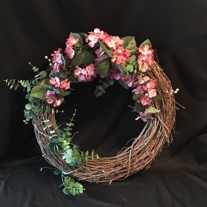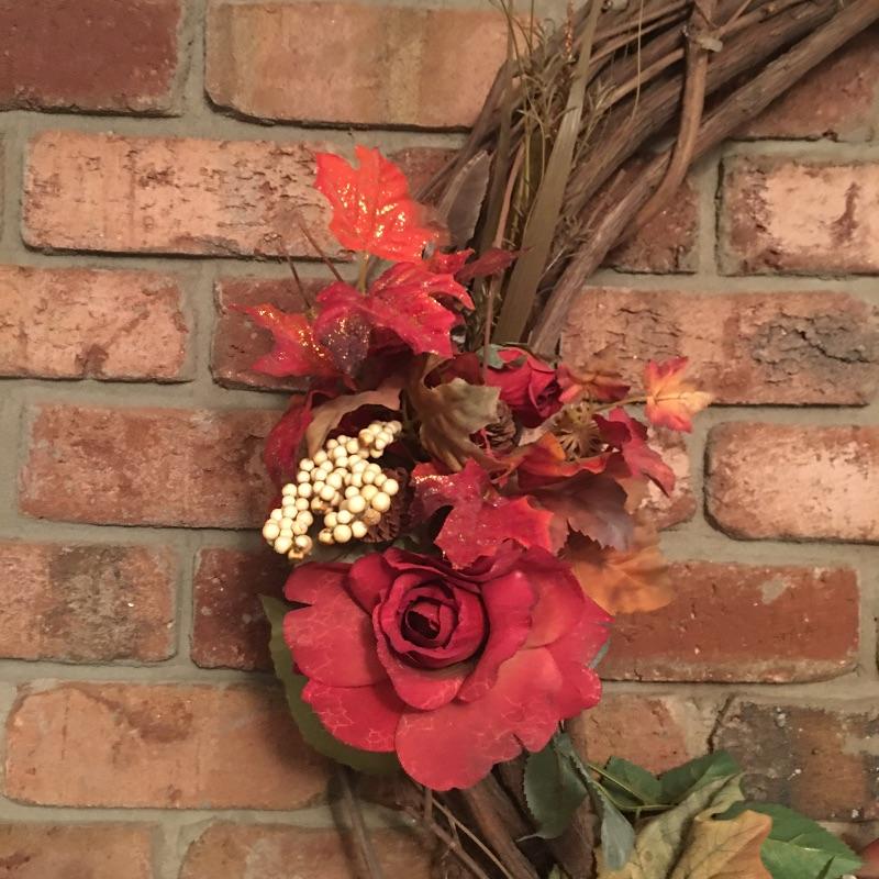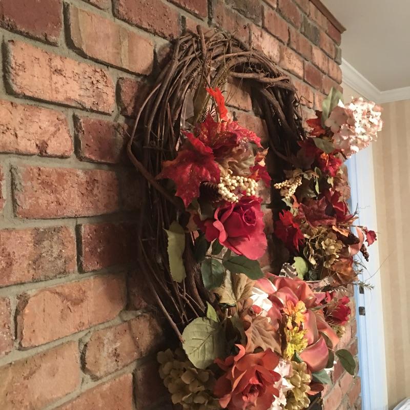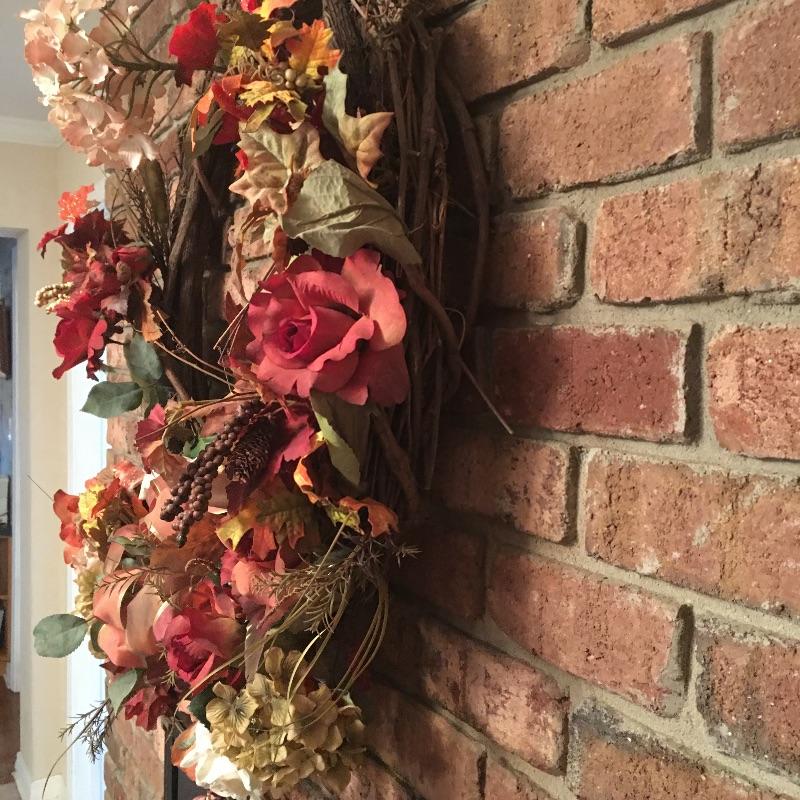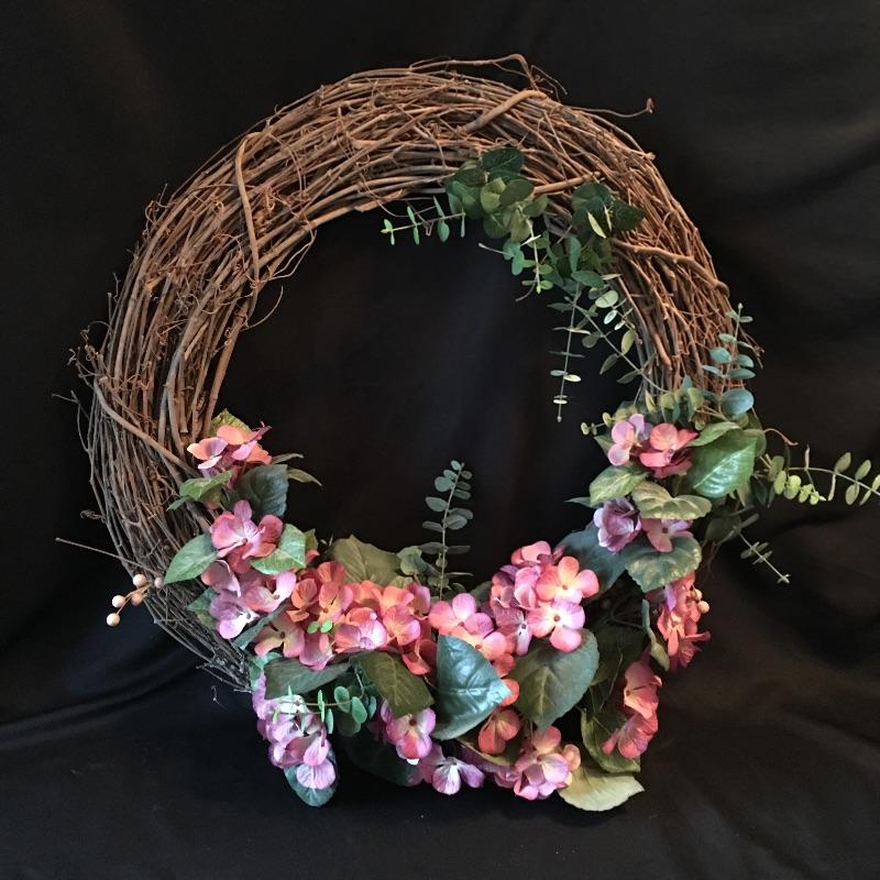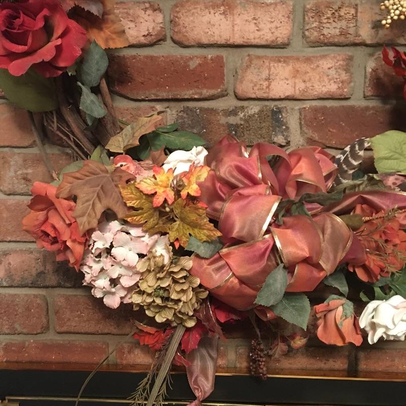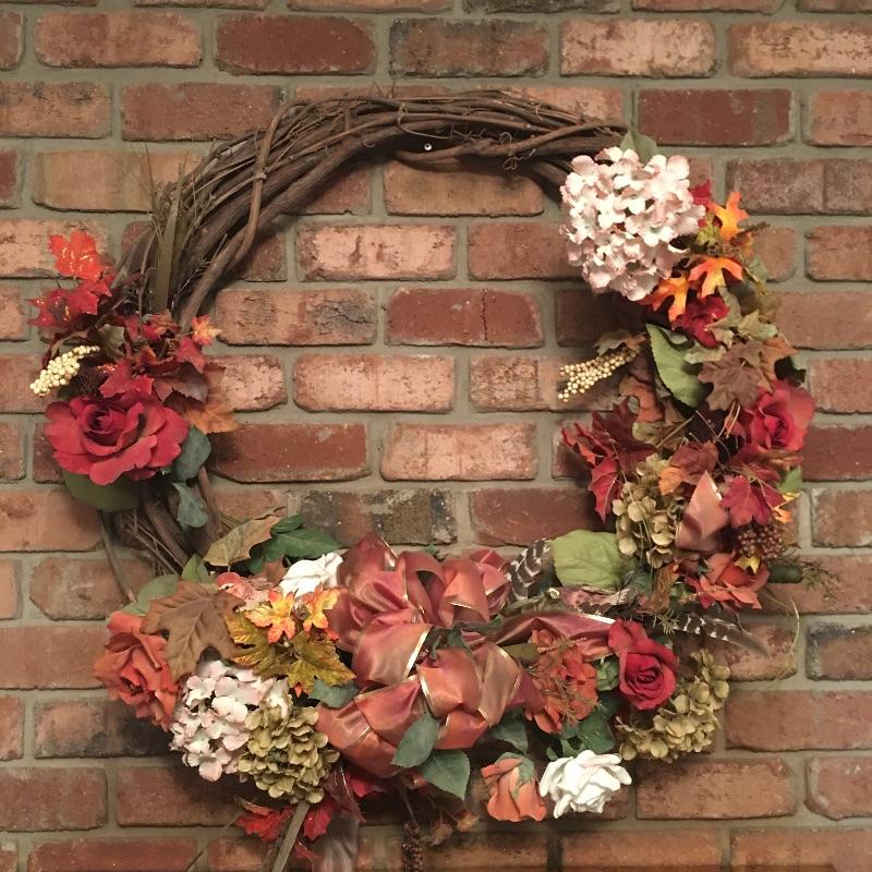 Lovely large wreath with faux flowers and a ribbon attached to what appears to be intertwined vines and a smaller wreath with faux flowers in the same style . A lovely way to brighten up your home. Largest wreath measures 33”D x 11” deep.