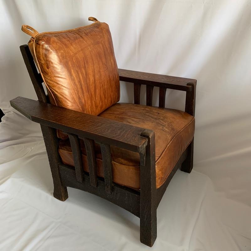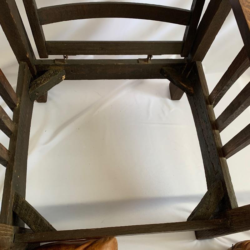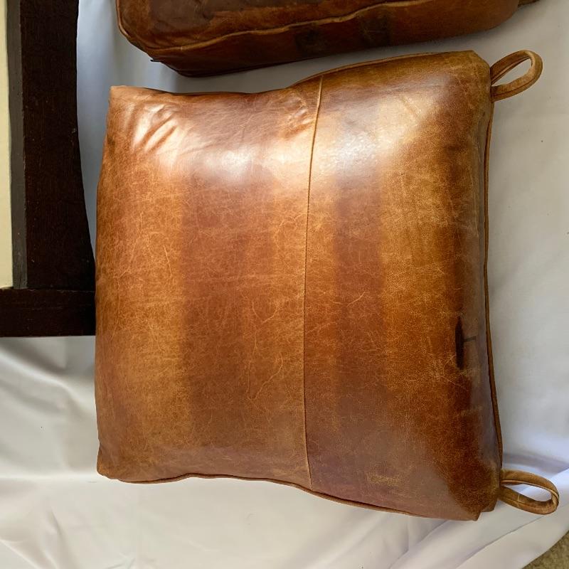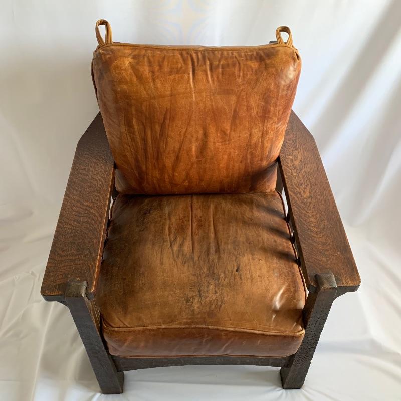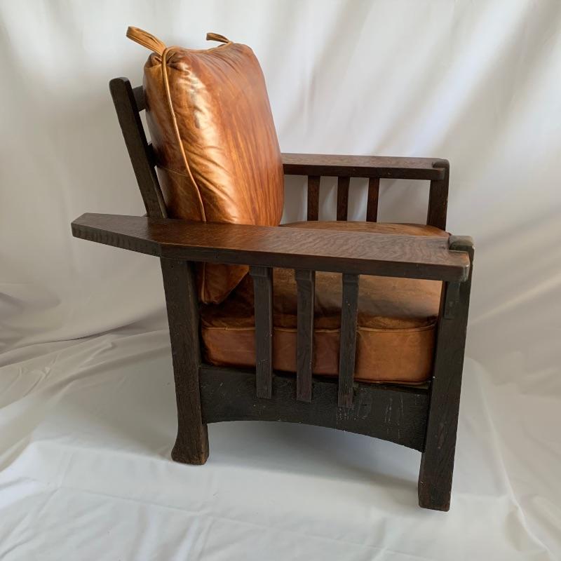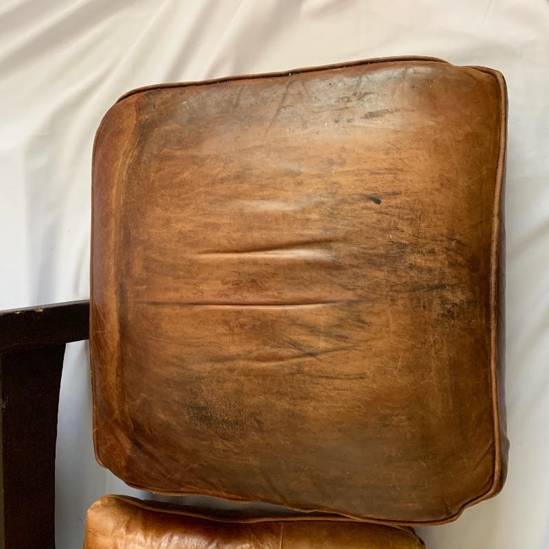 Leather club chair has removable cushions and an adjustable back. This chair is like an old friend it welcomes you to enjoy the great patina of the leather and the richness of the wood. Chair measures 31” x 31” x 36” with a 19.5” seat height.