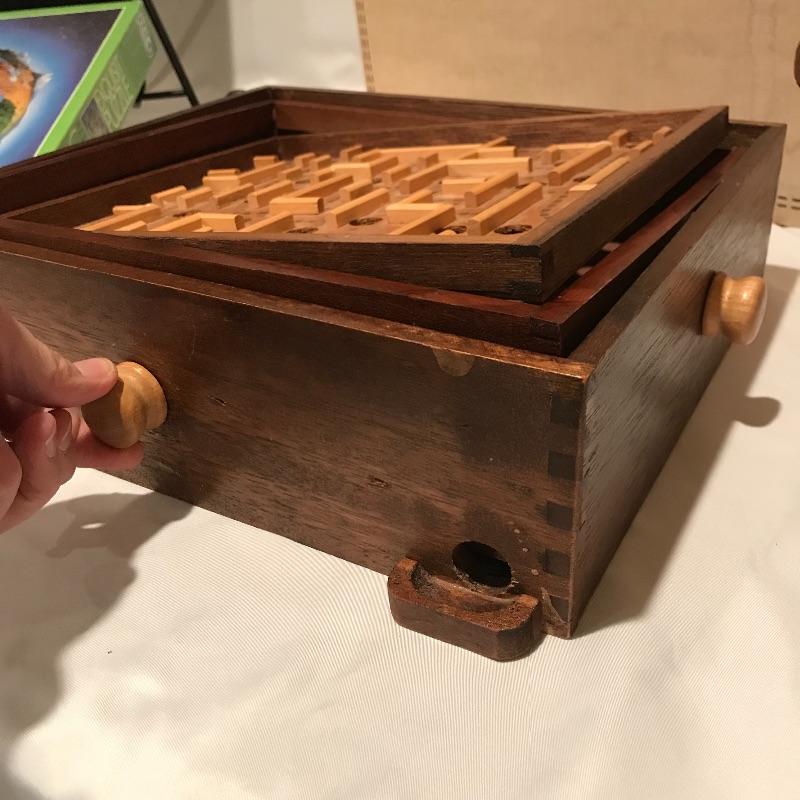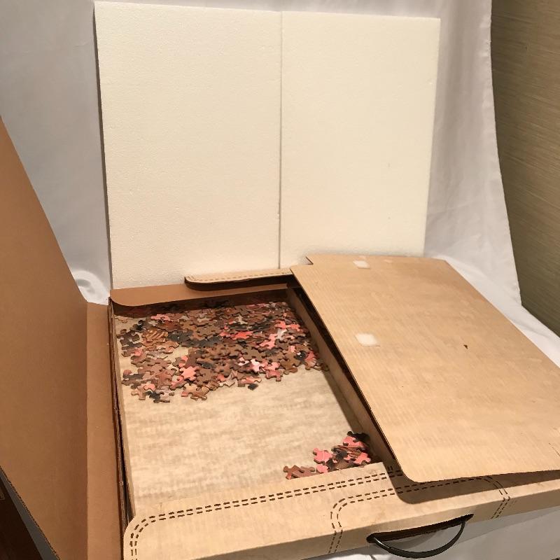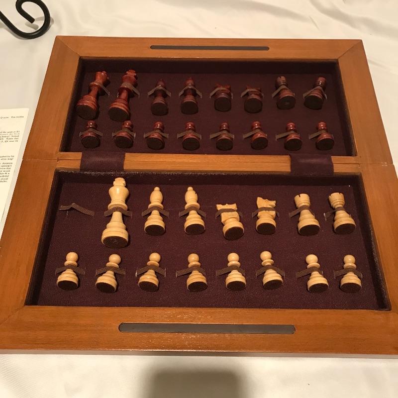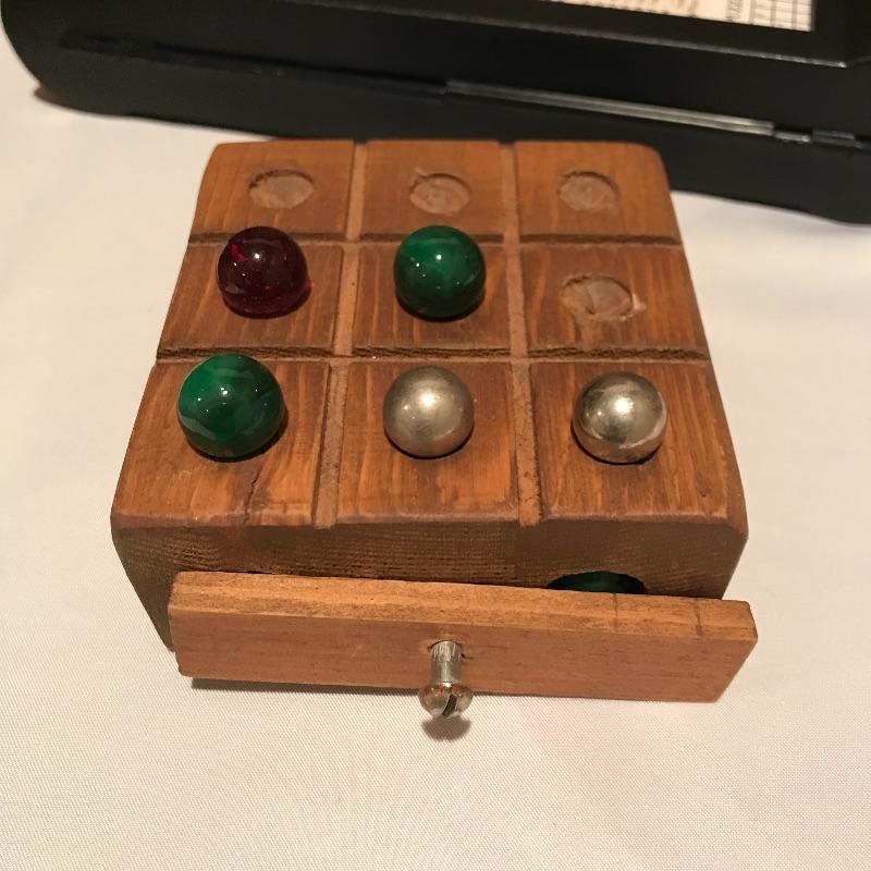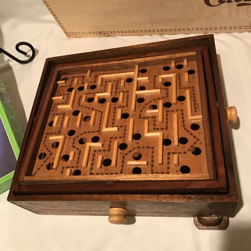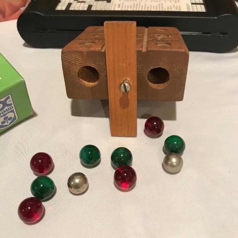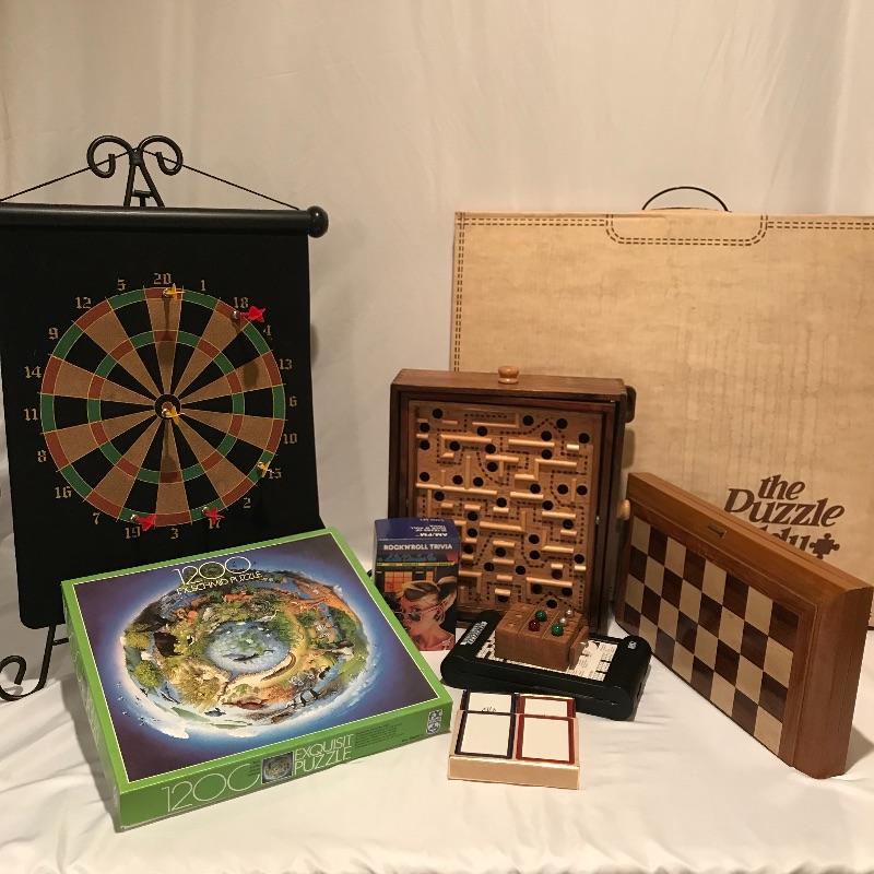 Fun filled lot with a little bit for everyone! A 1987 Rock “˜n’ Roll trivia game, a well crafted Chess board and pieces (missing one queen), wood marble games, a puzzle caddy with a possible cat themed puzzle inside and more! Magnetic darts and felt “board” appear to be heavy duty. Can not verify contents of all games and puzzle pieces. Puzzle Caddy box measures 21” x 25”. Corner of box has note saying “Max Puzzle Size 24 x 20” See photos. No shipping.