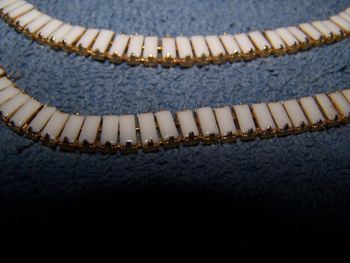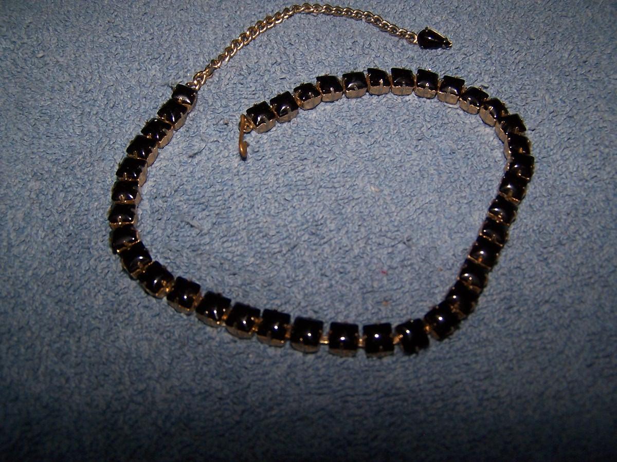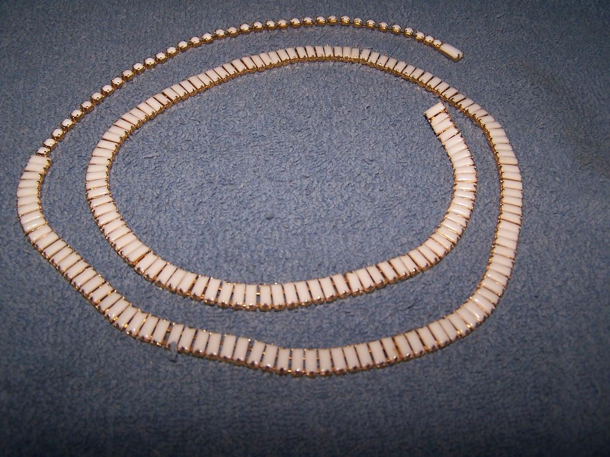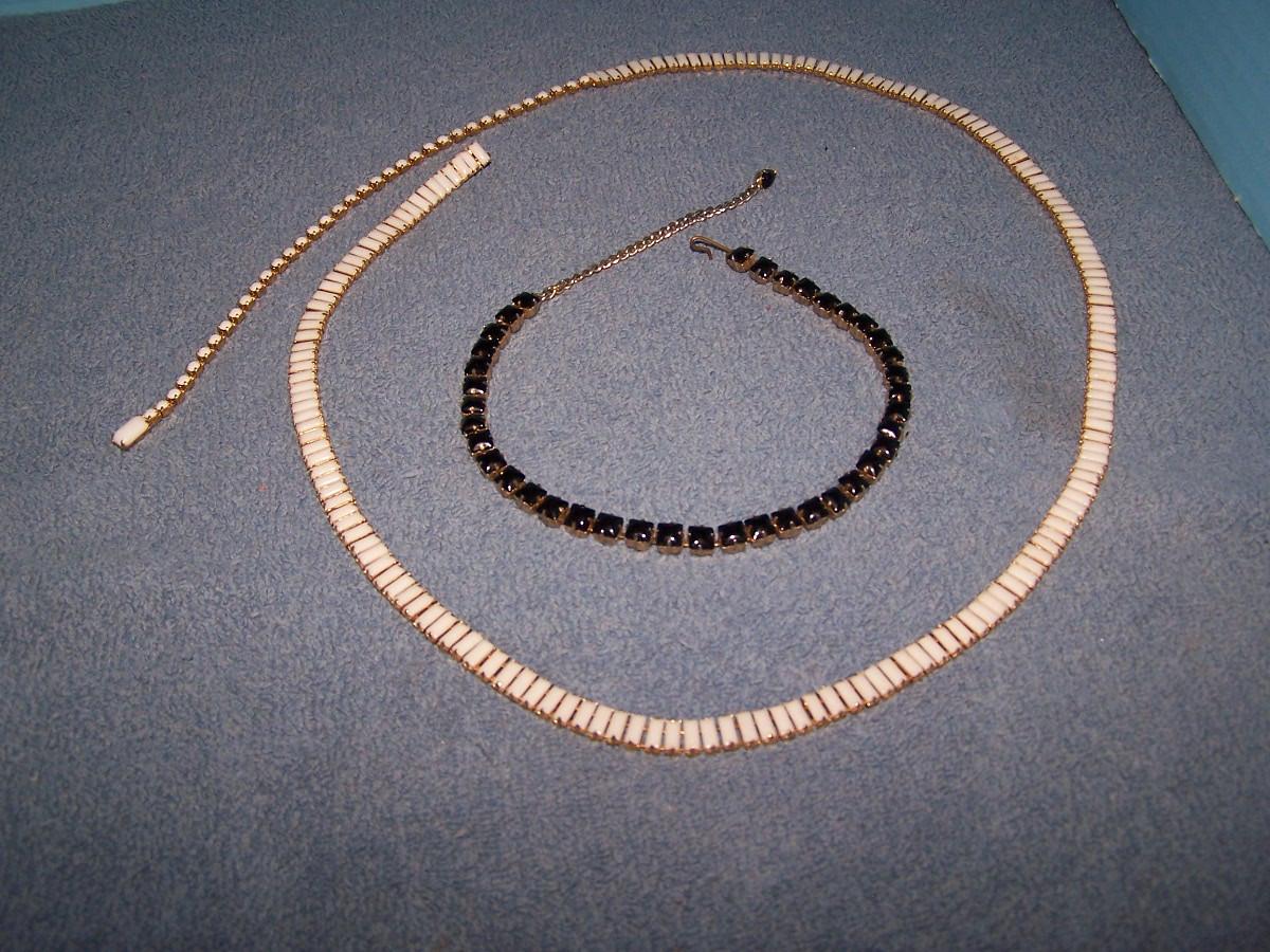 THESE ARE LOVELY VINTAGE RHINESTONE NECKLACES! UNMARKED. BLACK-15 1/2'' LONG. WHITE-36 1/2''-NECKLACE OR MAYBE A BELT??? SLIGHT WEAR.