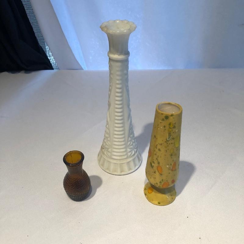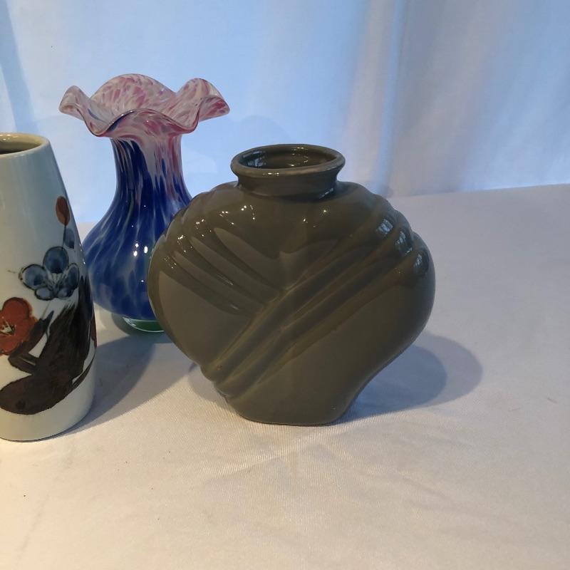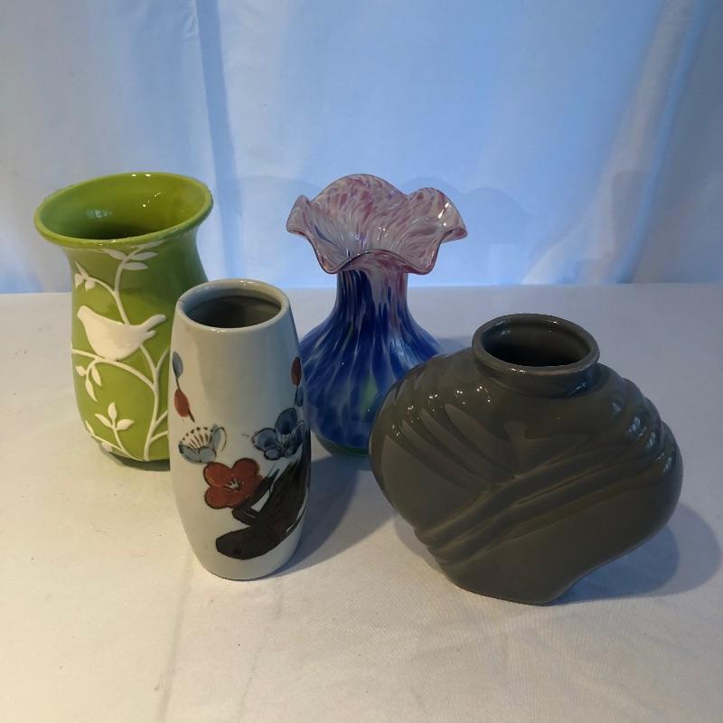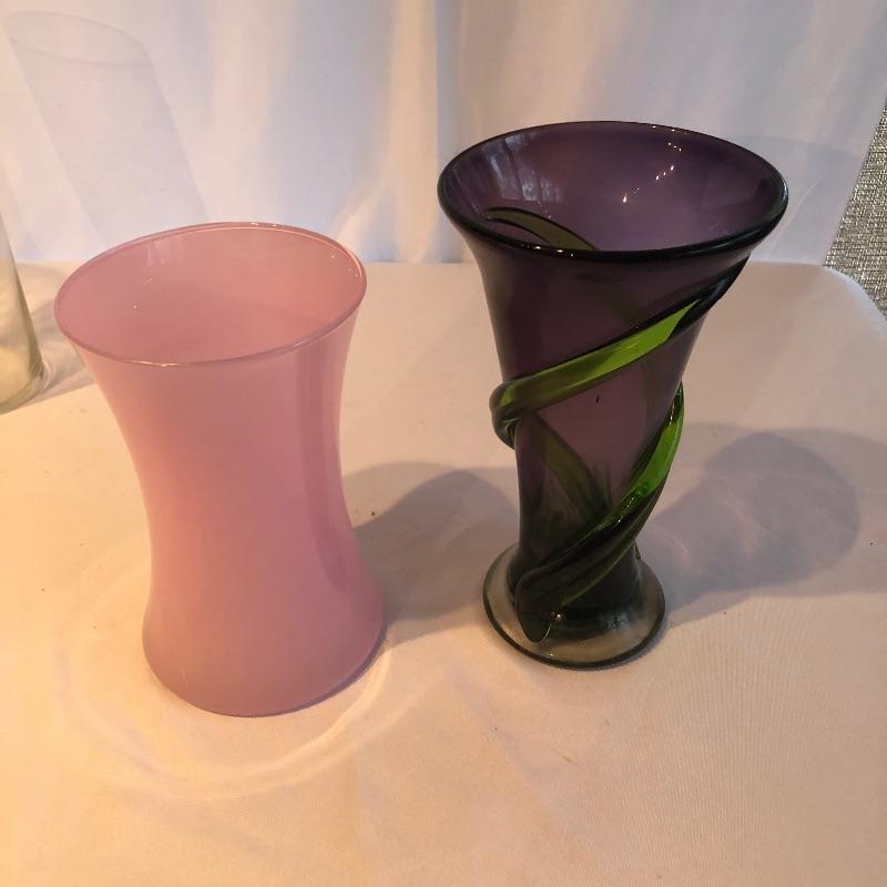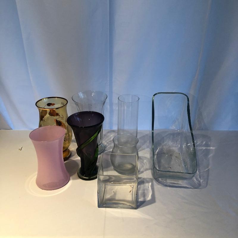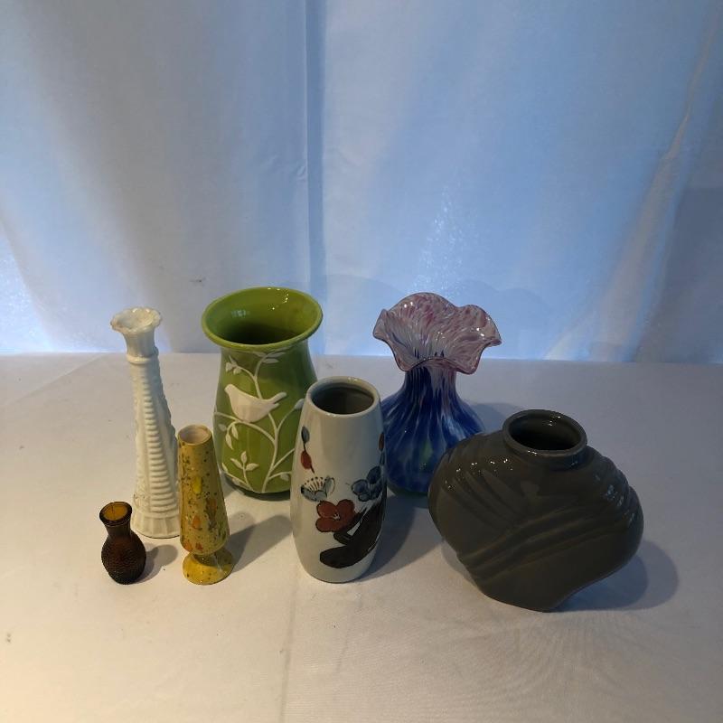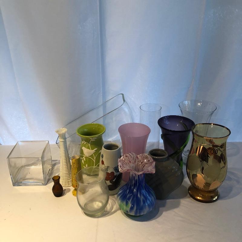 This lot contains a total of fifteen vases, all ranging in size, color, and material. No vase is like the other! If you love collecting vases or flowers, or if you’re just looking to decorate your home a little more, this lot is for you! From Milk glass to handblown glass there is a true array here. The largest vase, the half-circle glass one(that would be a great small terrarium, measures 6” wide x 11” deep x 10.5” tall if you’re looking at it from the front. Local pickup only.