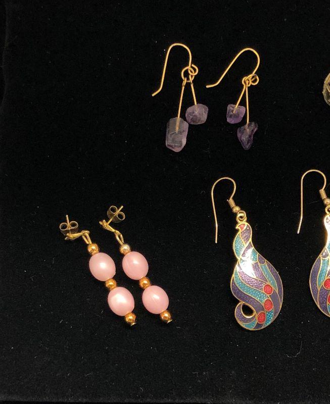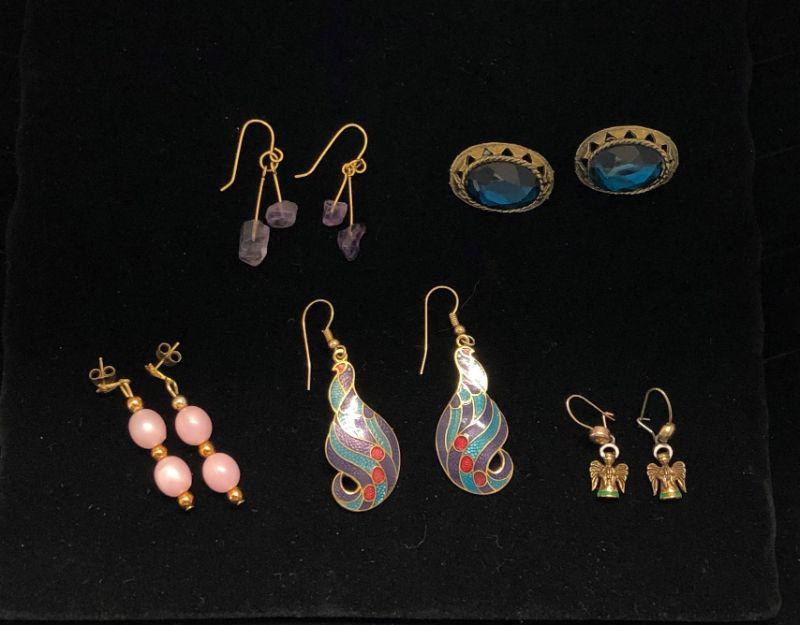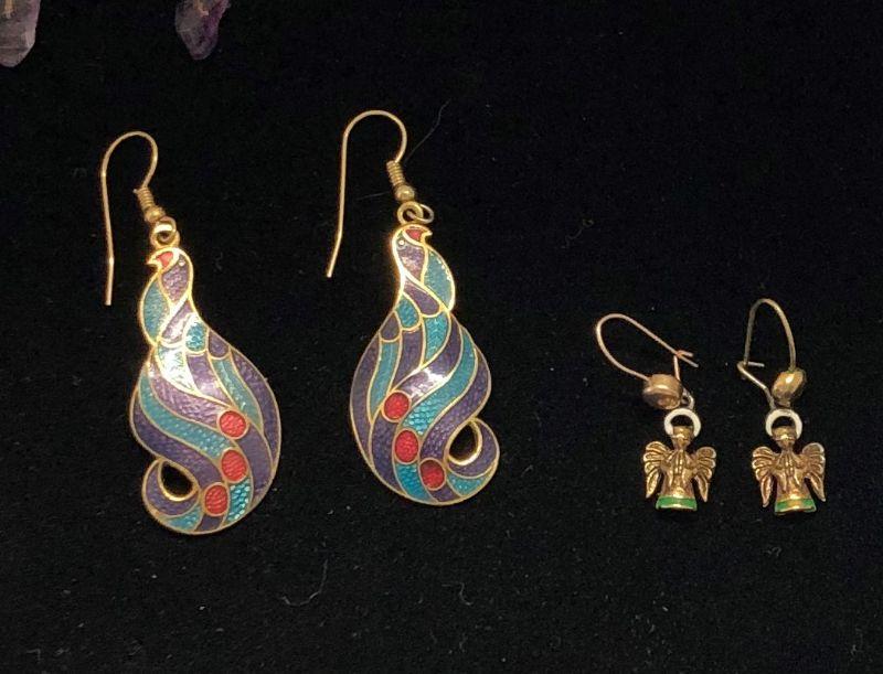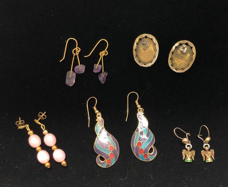 None of the earrings have maker's marks. The pink earrings appear to be plastic beads, the large oval earrings have a dark green center (the pictures make it look a little lighter), the longer multi-color earrings are an enamel paint, and the angels have white enamel halos and green enamel skirts. The purple dangle earrings do appear to be a purple stone.