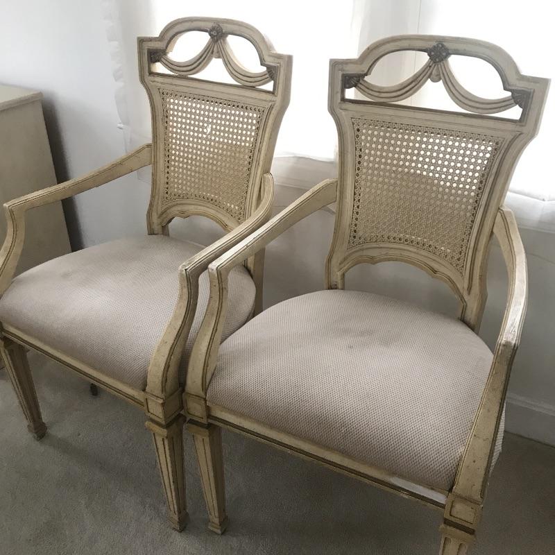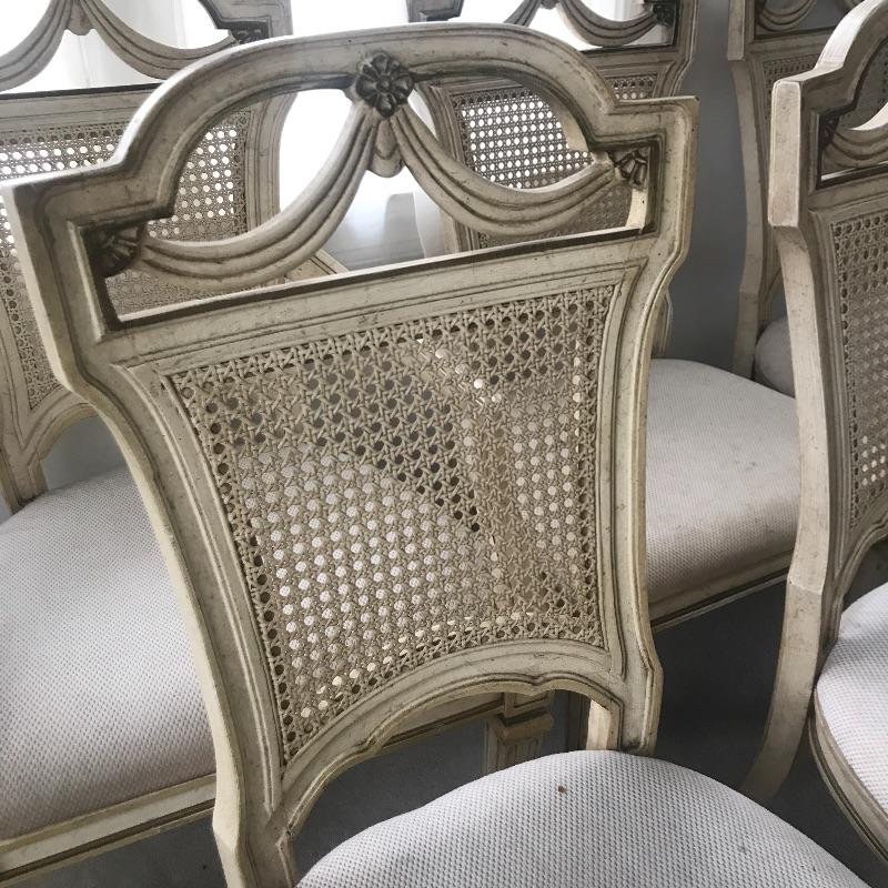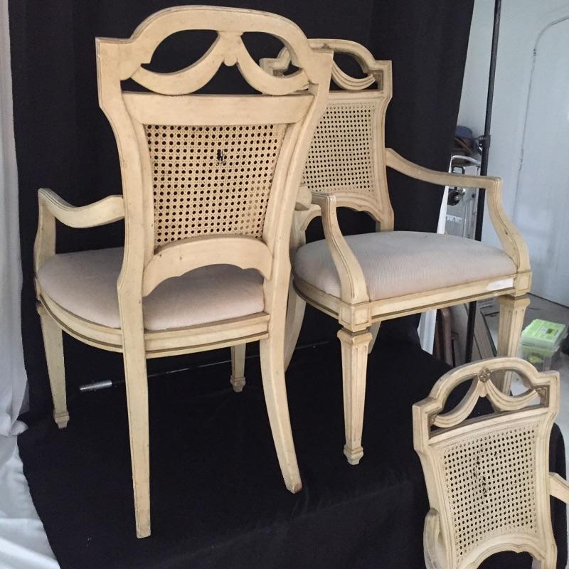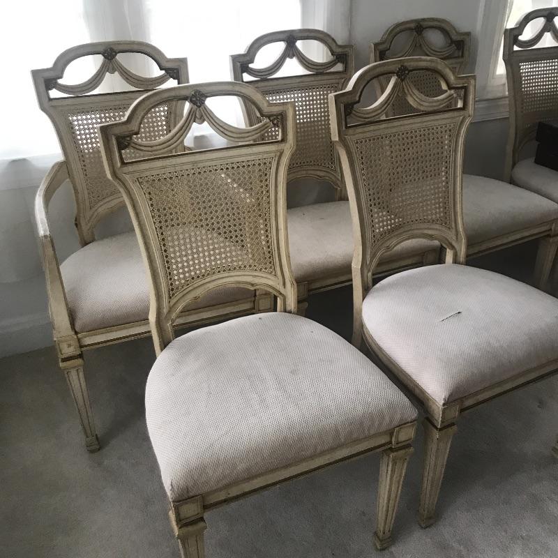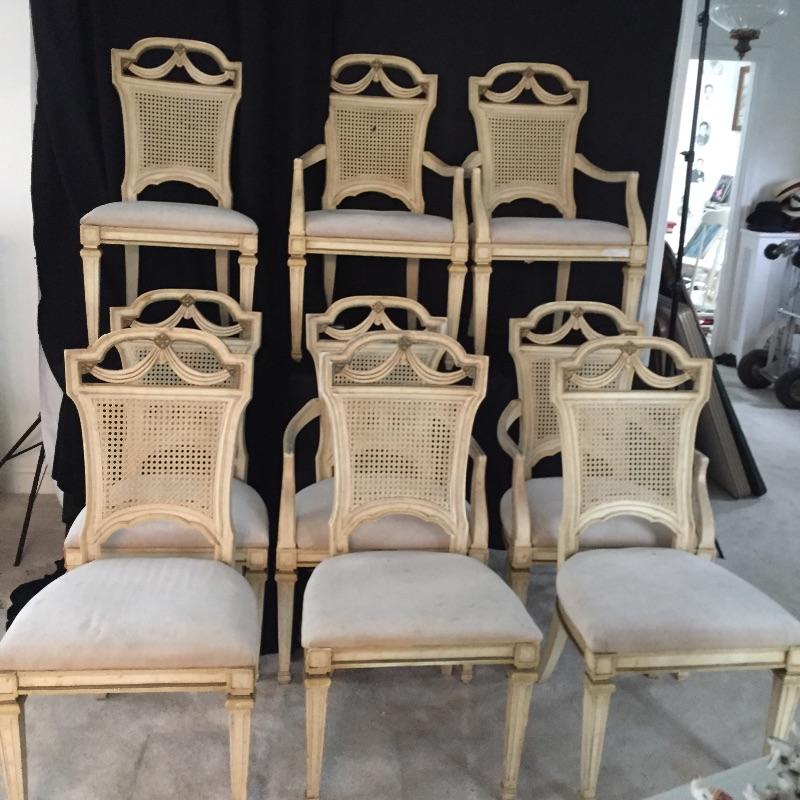 Lovely set of nine Cane back chairs with upholstered seats. Four chairs are captains chairs, five do not have arms. This is a great set for tour dining room. Change the upholstery to complete the look. Two of the chairs with arms have damage on cane. Two chairs have rip in upholstery. Chairs with arms measure 22” x 18” x 38”. 17” seat height. Chairs without arms measure 20” x 18” x 38”. 17” seat height. Color of wood is beige with yellow tint and beige fabric. Local Pickup Only