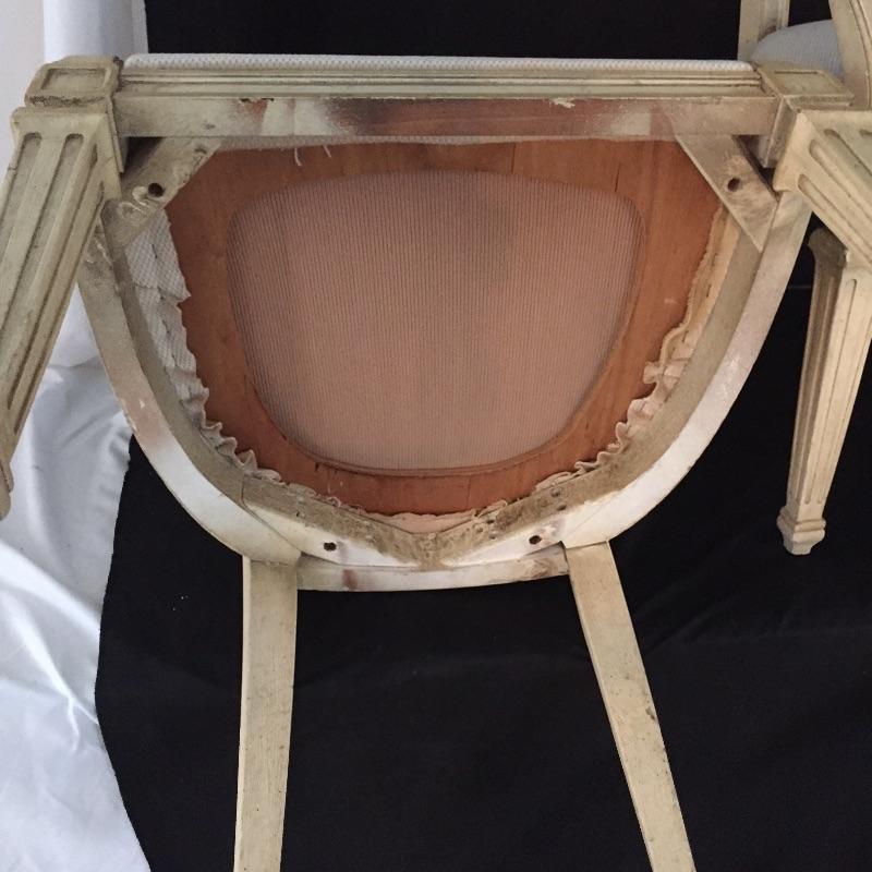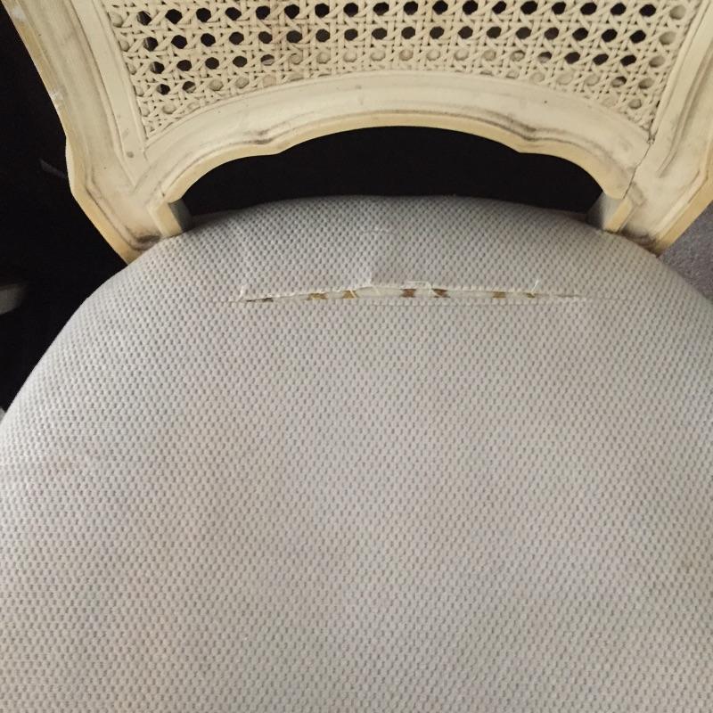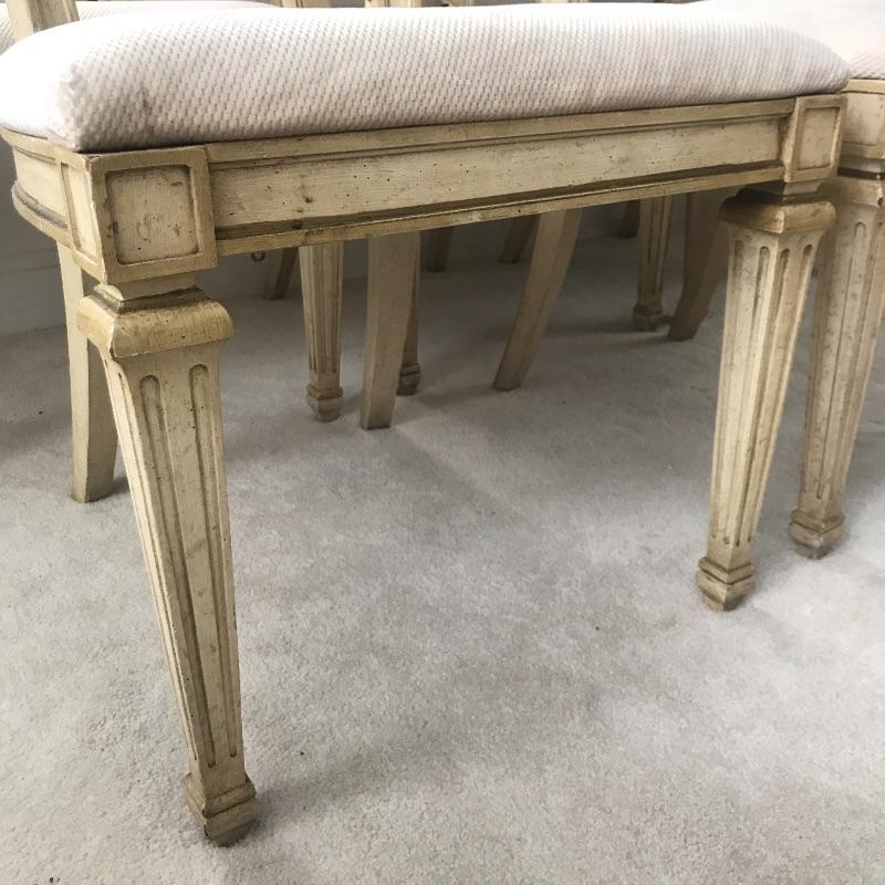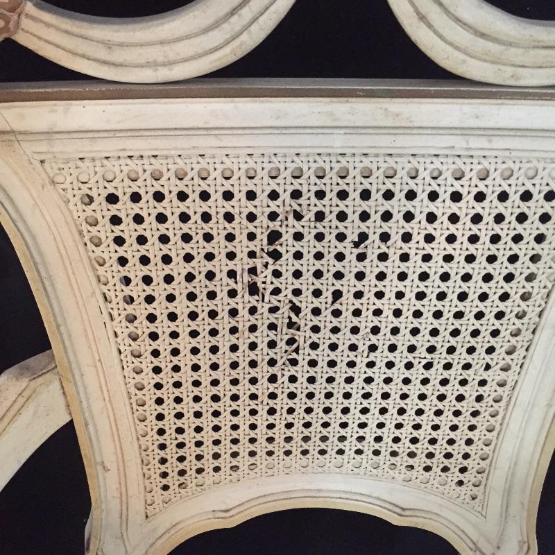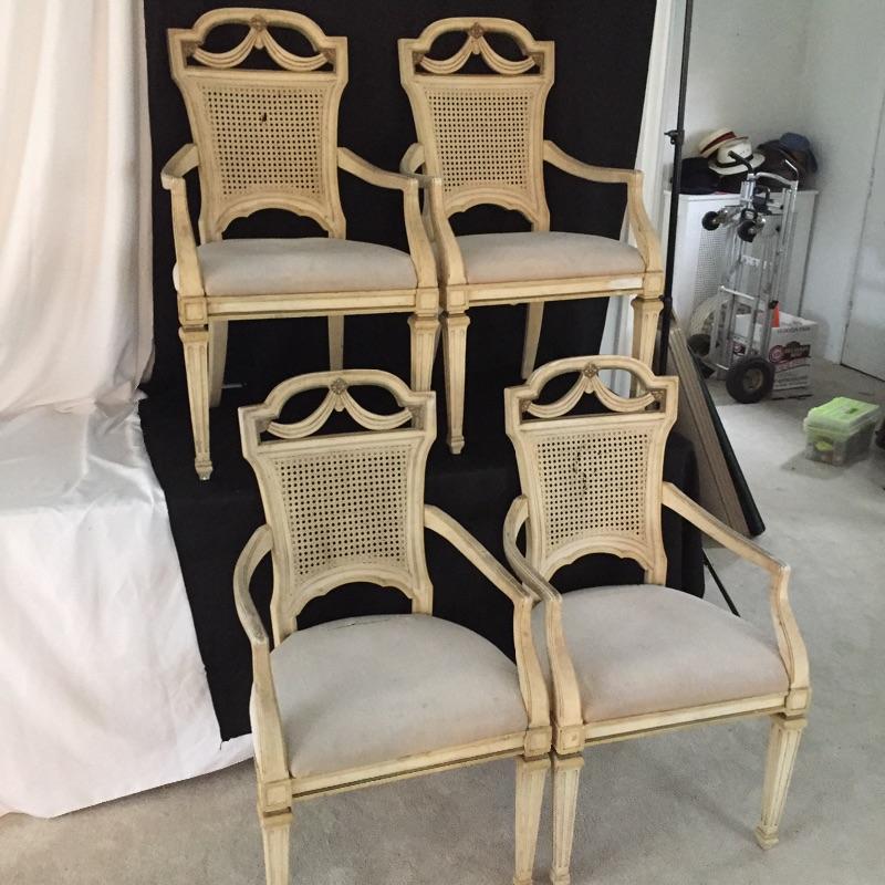 Lovely set of nine Cane back chairs with upholstered seats. Four chairs are captains chairs, five do not have arms. This is a great set for tour dining room. Change the upholstery to complete the look. Two of the chairs with arms have damage on cane. Two chairs have rip in upholstery. Chairs with arms measure 22” x 18” x 38”. 17” seat height. Chairs without arms measure 20” x 18” x 38”. 17” seat height. Color of wood is beige with yellow tint and beige fabric. Local Pickup Only