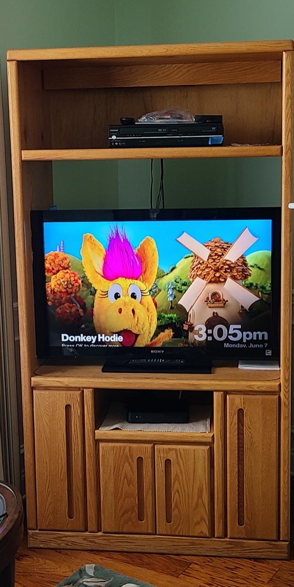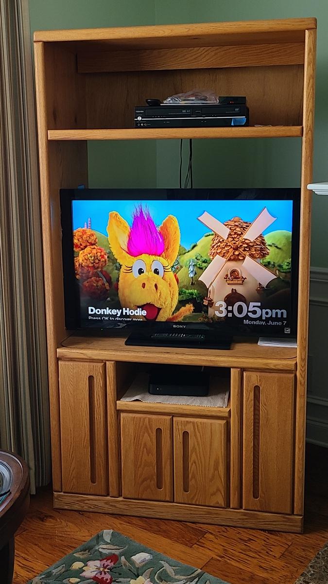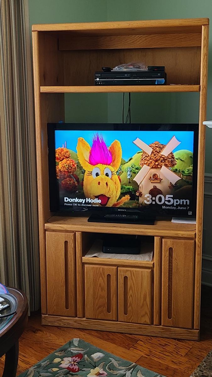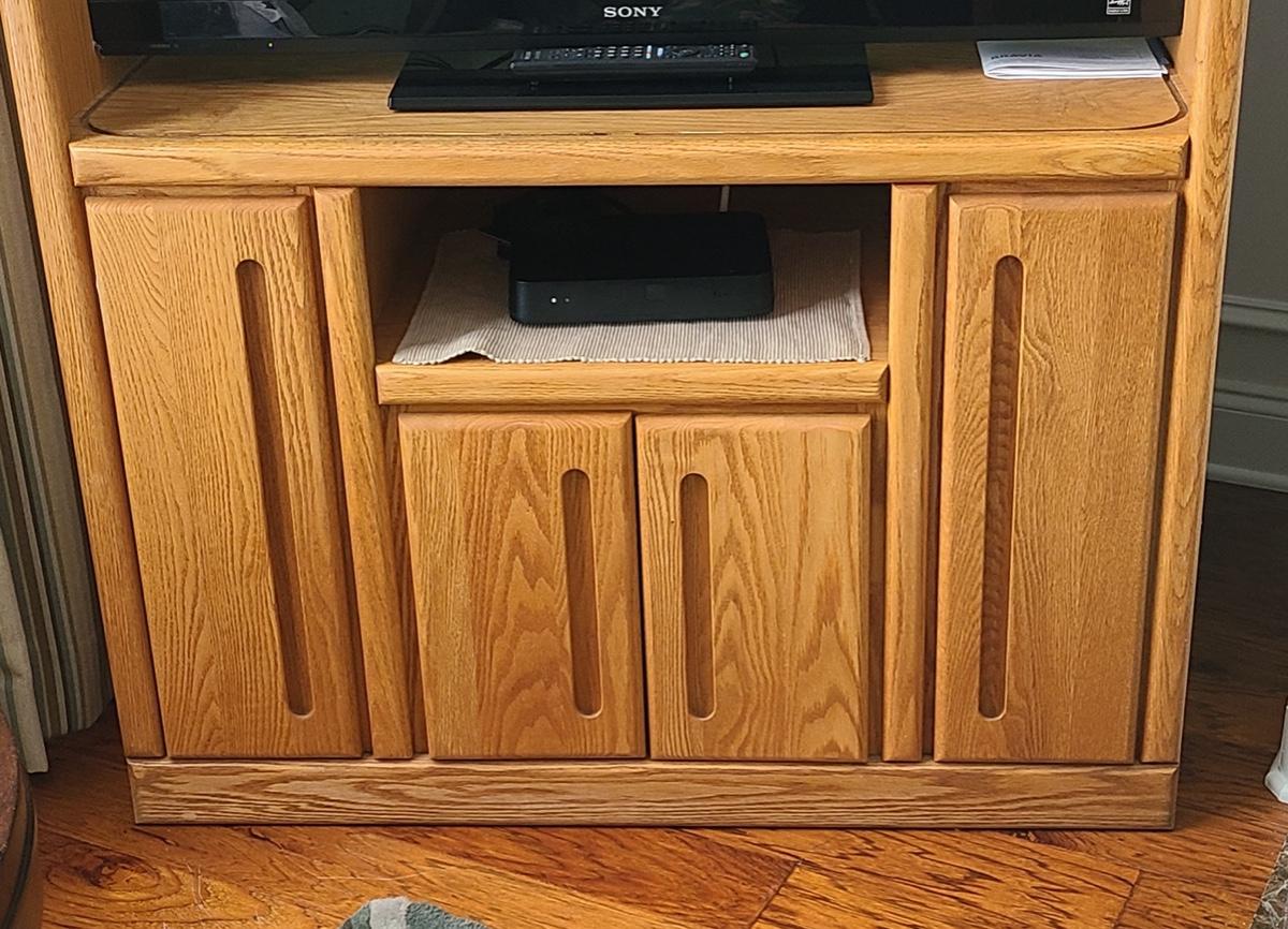 Oak Media Cabinet. TV and accessories not included, only the cabinet. 40x22x75. Please see all pictures for content of the lot, condition of the lot, and measurements if taken. Pictures are the best representation of the items listed and items are untested unless indicated in description. Thank you for looking and have fun bidding!