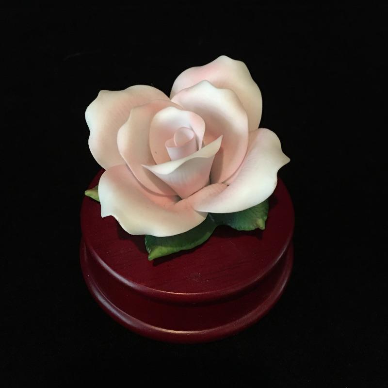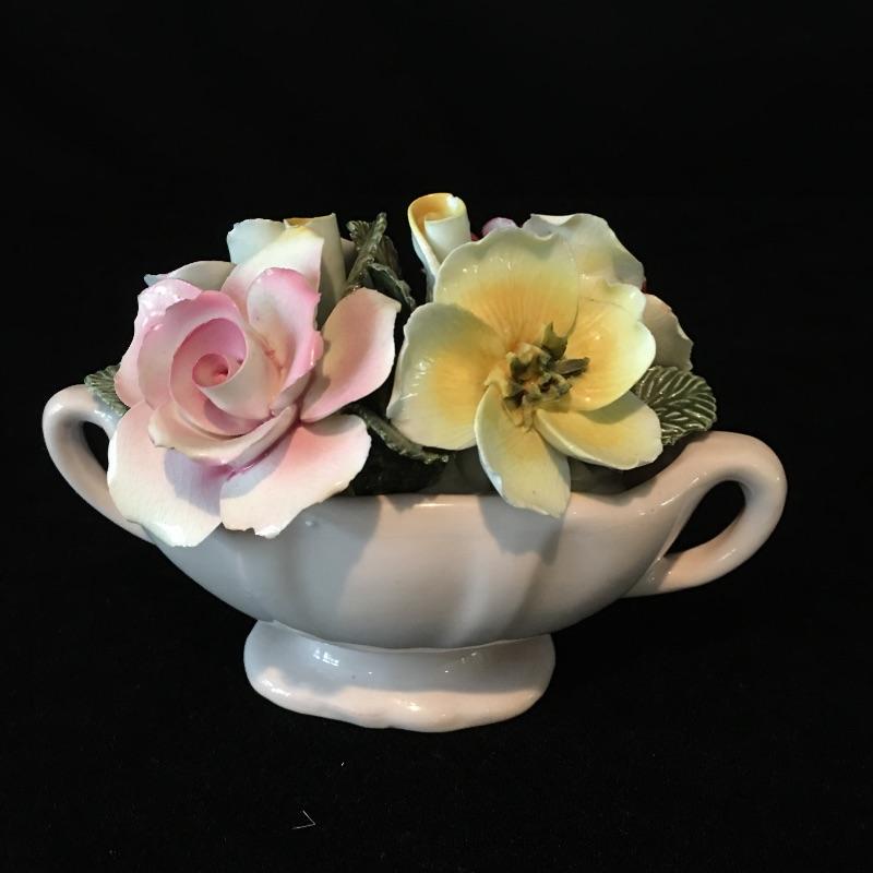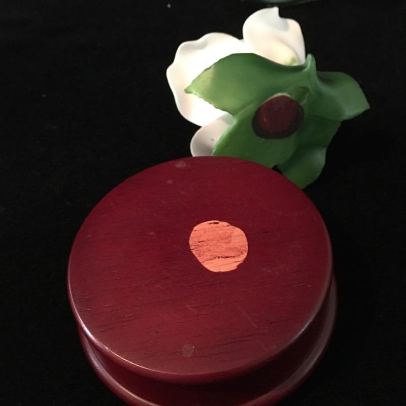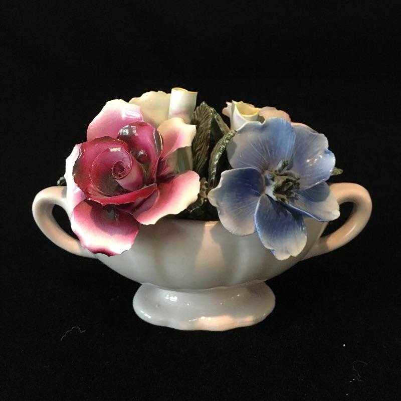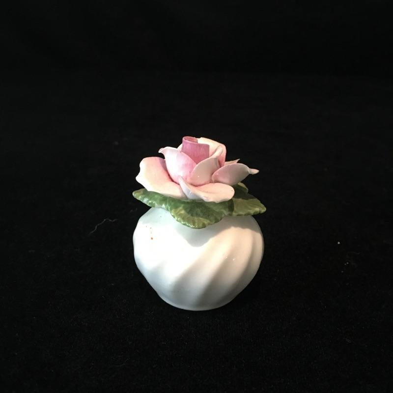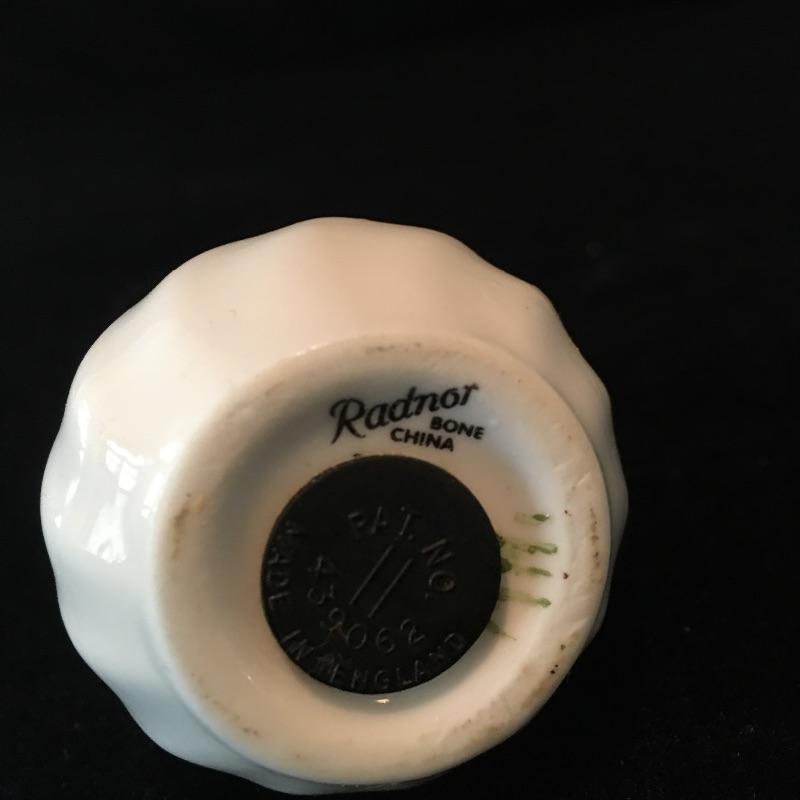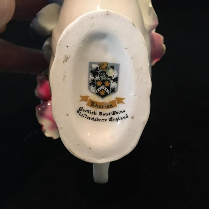 Porcelain flowers includes musical stand, Thorley bone China, Radnor bone China, bell that has chips and rose that is unmarked. Rose has separated from musical base, see pictures. Musical base and rose measure 4”D x 3.5” tall.