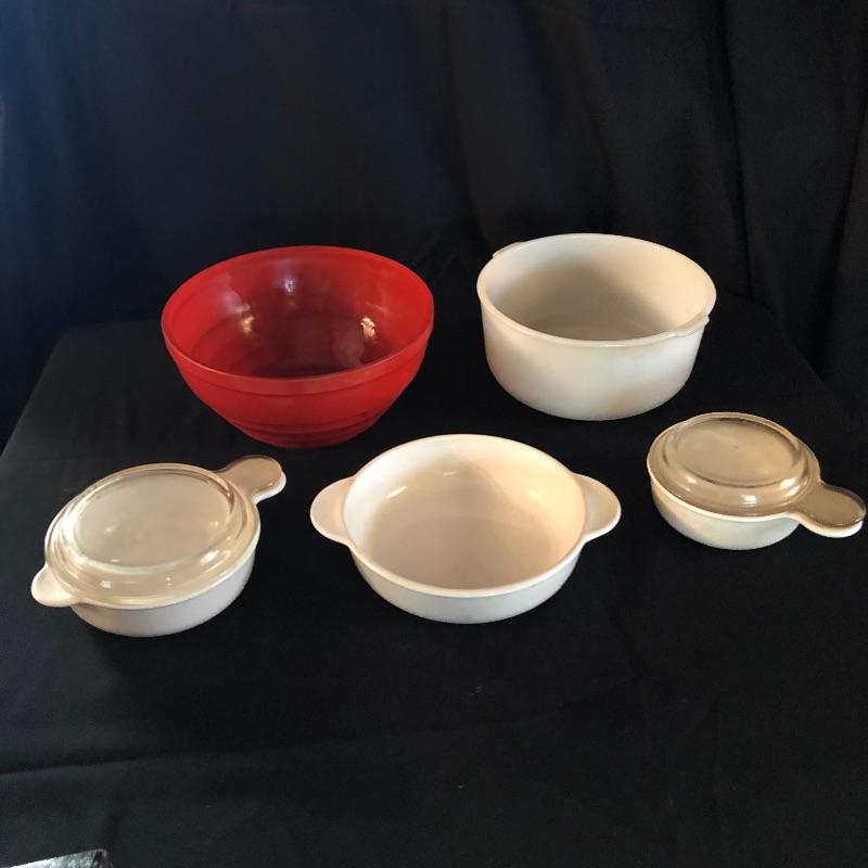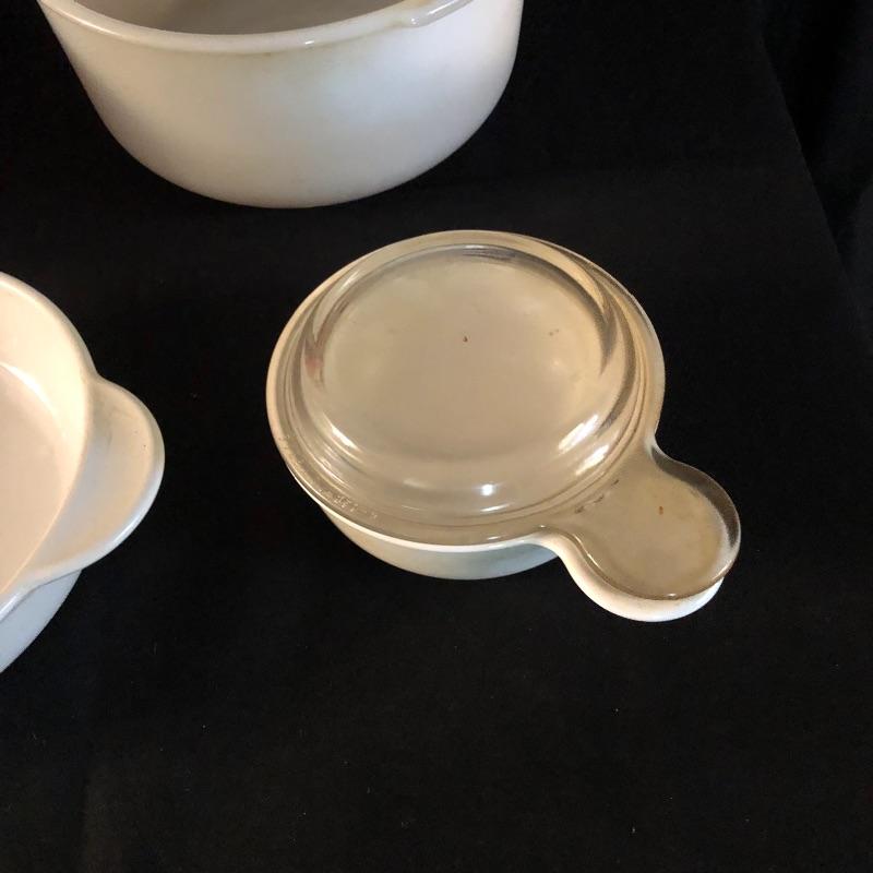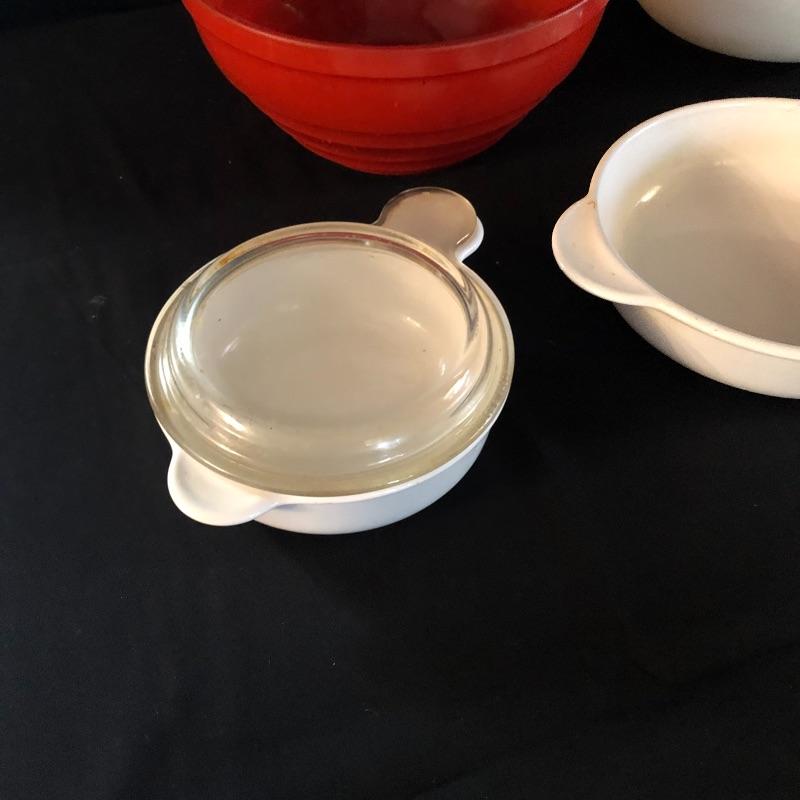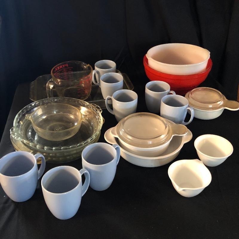 This lot includes a little of Pyrex, Corning Ware, and Corelle! The Pyrex consists of the four cup measuring cup, the three quart glass casserole dish, three pie pans, and the small Pyrex dish. The Corelle includes eight pale blue cups, a small white sugar bowl, and pitcher. The large white mixing bowl is a Glasbake made for Sunbeam. This lot also includes a red mixing bowl and three white bowls with handles with two having glass lids. These appear to be Corning. Local pickup only.